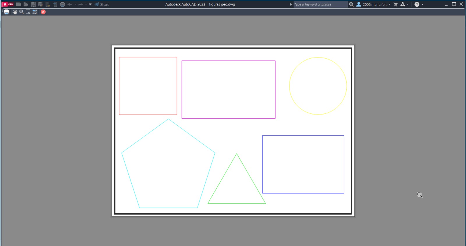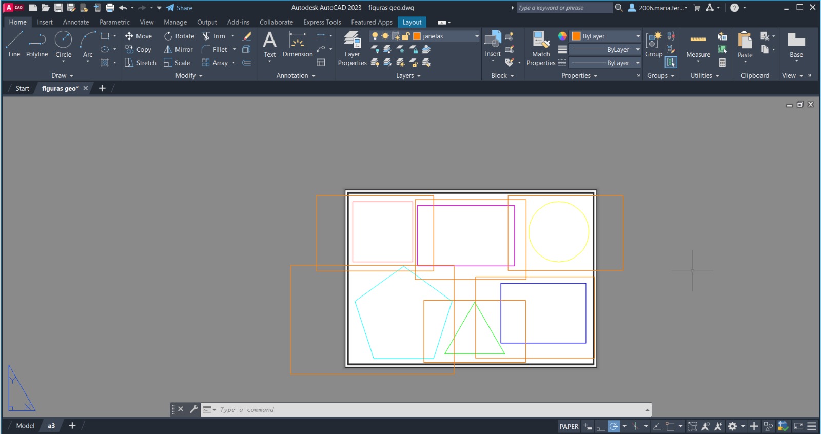 Continuação do trabalho das figuras geométricas no Autocad. Trabalho nas layers para que ficasse visível só uma figura. Em seguida usámos a ferramente de zoom 1/10xp para colocar a figura á escala. Por ultimo usámos a ferramenta "copy", as layers e a ferramente "move" para termos todas as figuaras visíveis e não sobrepostas.