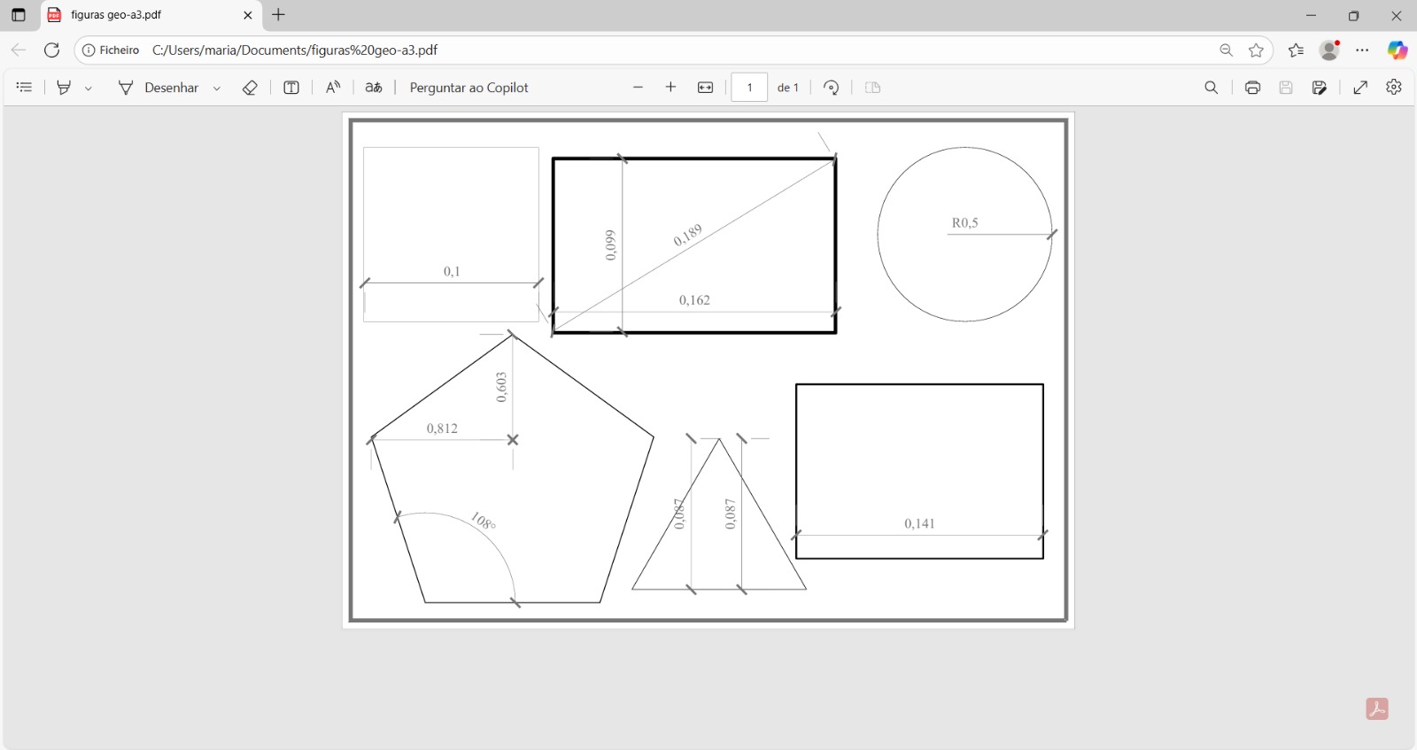 Concluímos o trabalho legendando as figuras e através da ferramenta "dim" marcamos as suas medidas. Alteramos também a espessura das linhas, consoante as cores usadas.