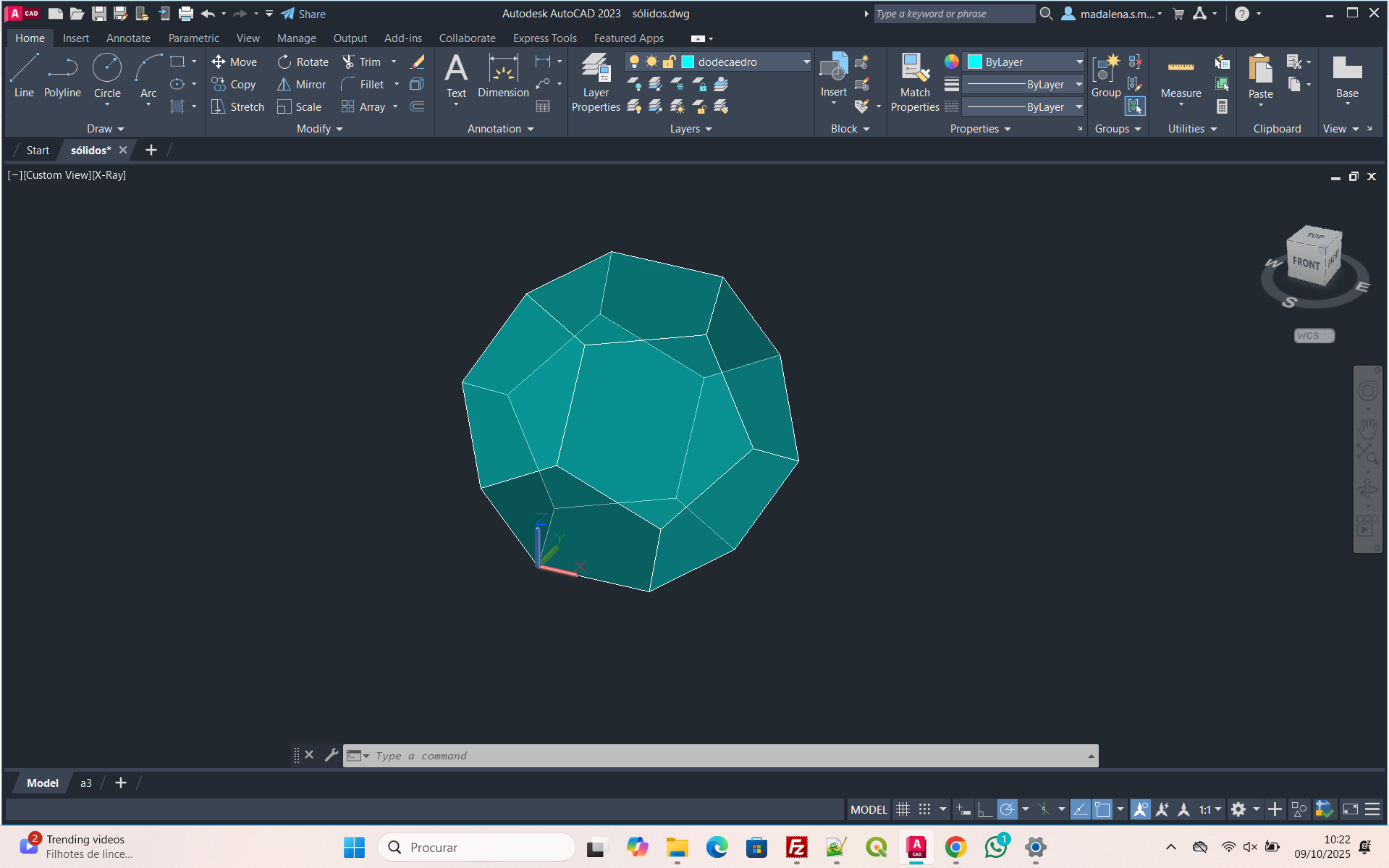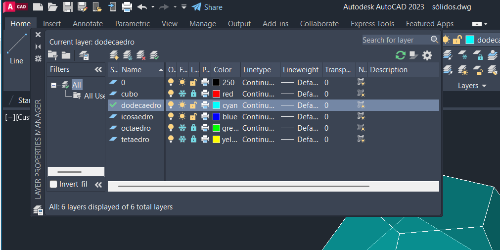 Começamos por criar 5 layers, assim como aparece na primeira foto. De seguida usamos cada uma das layers para desenhar os diferentes sólidos geométricos.