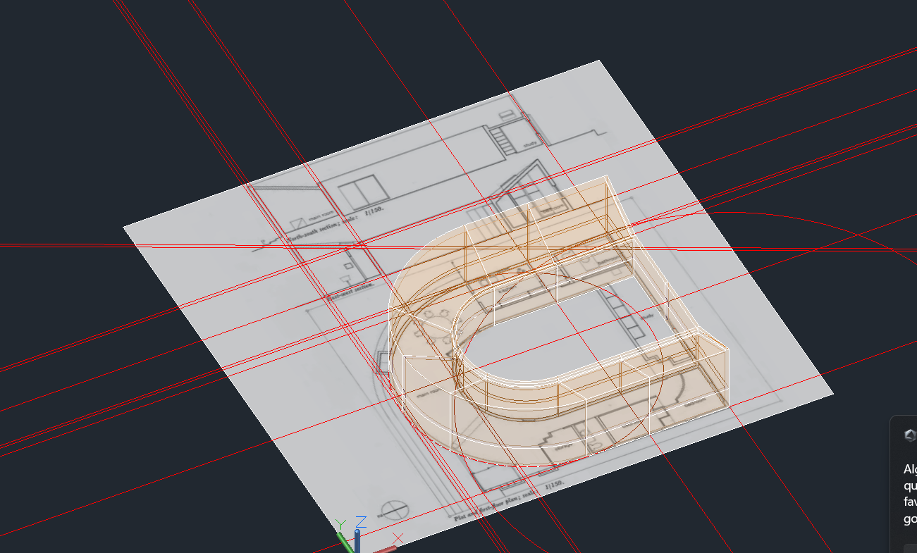 De seguida, criação 3D da planta da uhouse do Arquiteto Toyo Ito, através de alguns comandos, como o extrude para dar tridimensionalidade a uma figura plana; 3dpoly e box, além de comandos tipicamente usados como xline, offset e pline. Fizemos também dois cortes da mesma, um transversal e um longitudinal.