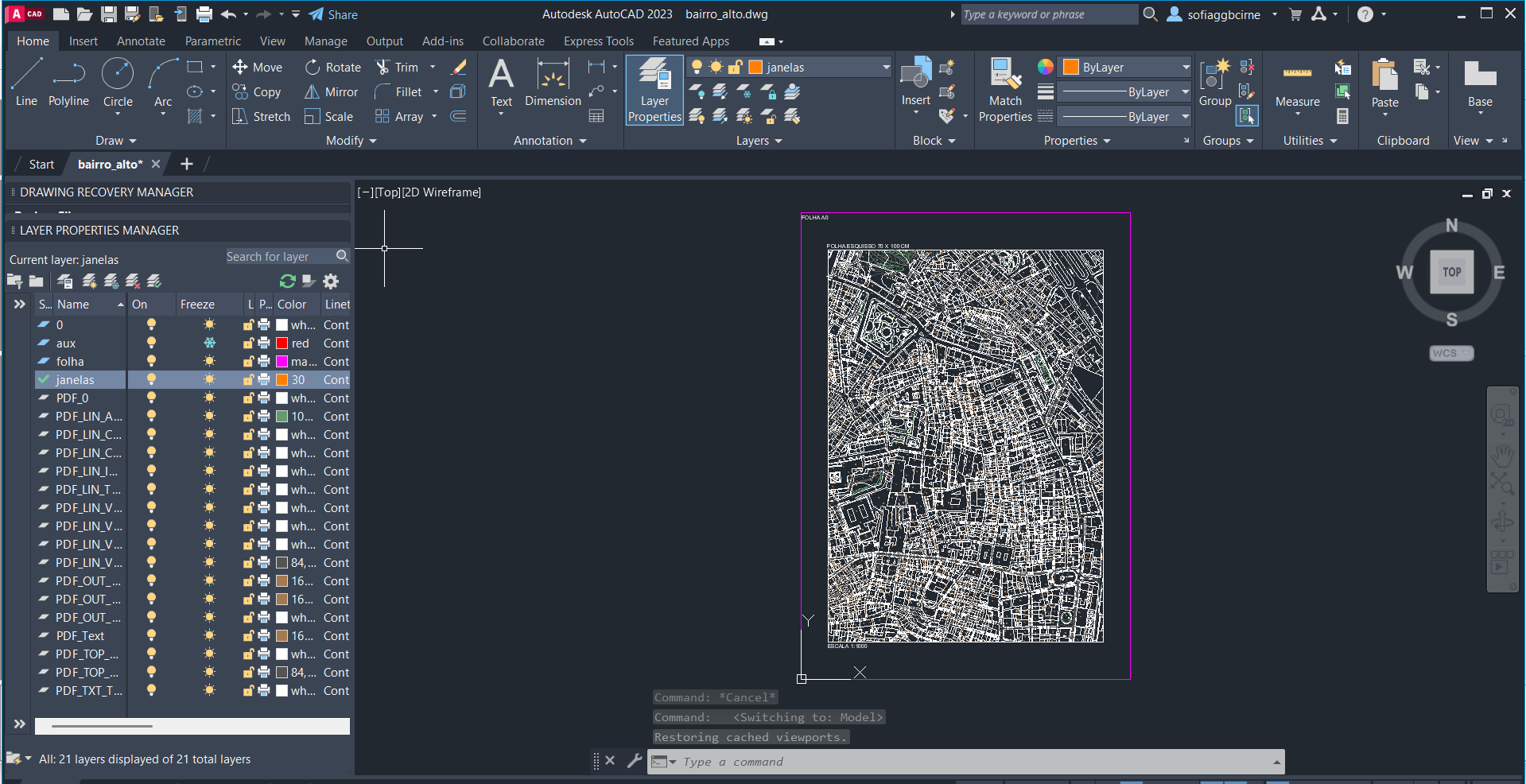 Com Import, importámos a planta para o AutoCAD. Em alternativa, pode-se também arrastar o ficheiro. Como o ficheiro que importámos, apesar de o indicar, não estava enquadrado numa folha A0, surgiu por isso a necessidade de criar com RECTANG um retângulo com tamanho de um A0.