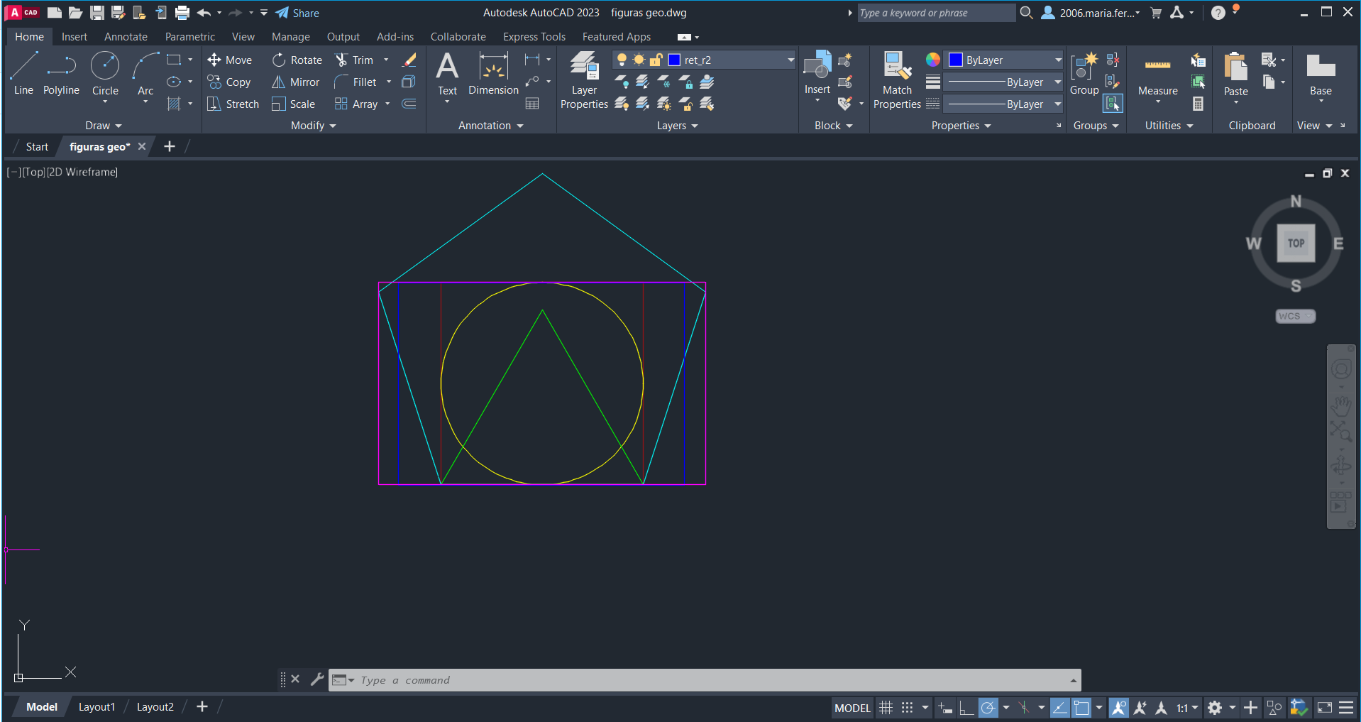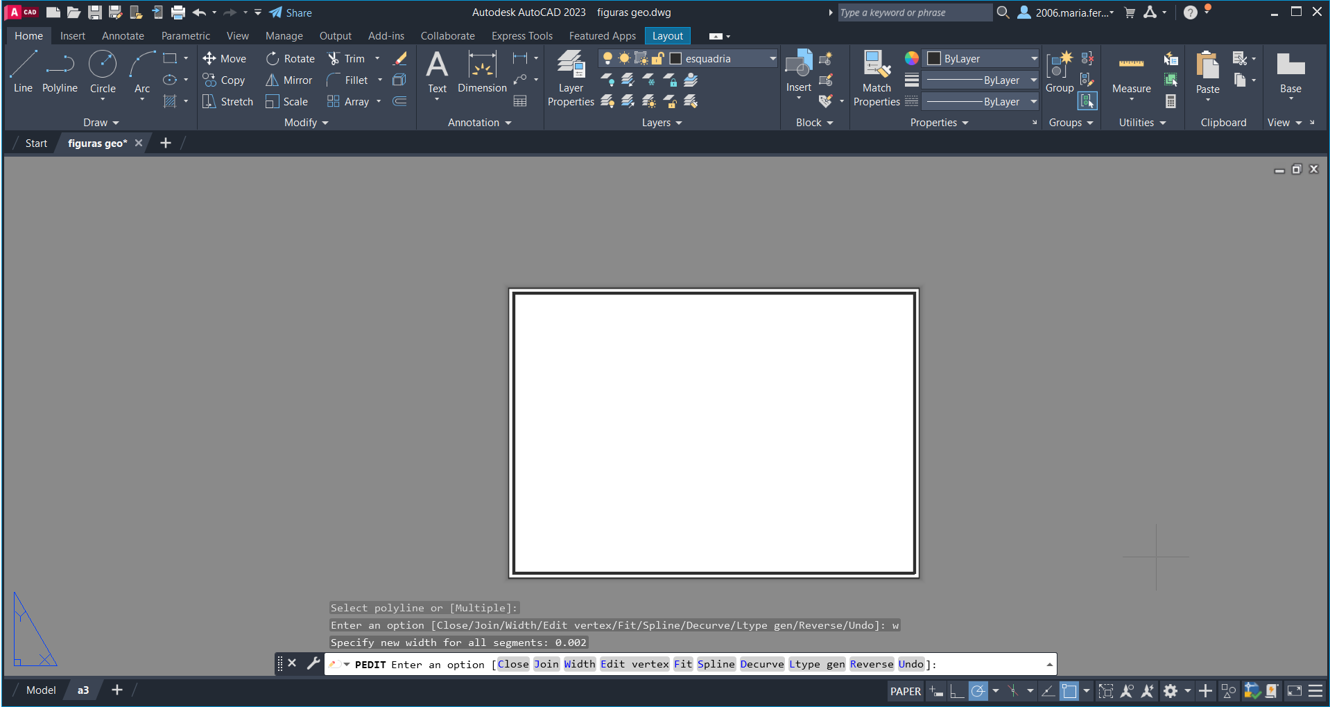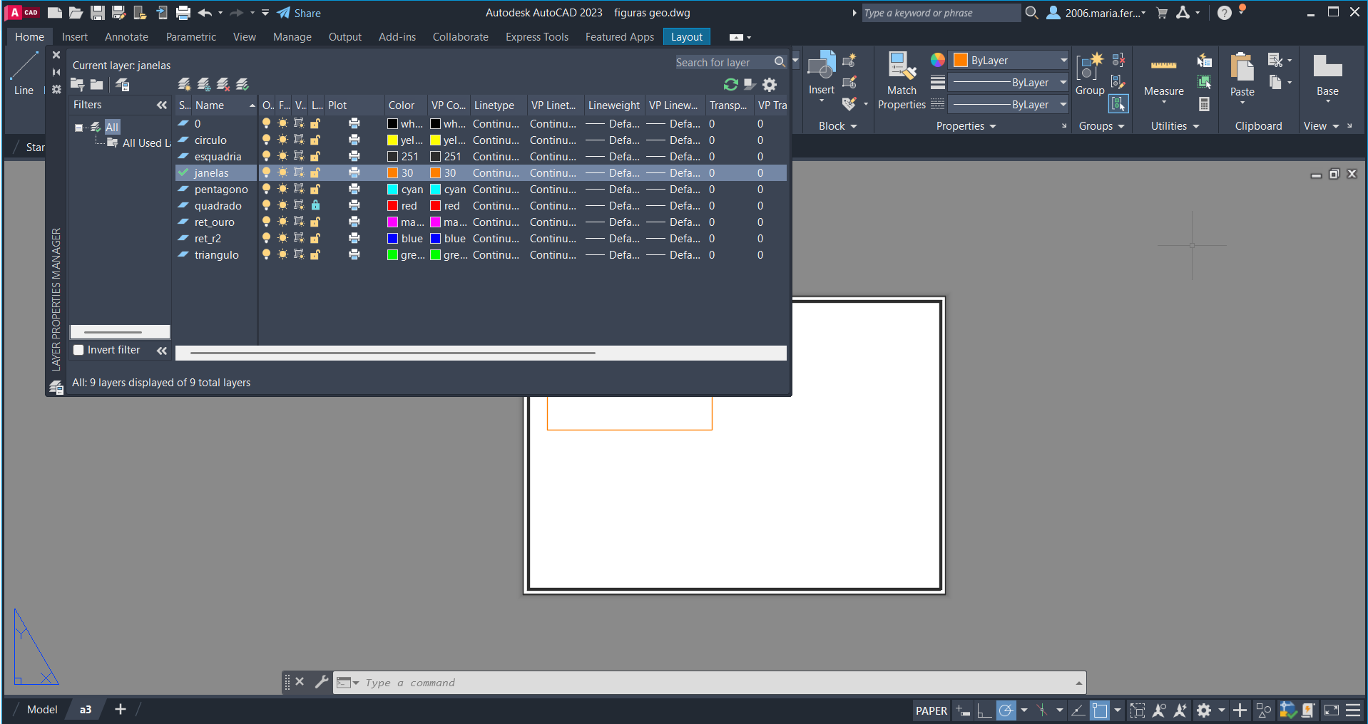 Continuação do trabalho das figuras geométricas no Autocad, criação de uma folha A3 e de uma nova layer no mesmo programa.