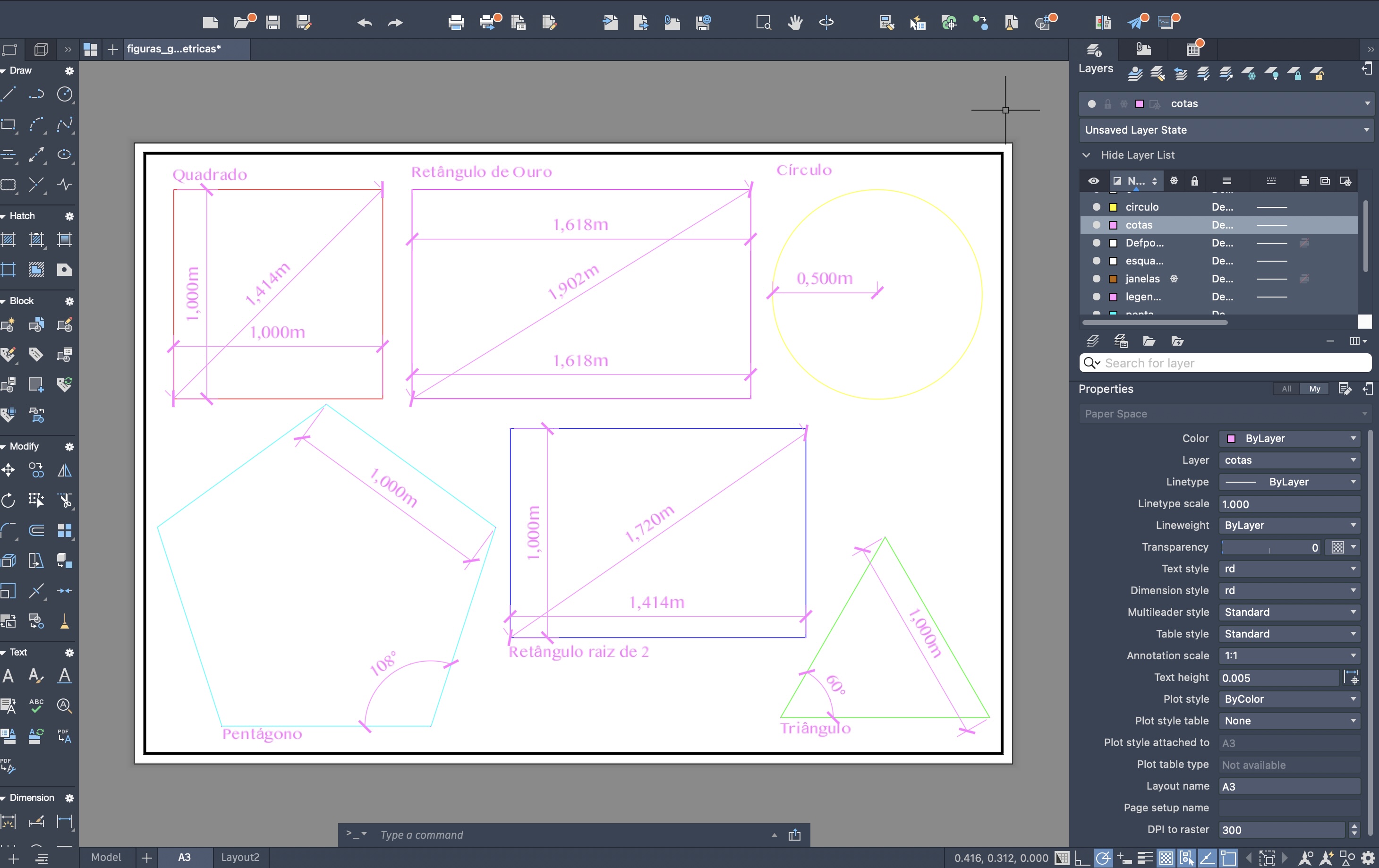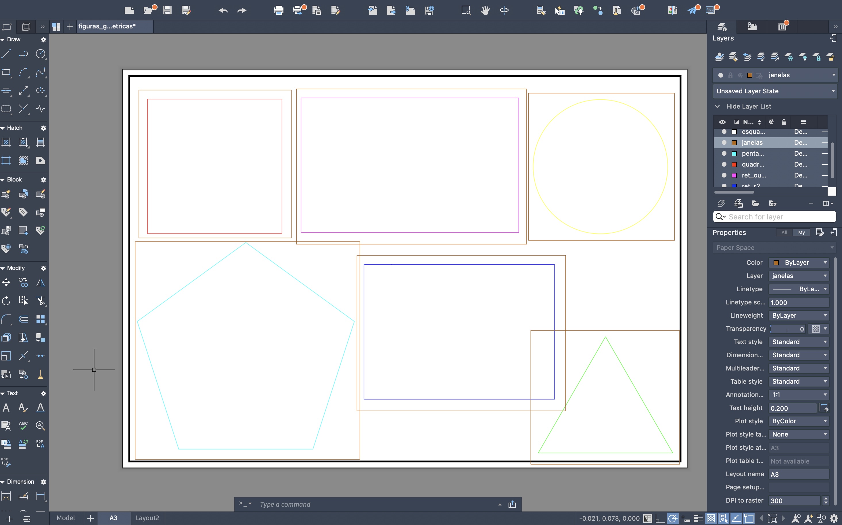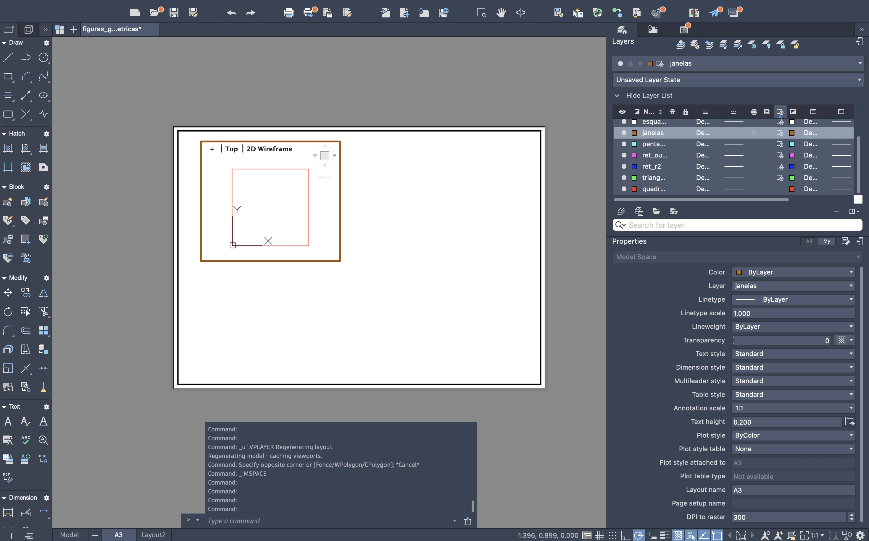 Criação de uma nova layer, denominada "janelas", para a colocação e organização das figuras geométricas no layout A3, anteriormente criado.