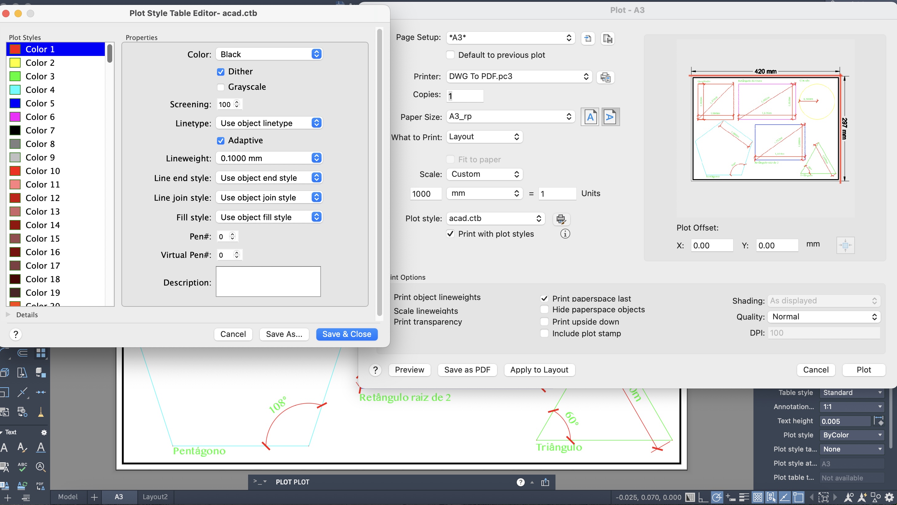 Alteração da espessura das linhas, texto e cotas. Observação da preview em pdf, posteriormente guardadanum num ficheiro pdf.