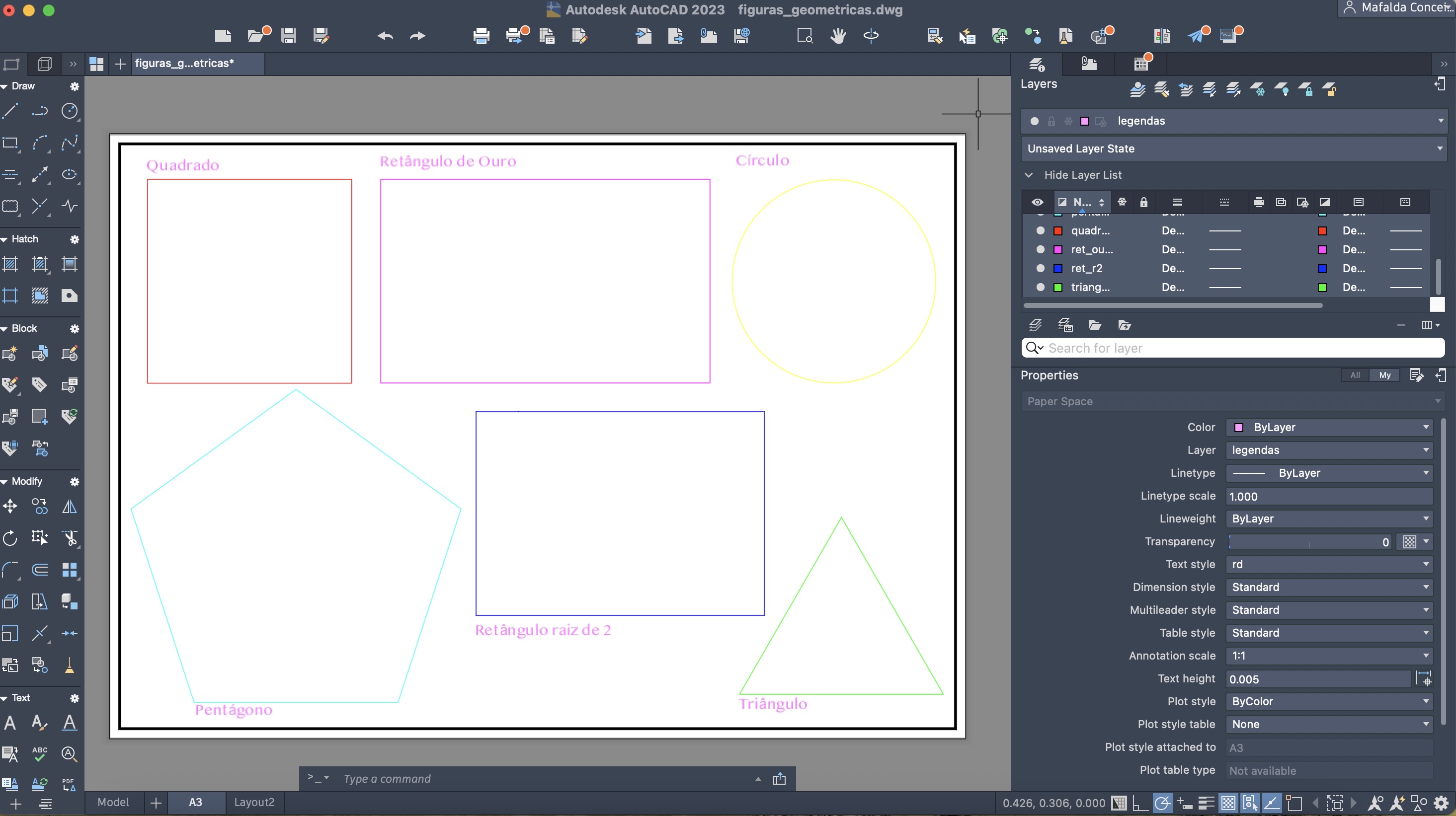 Conclusão do exercício das figuras geométricas no AutoCAD.