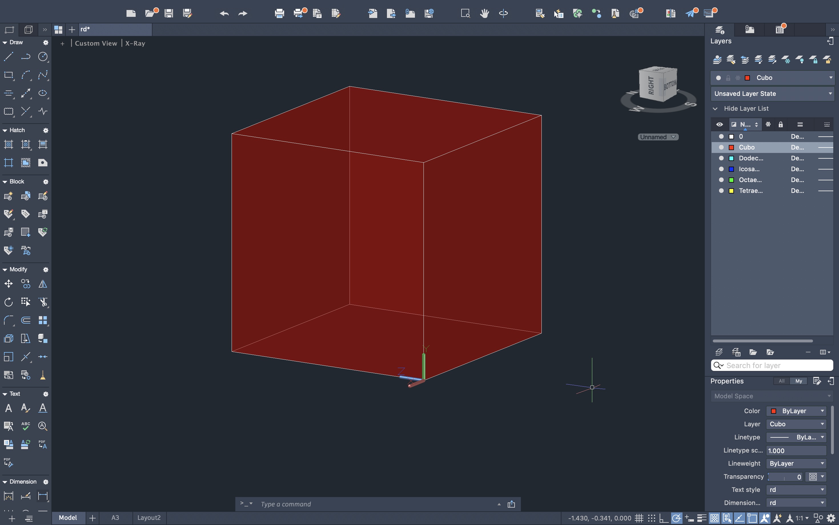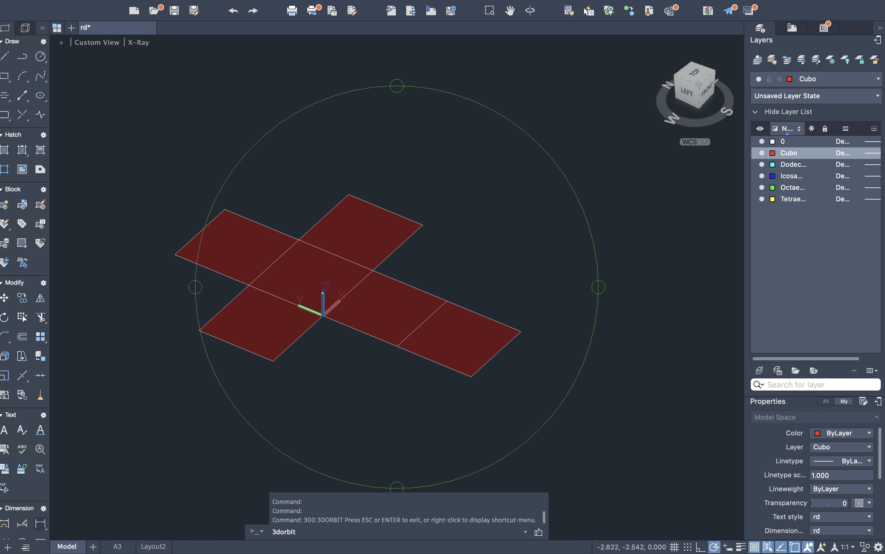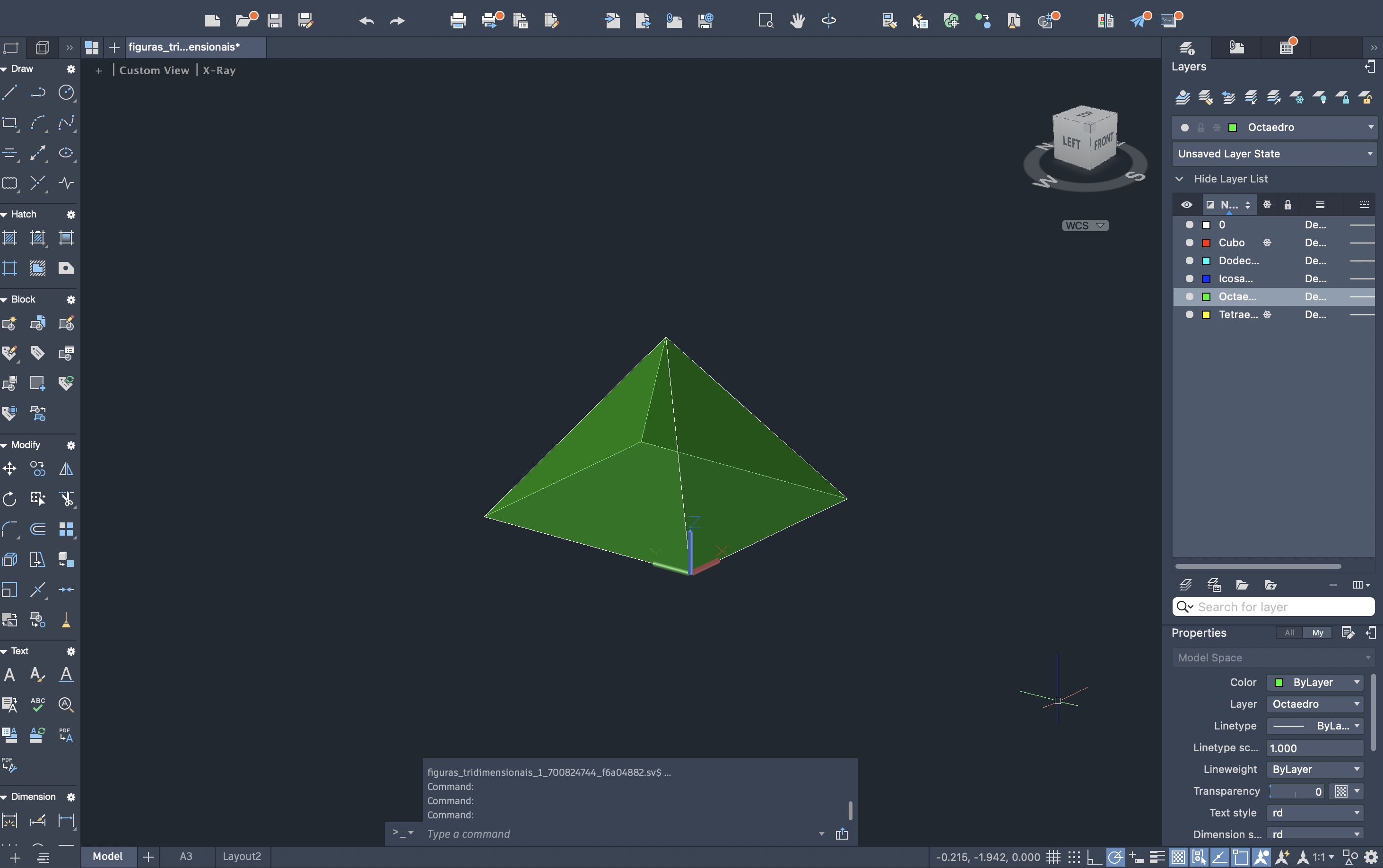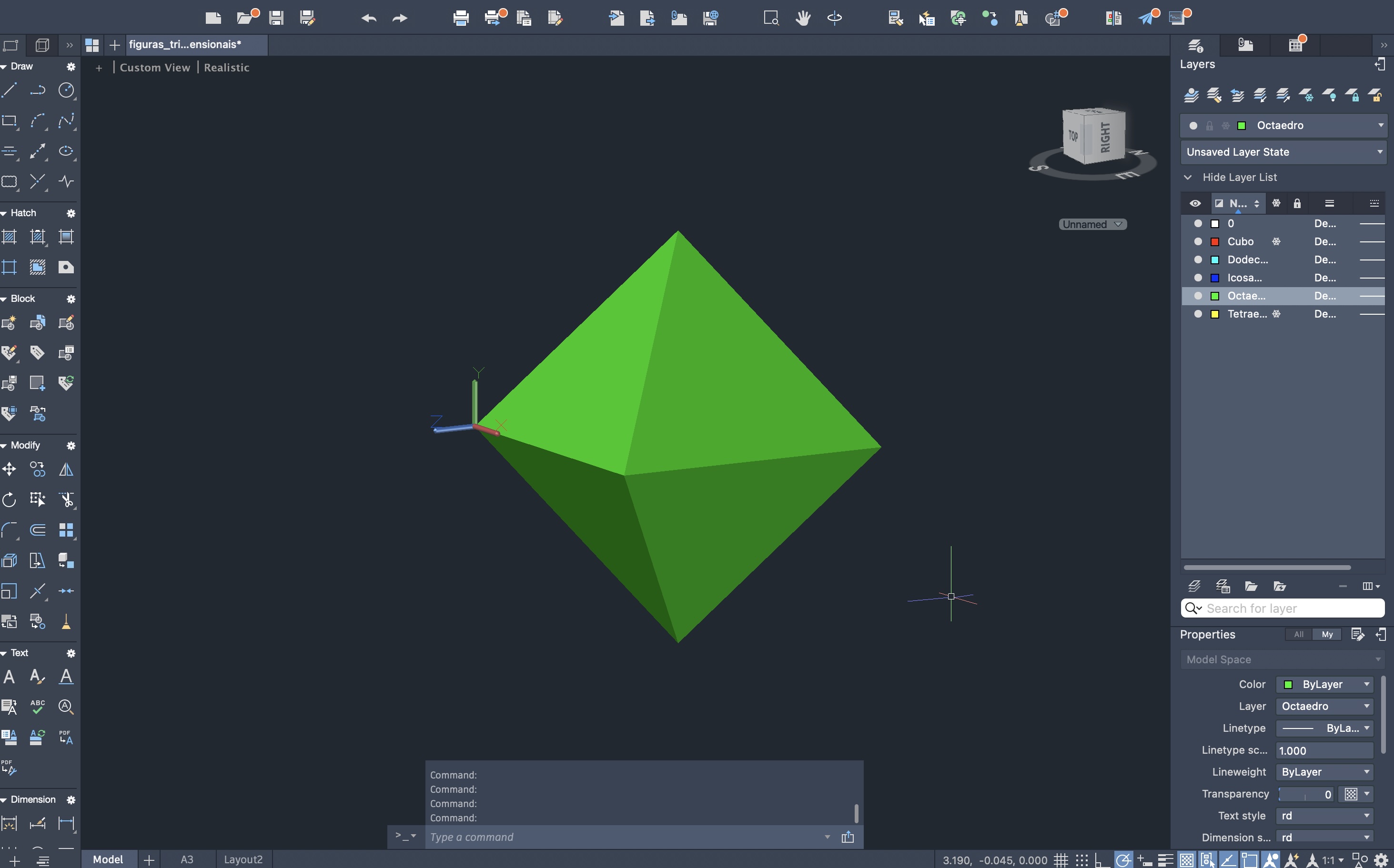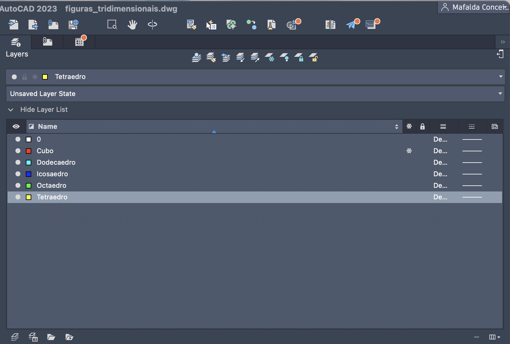 Criação de cinco layers para cada um dos sólidos- um cubo (vermelho), um tetraedro (amarelo), um octaedro (verde), um dodecaedro (cyan) e um icosaedro (azul).