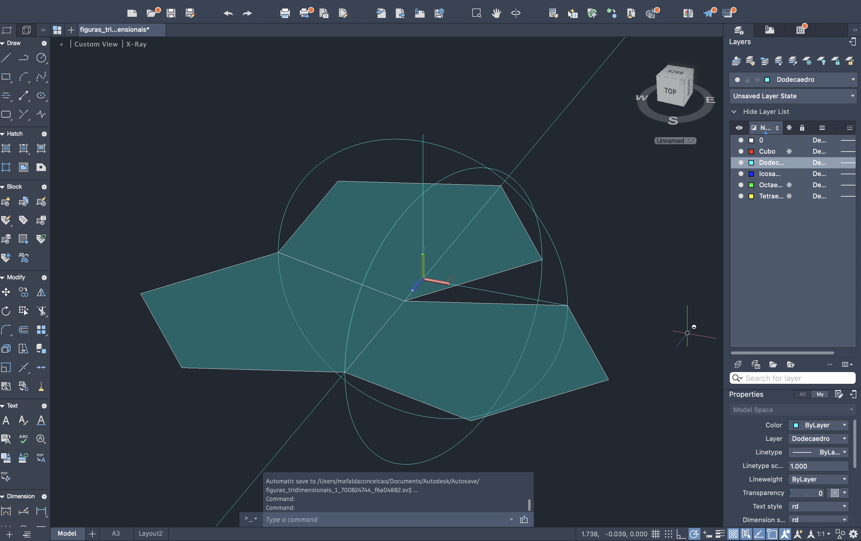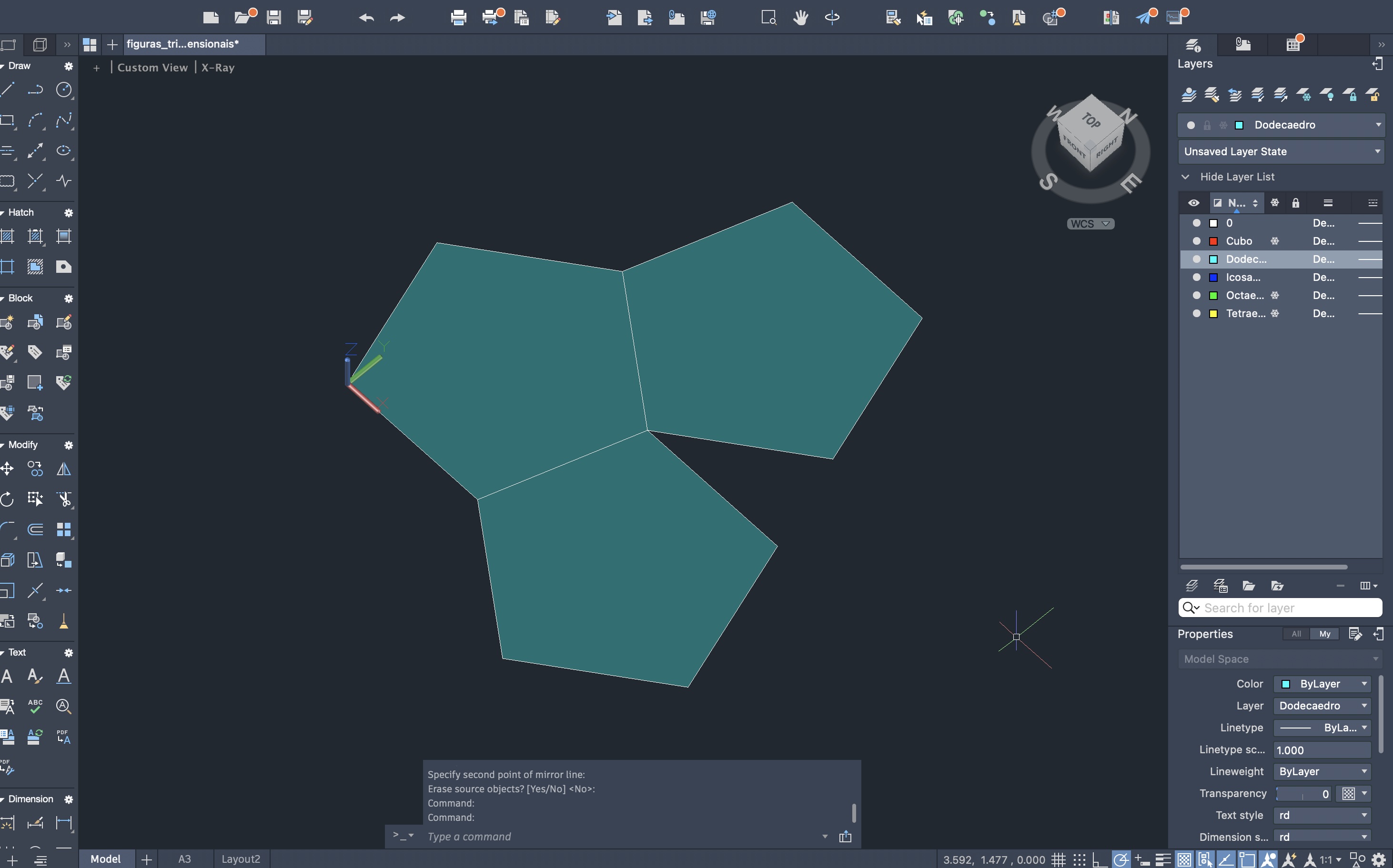 Início da planificação do dodecaedro através de criação de 3 pentágonos. com ajuda dos comandos: POLYGON, REGION, MIRROR, XLINE, LINE, UCS e CIRCLE.