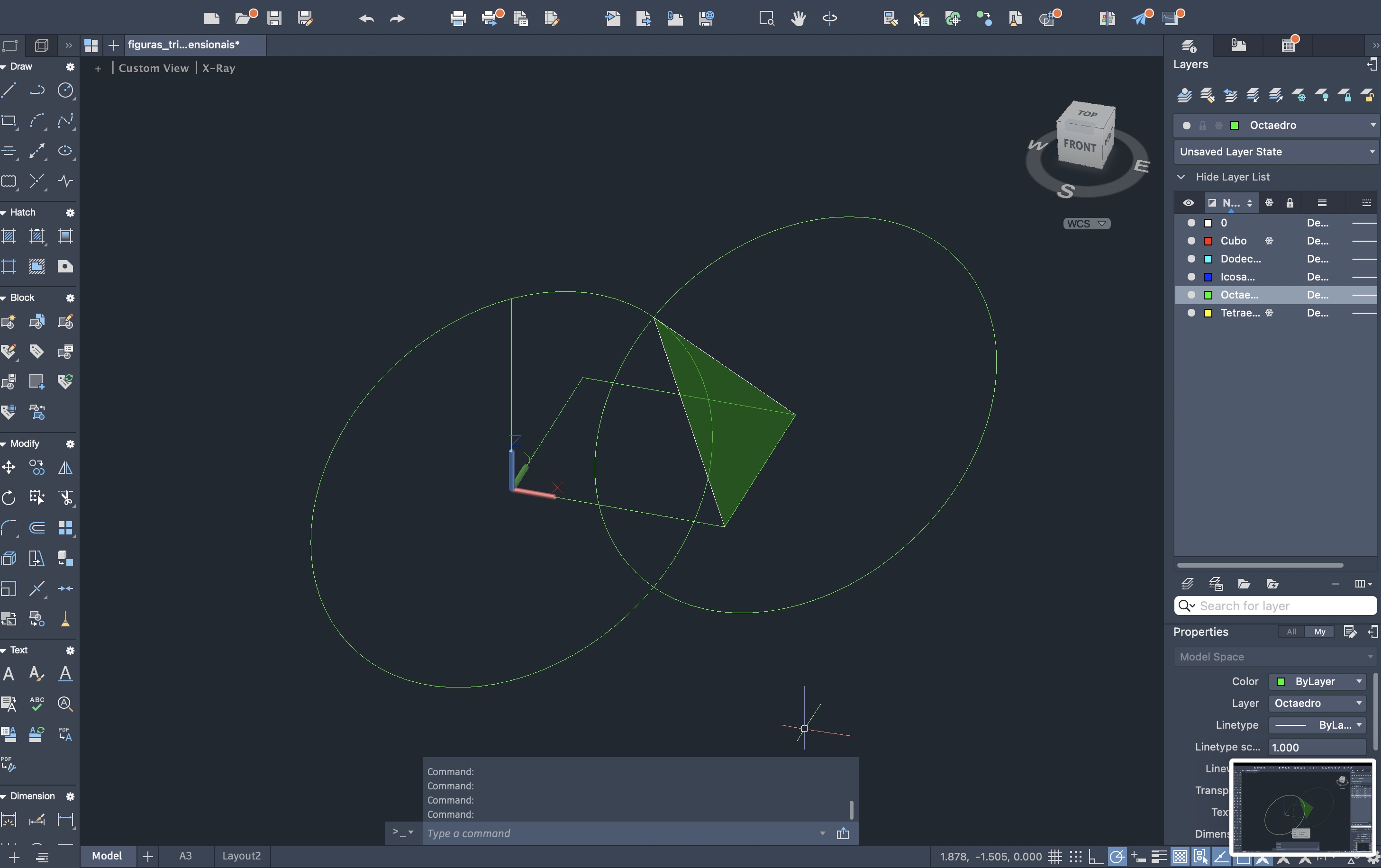 Construção da parte superior do octaedro, através dos comandos: LINE, UCS, CIRCLE, 3DPOLY e ARRAYCLASSIC.