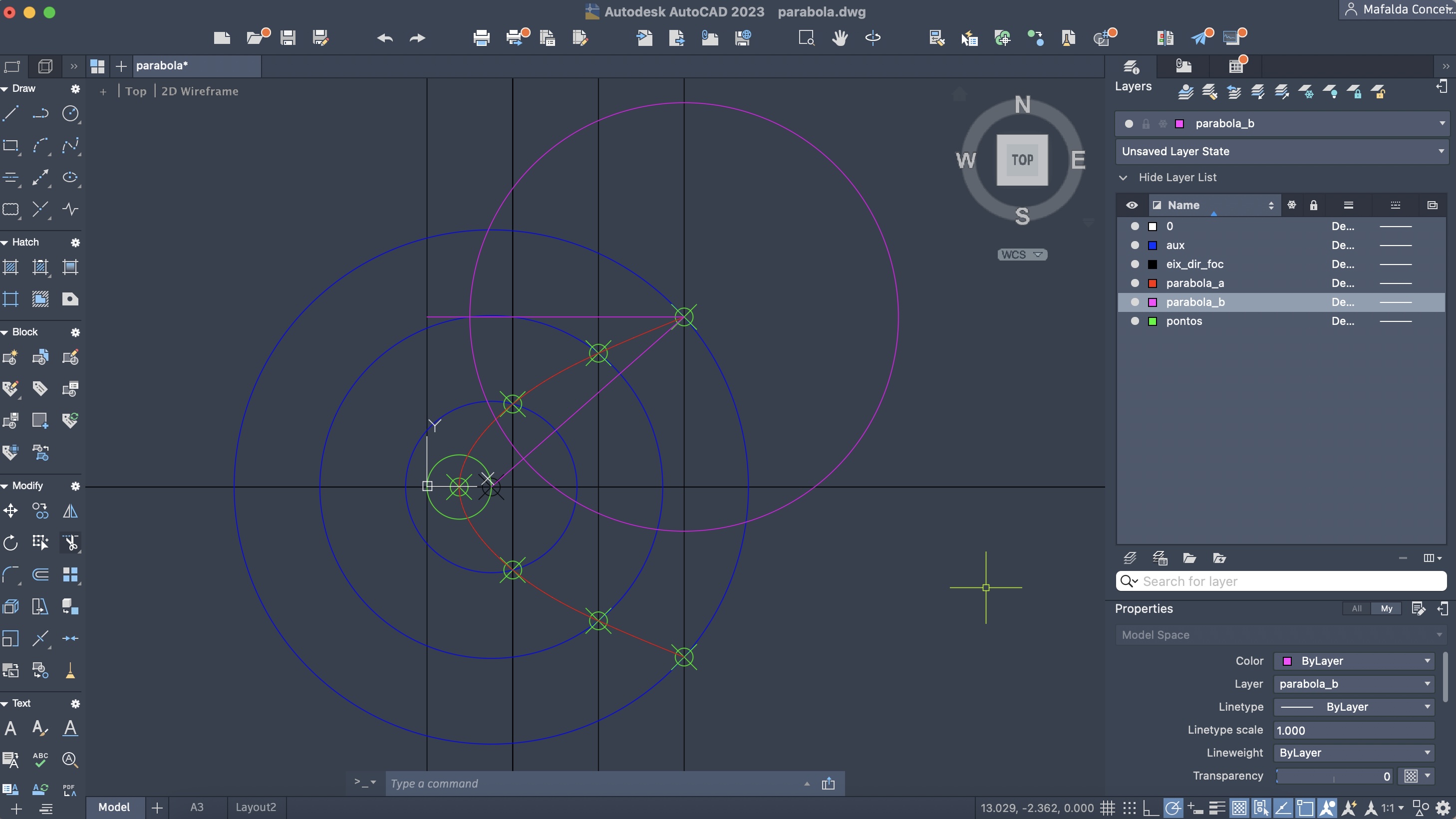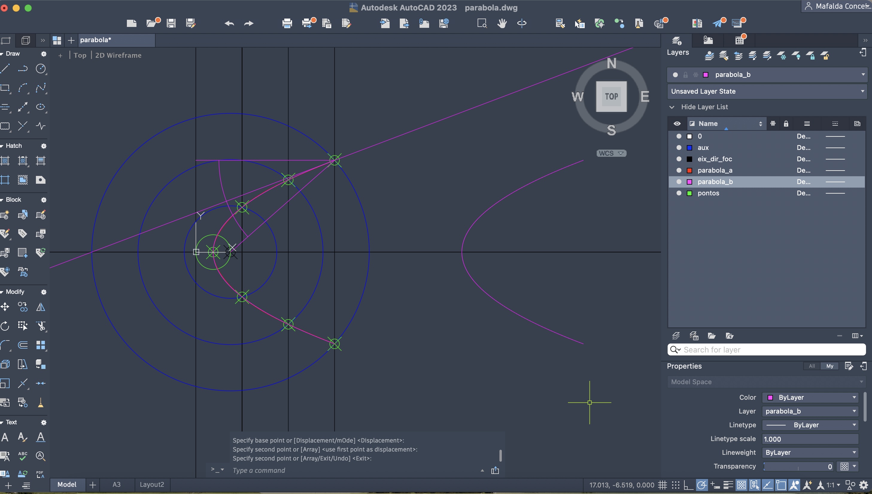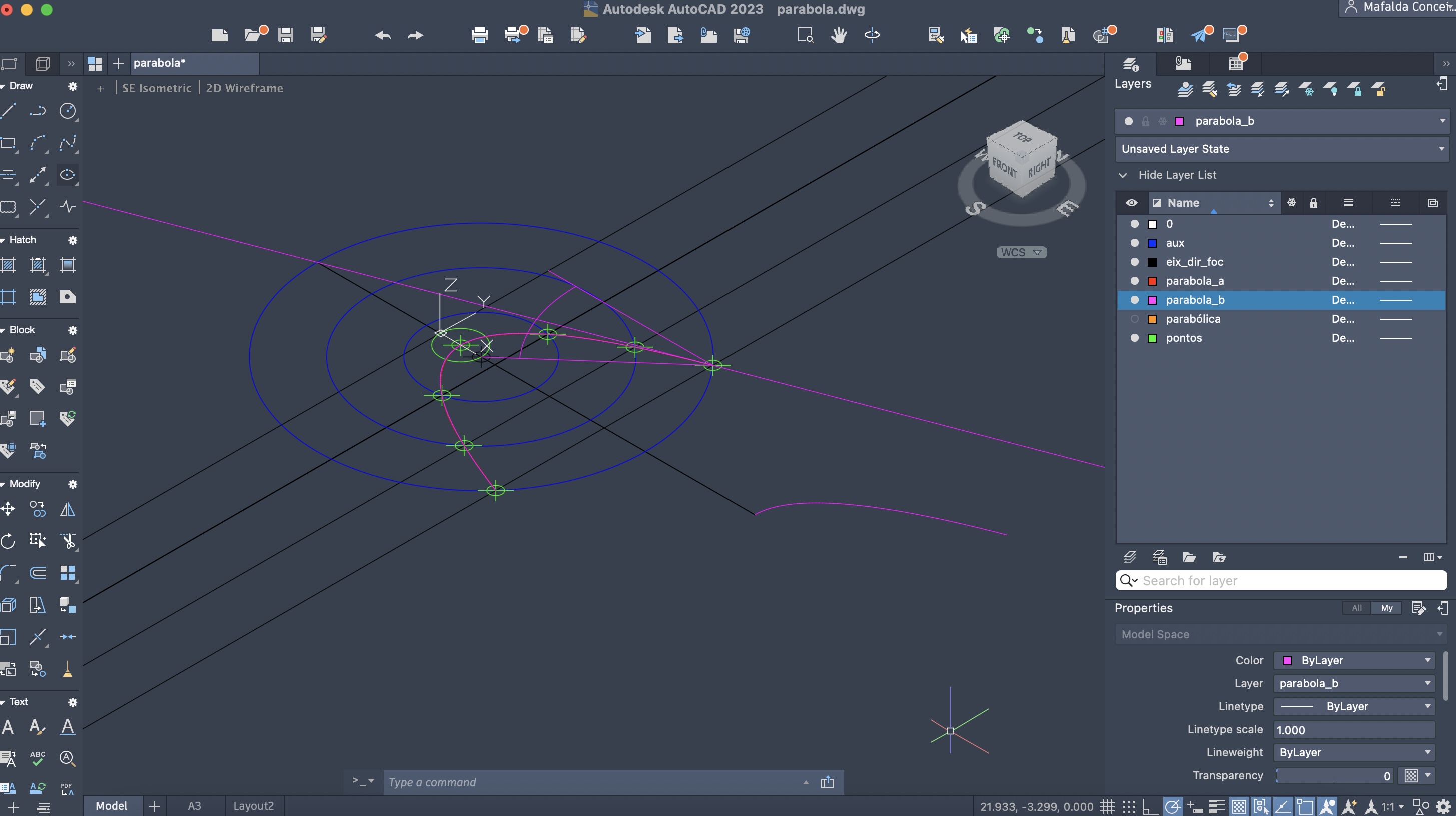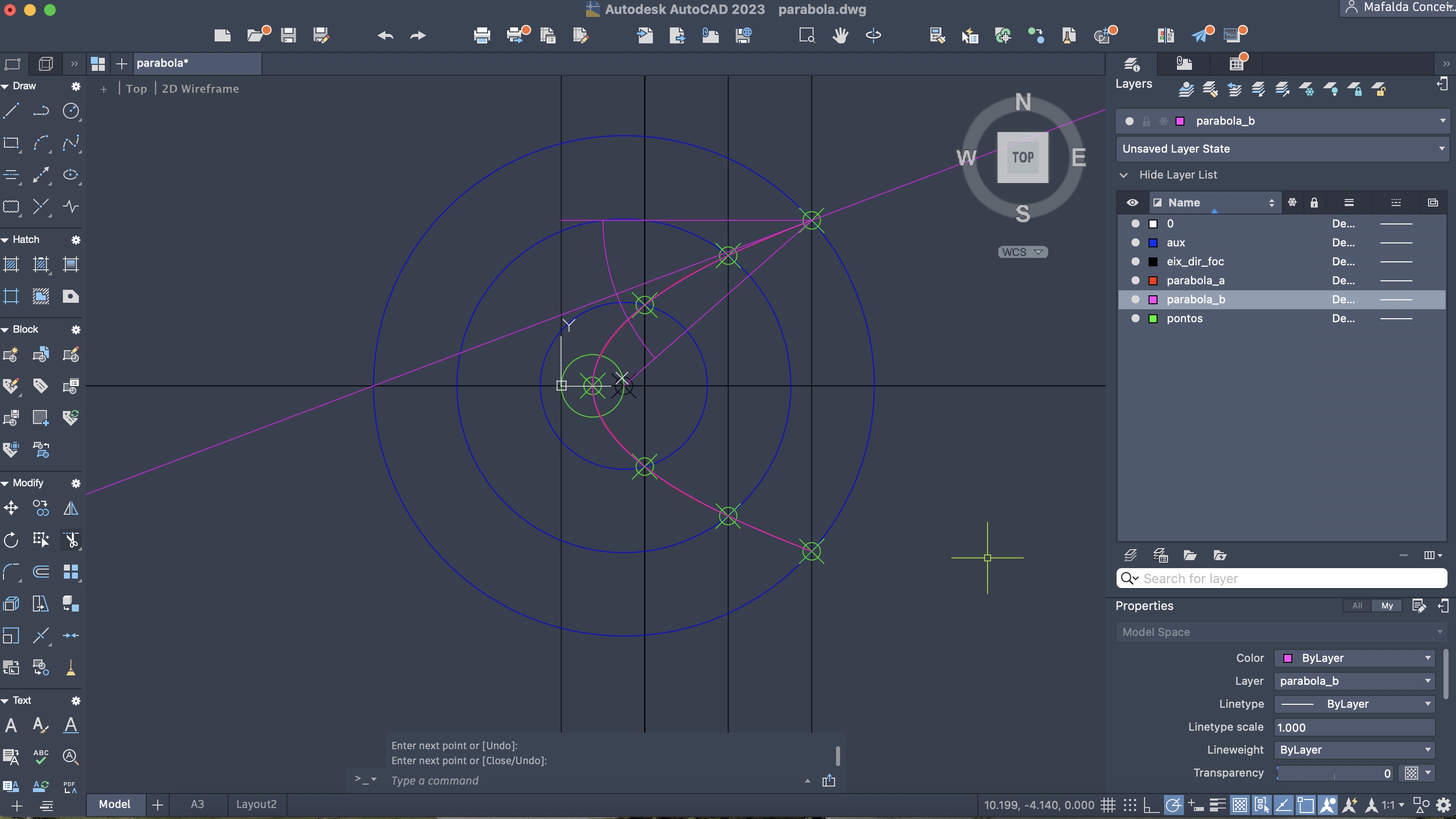 Criação da segunda parábola, mais rigorosa, através dos comandos: LINE, CIRCLE, TRIM, XLINE, SPLINE e COPY.