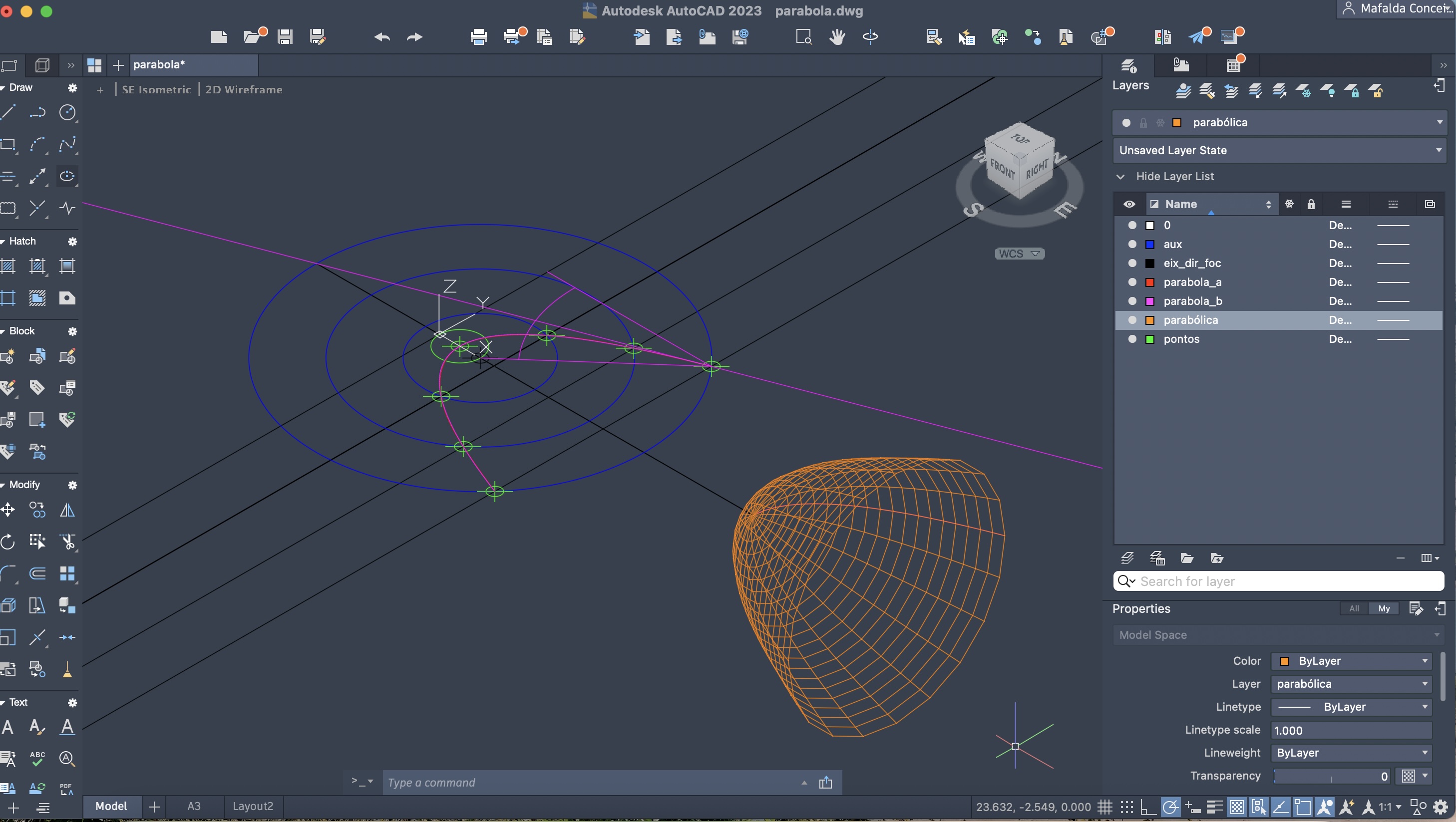 Construção de um paraboloide a partir da segunda parábola com o auxílio dos comandos: -VPOINT, TRIM, SURFTAB1, SURFTAB2, e REVSCULP.