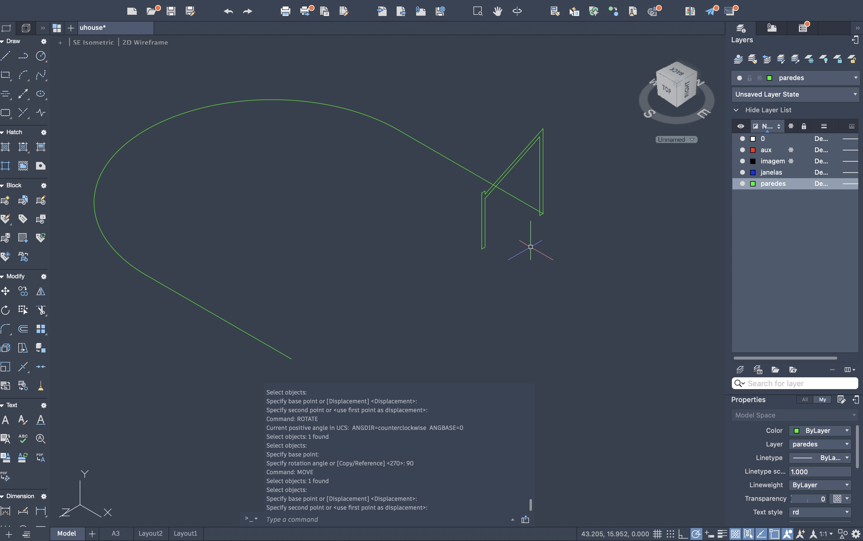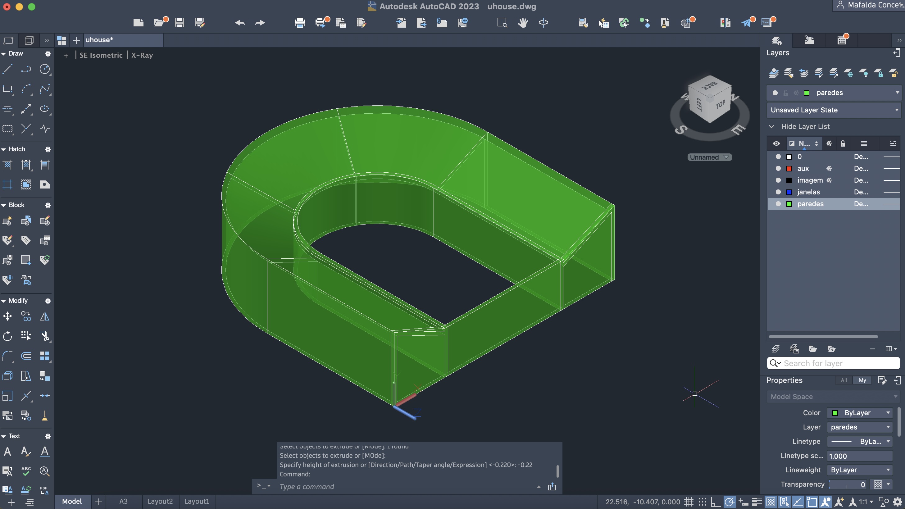 Através da forma da base e de um perfil, criação do formato da casa e fechamento, com a utilização dos comandos: -VPOINT, MOVE, ROTATE, UCS e EXTRUDE.