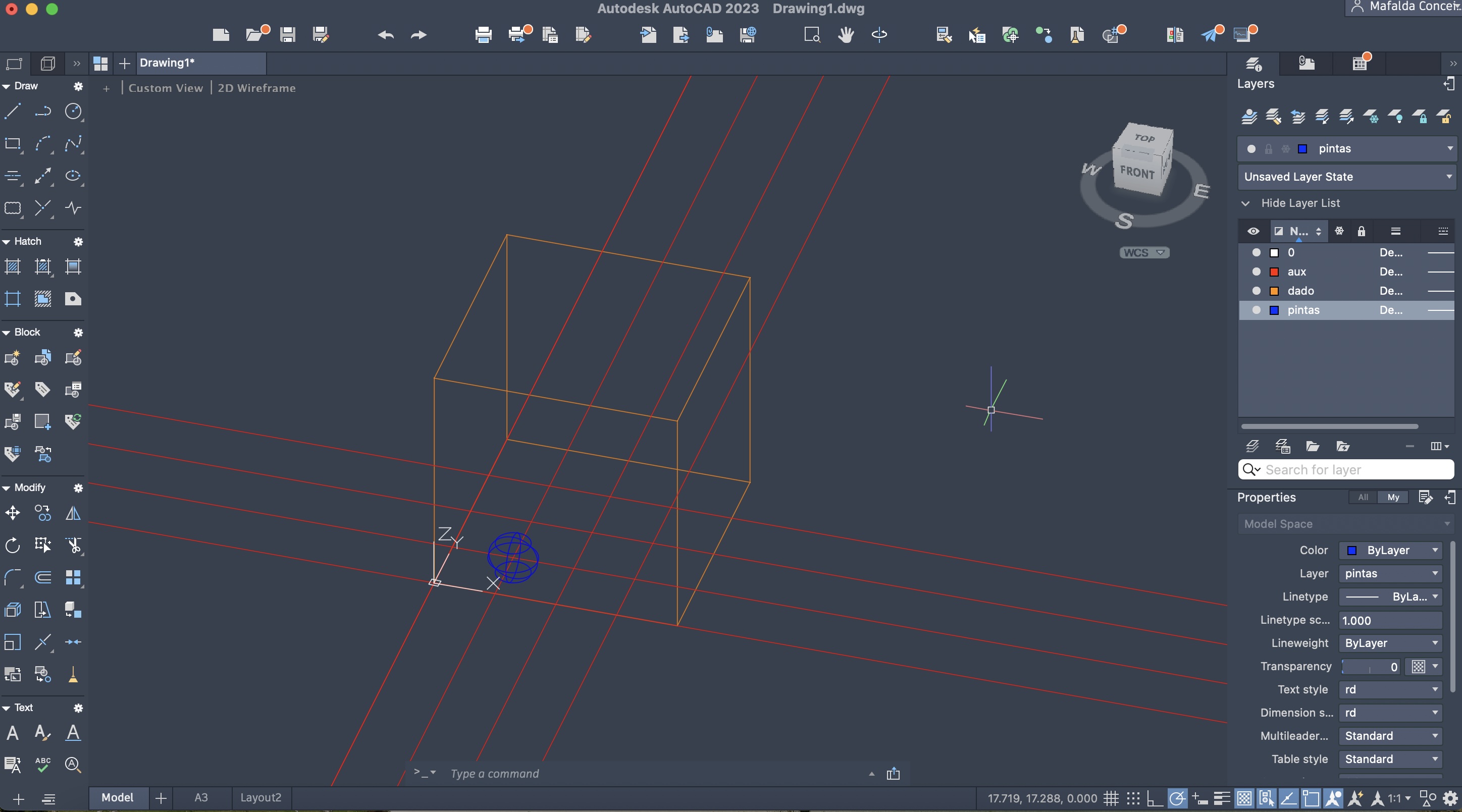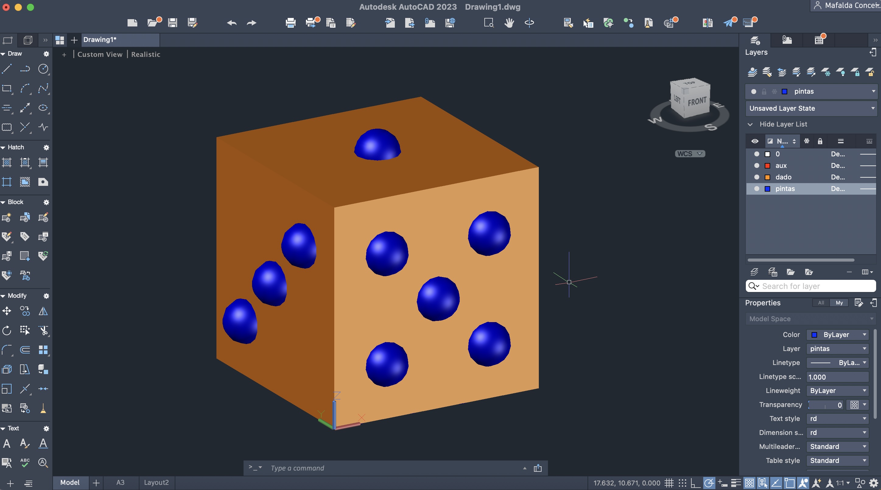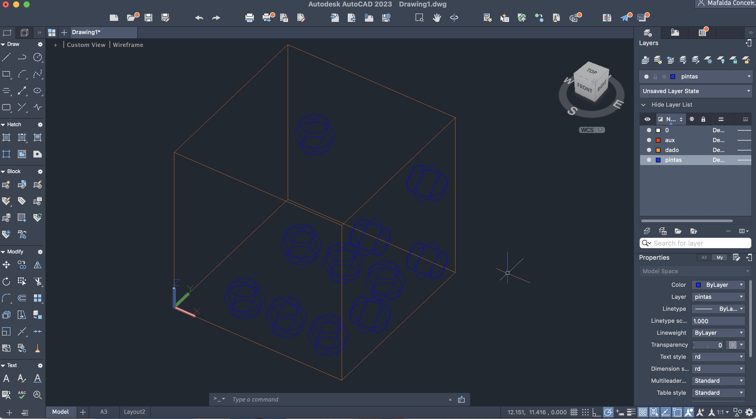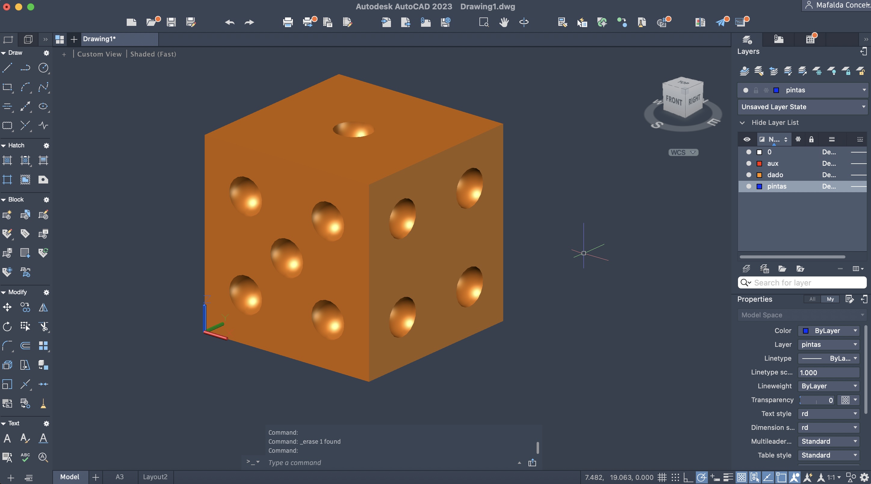 Início de um novo exercício de criação de um dado, num novo ficheiro AutoCAD.