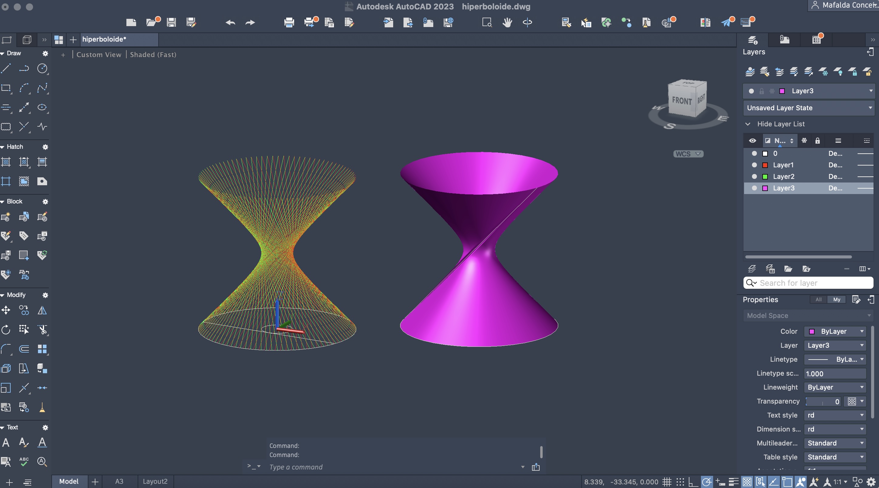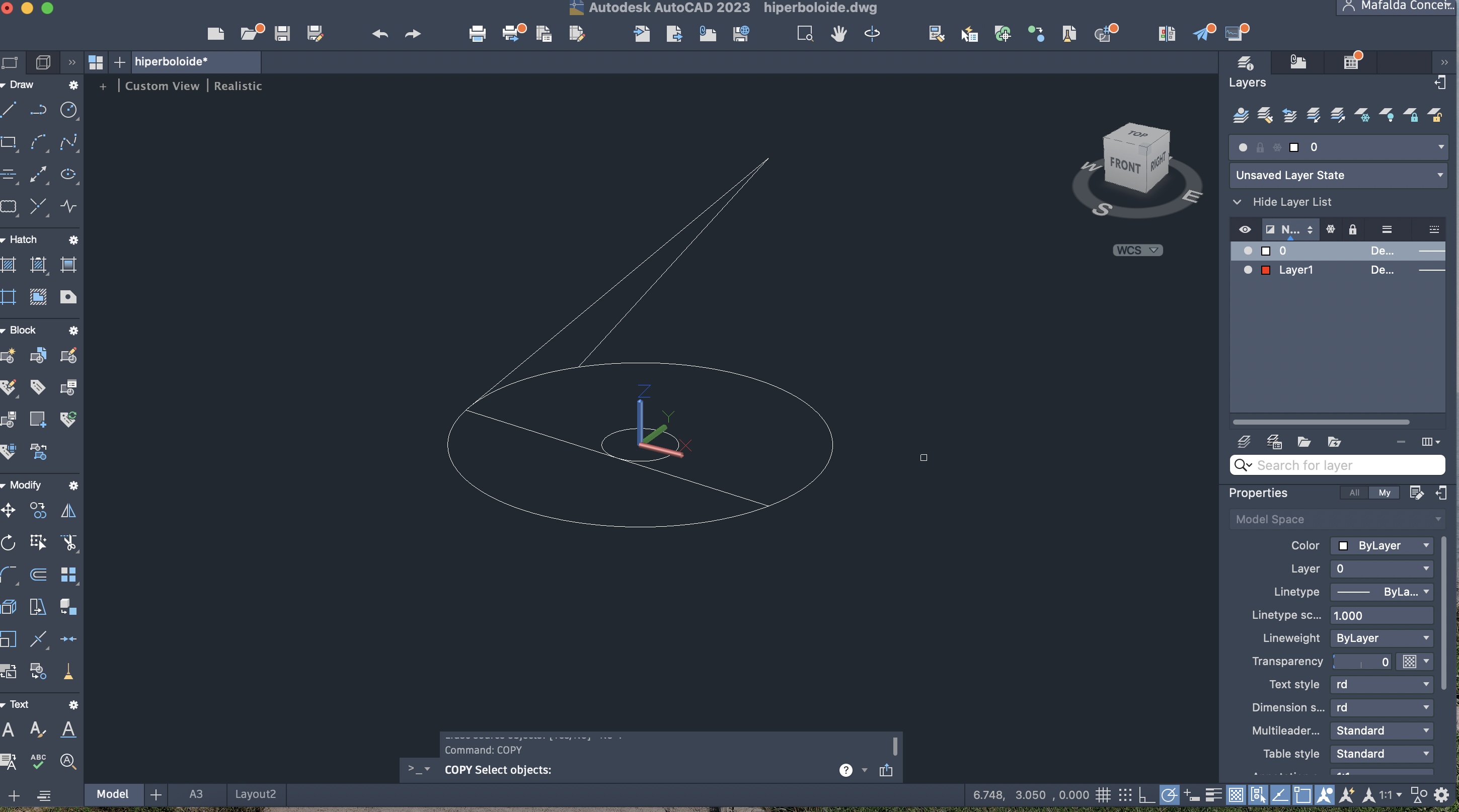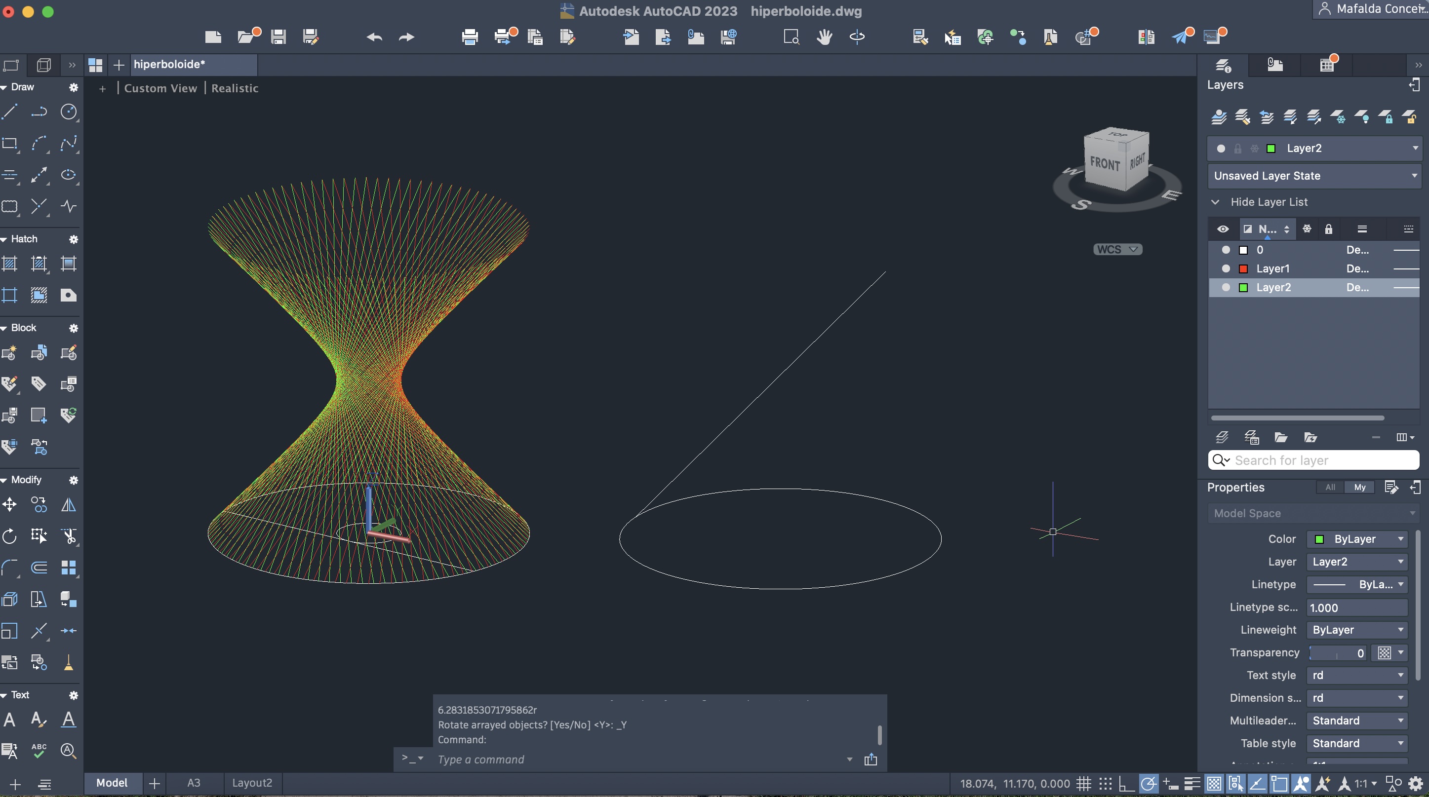Criação de um terceiro hiperboloide e de uma espessura no mesmo, através dos comandos: REVOLVE e THICKEN.