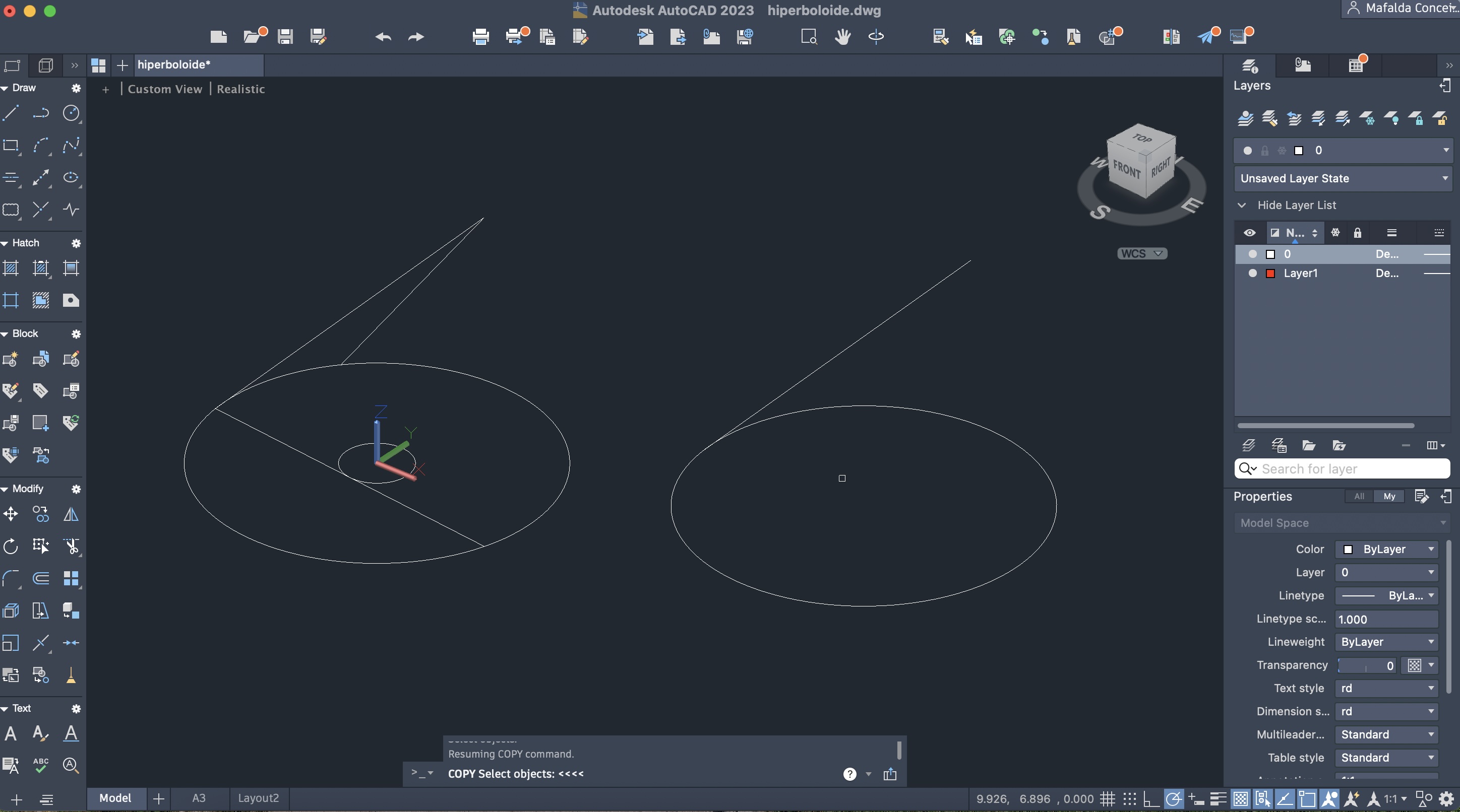 Criação de um dois círculos e de duas geratrizes diferentes, através dos comandos: CIRCLE, LINE, EXTEND e MIRROR.
