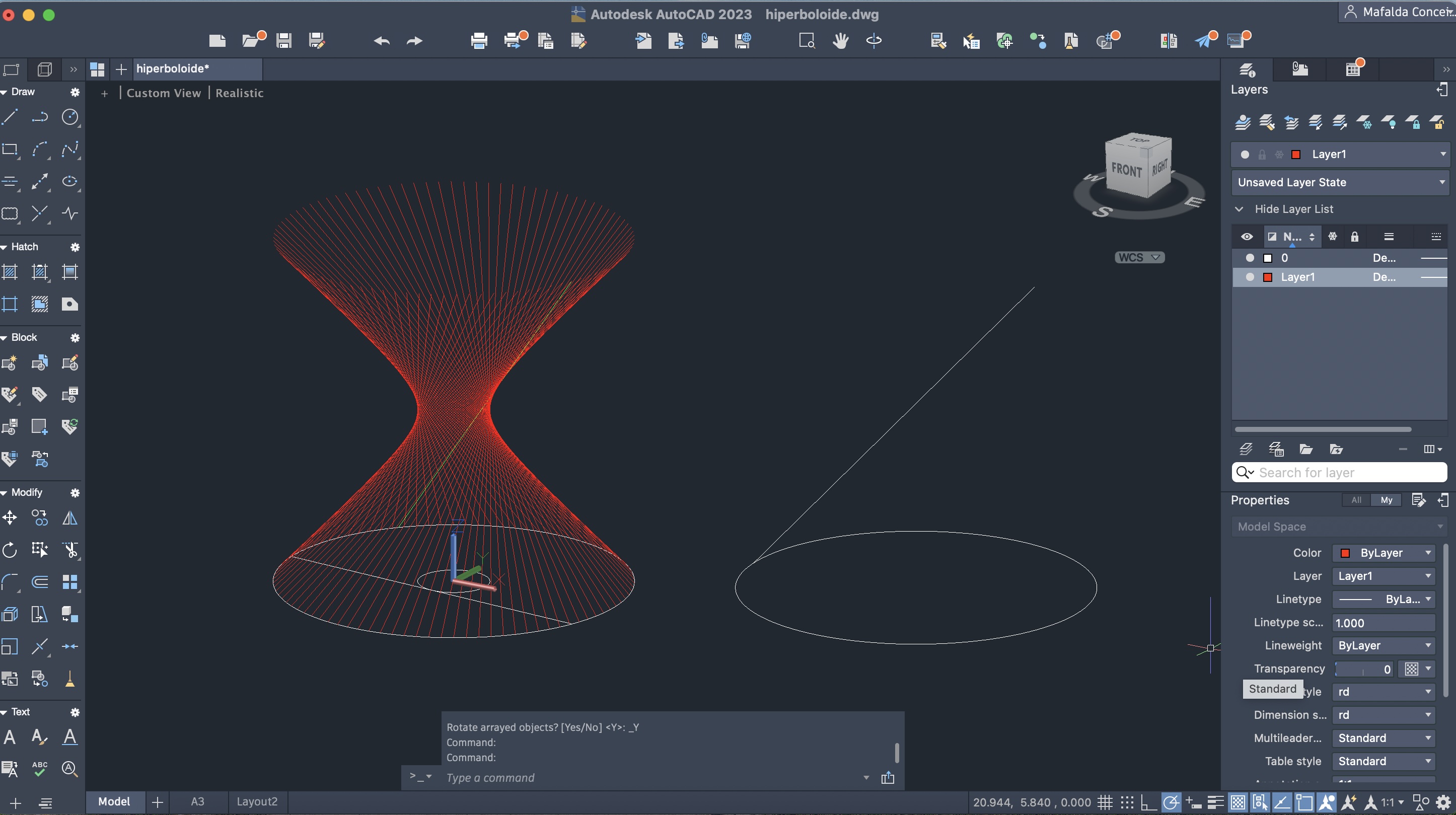 Cópia da figura para o lado com o comando: COPY, e criação de um hiperboloide vermelho e um verde, a partir de cada uma das geratrizes, com recurso ao comando: ARRAYCLASSIC.