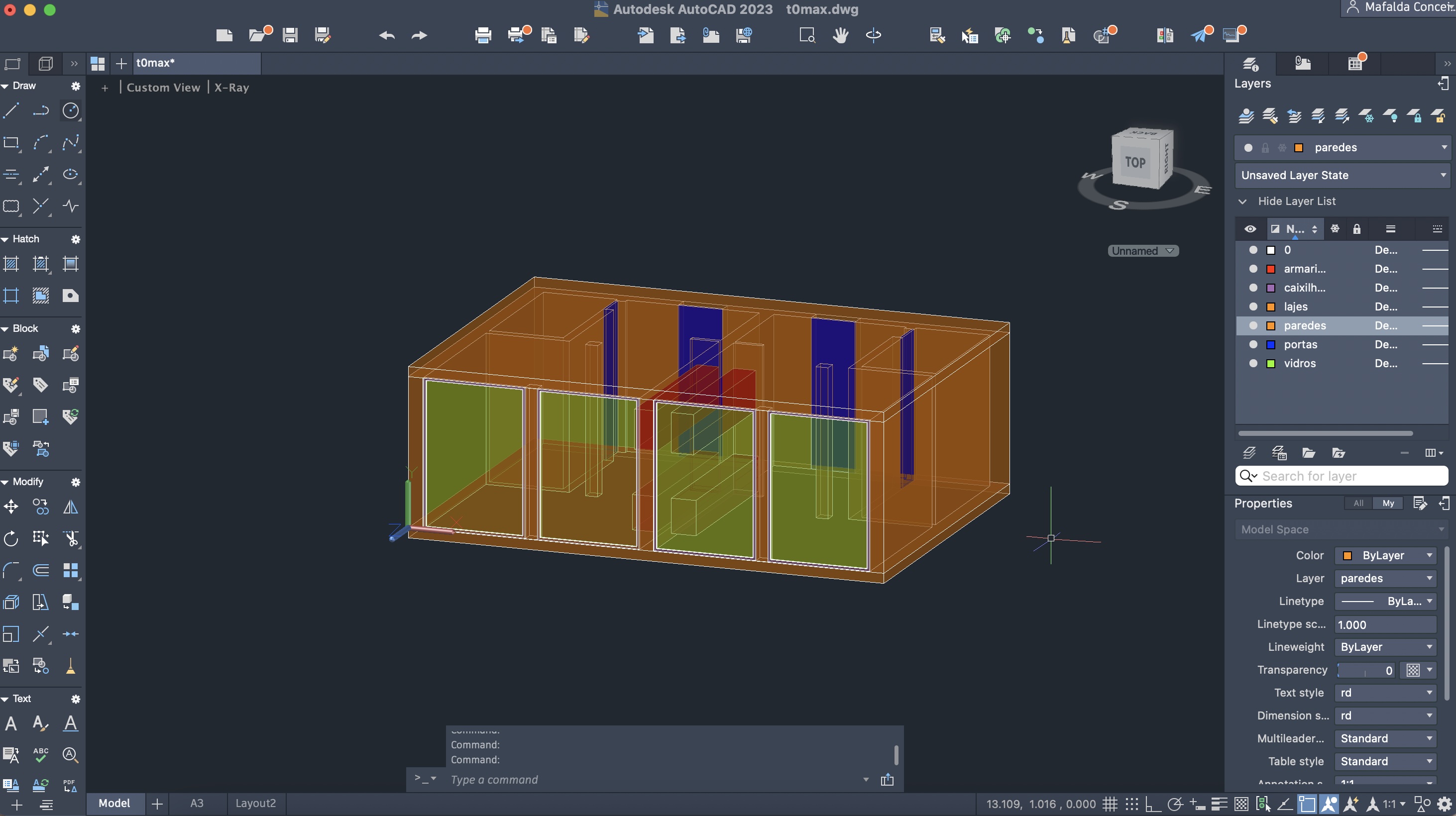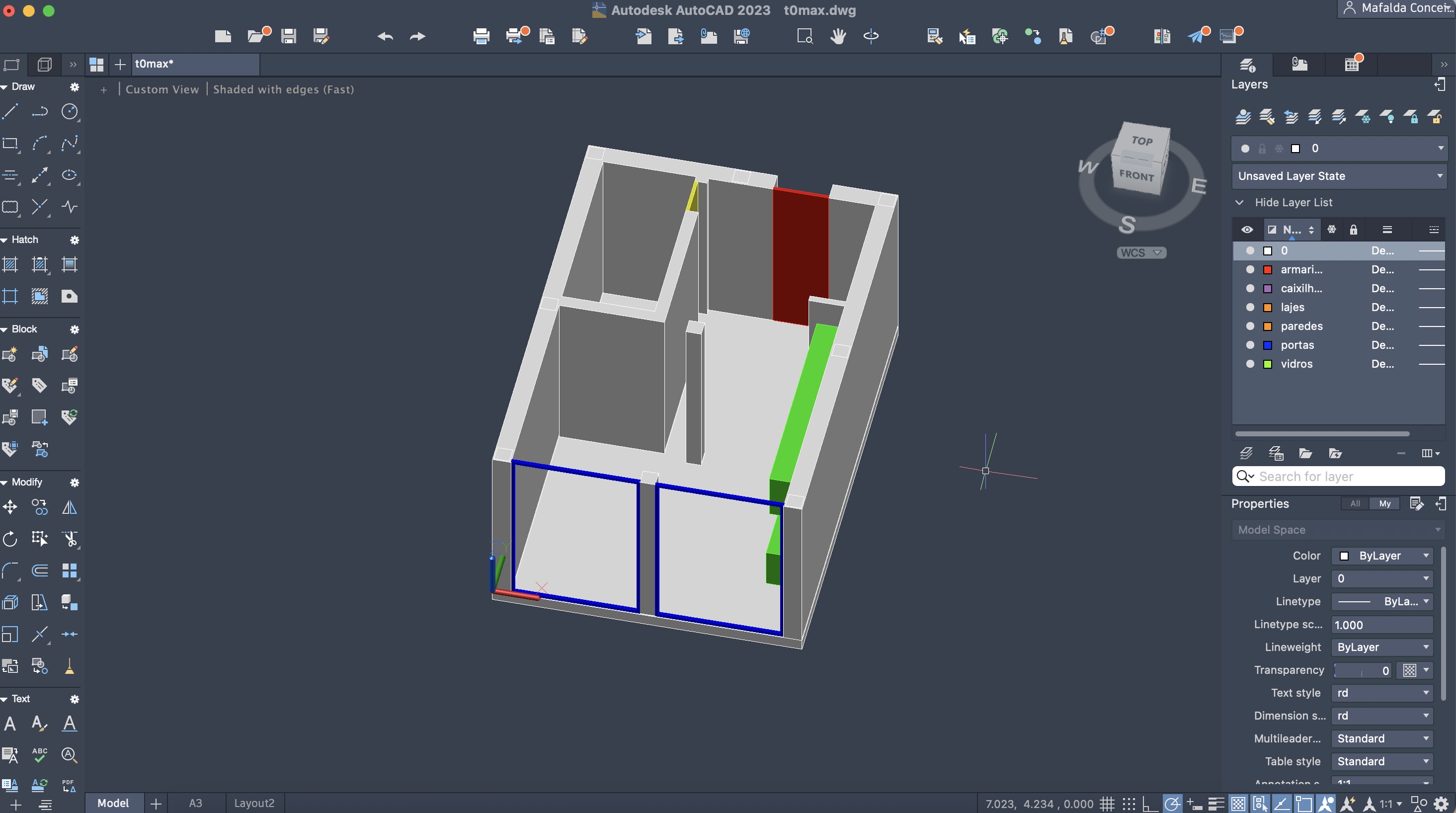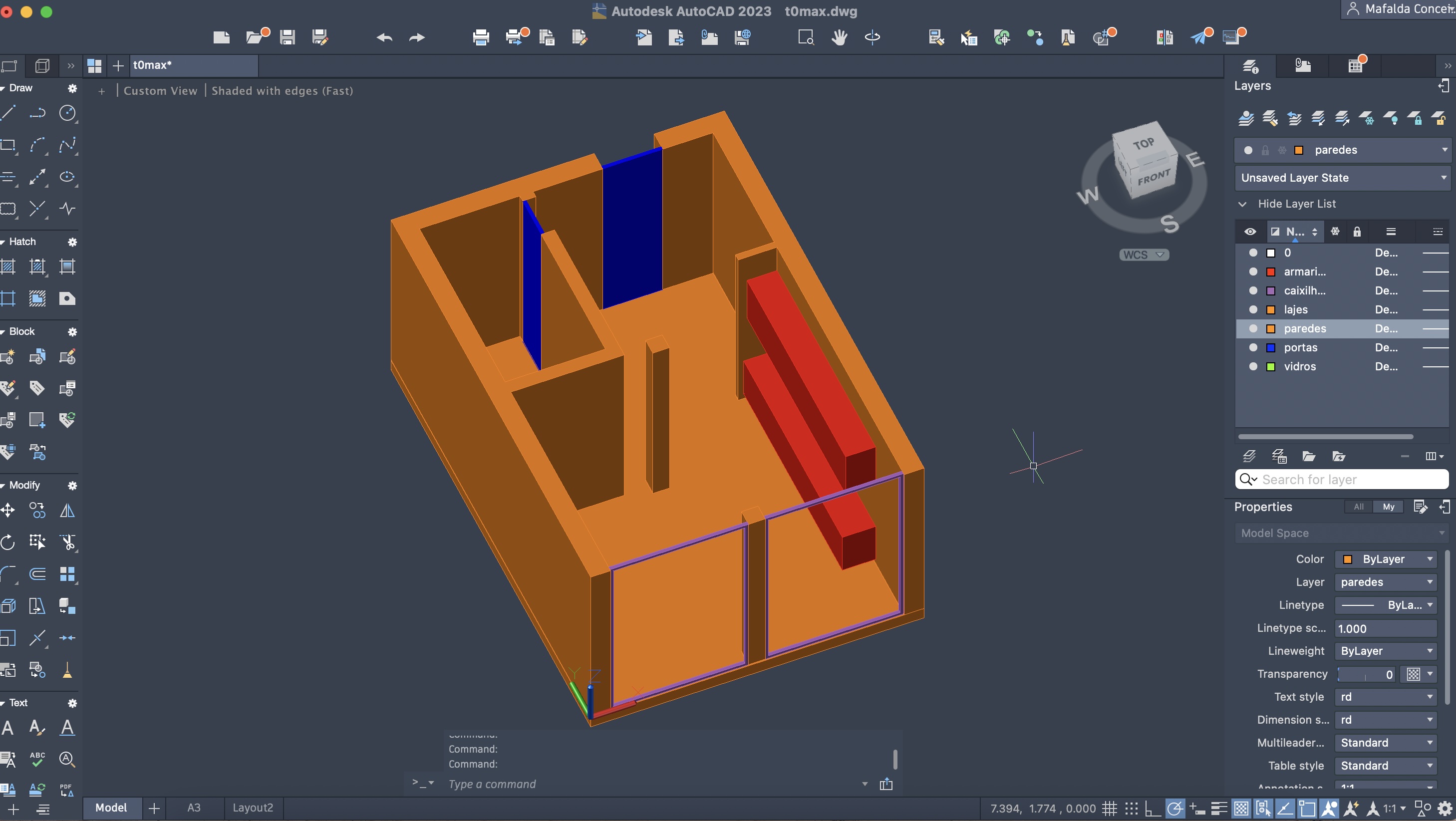 Mudança dos elementos para as suas layers e cores correspondentes. Depois, união das paredes e pilares, através do comando: UNION.