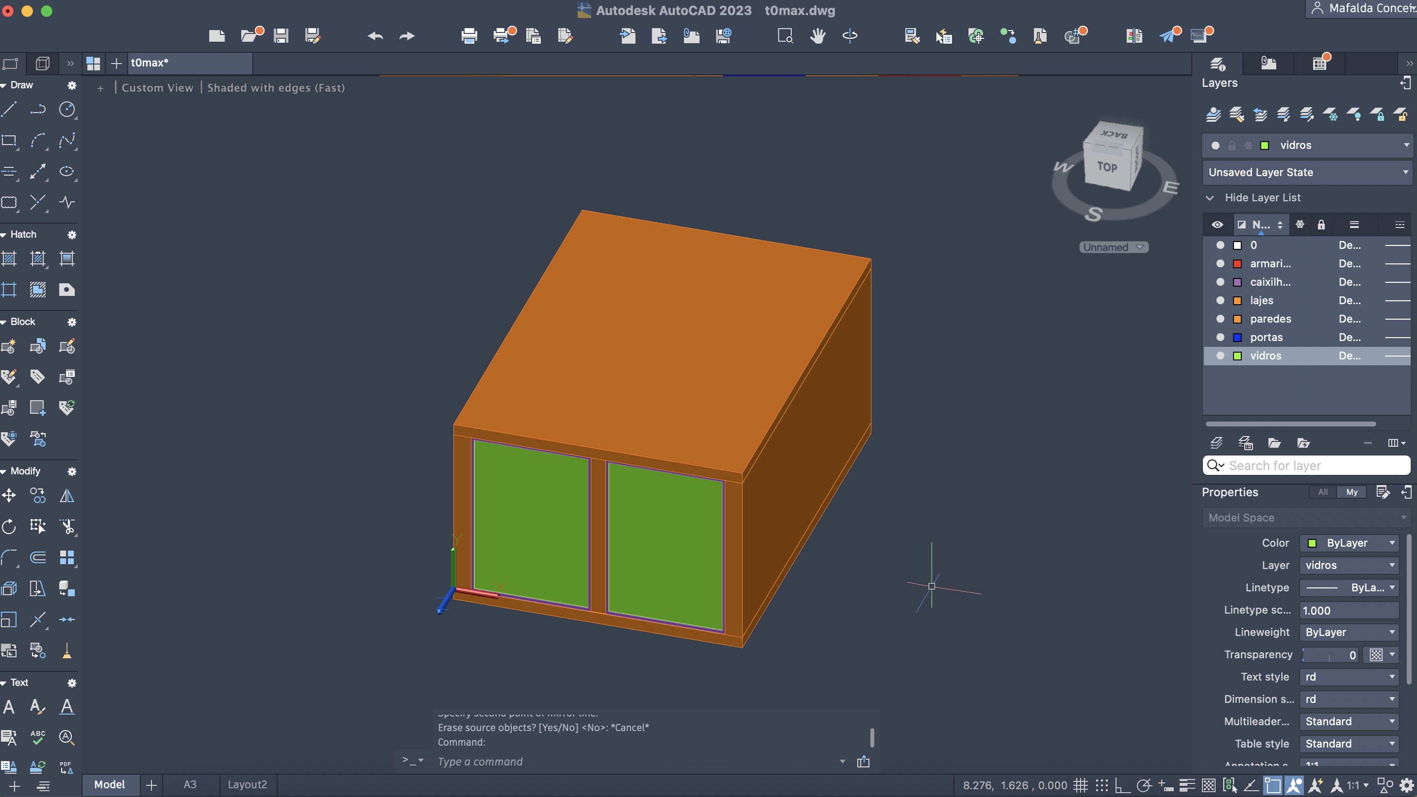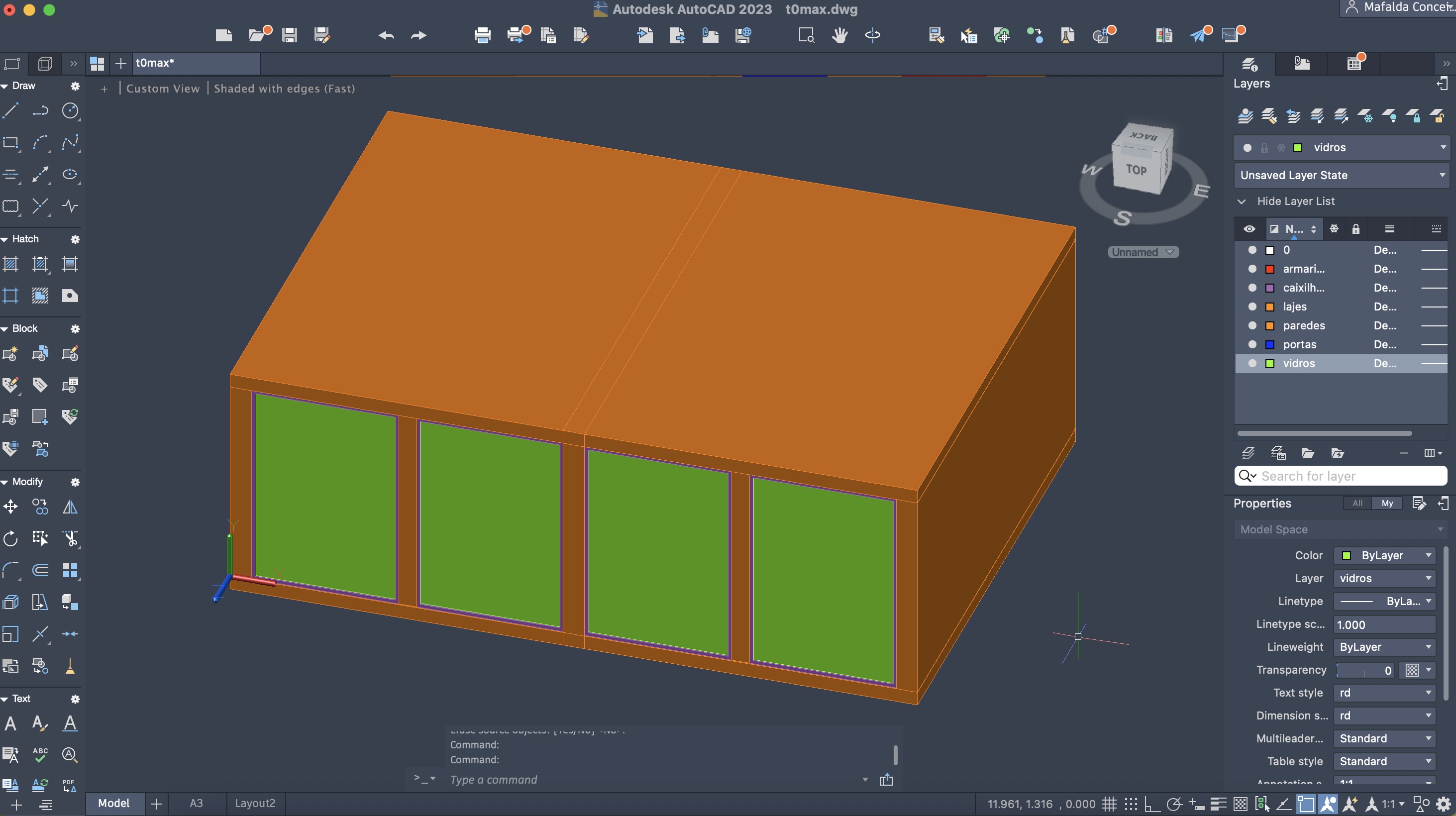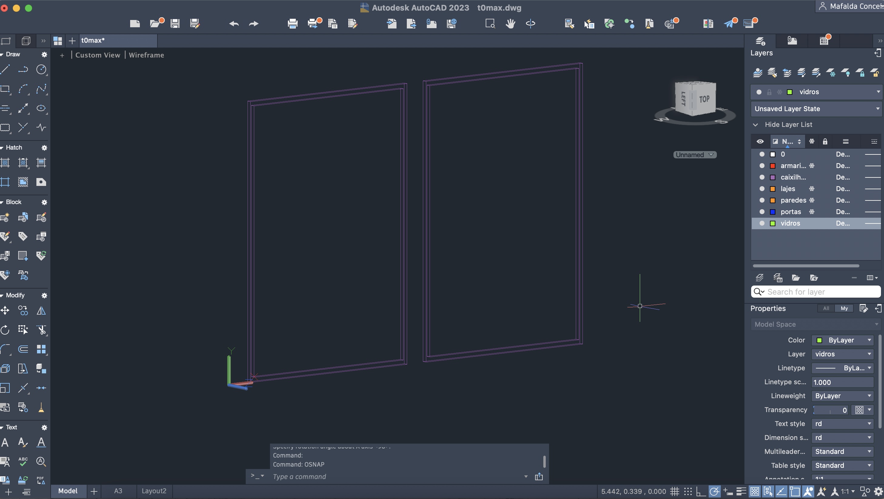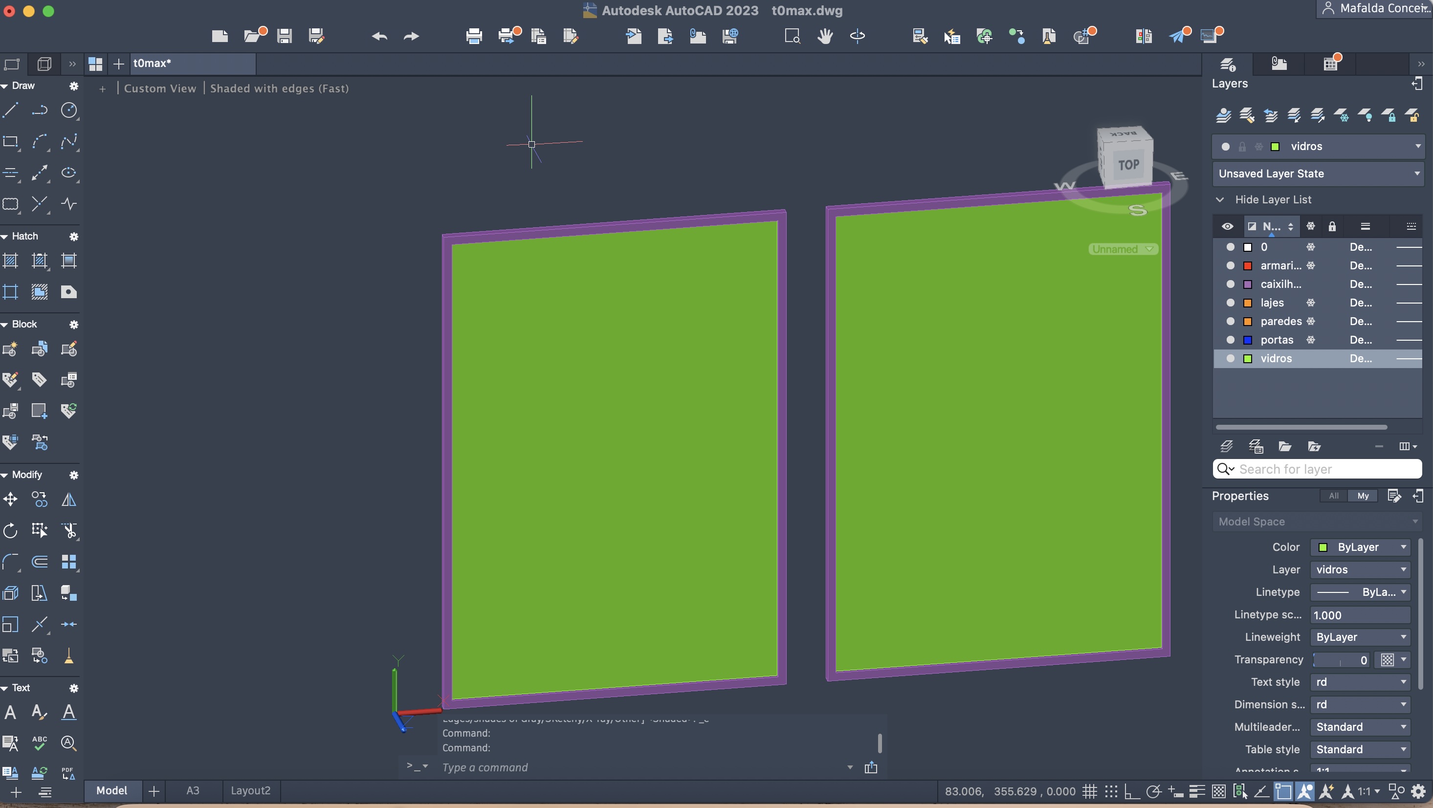 Criação dos vidros do T0, a partir dos comandos: UCS, RECTANGLE e REGION.