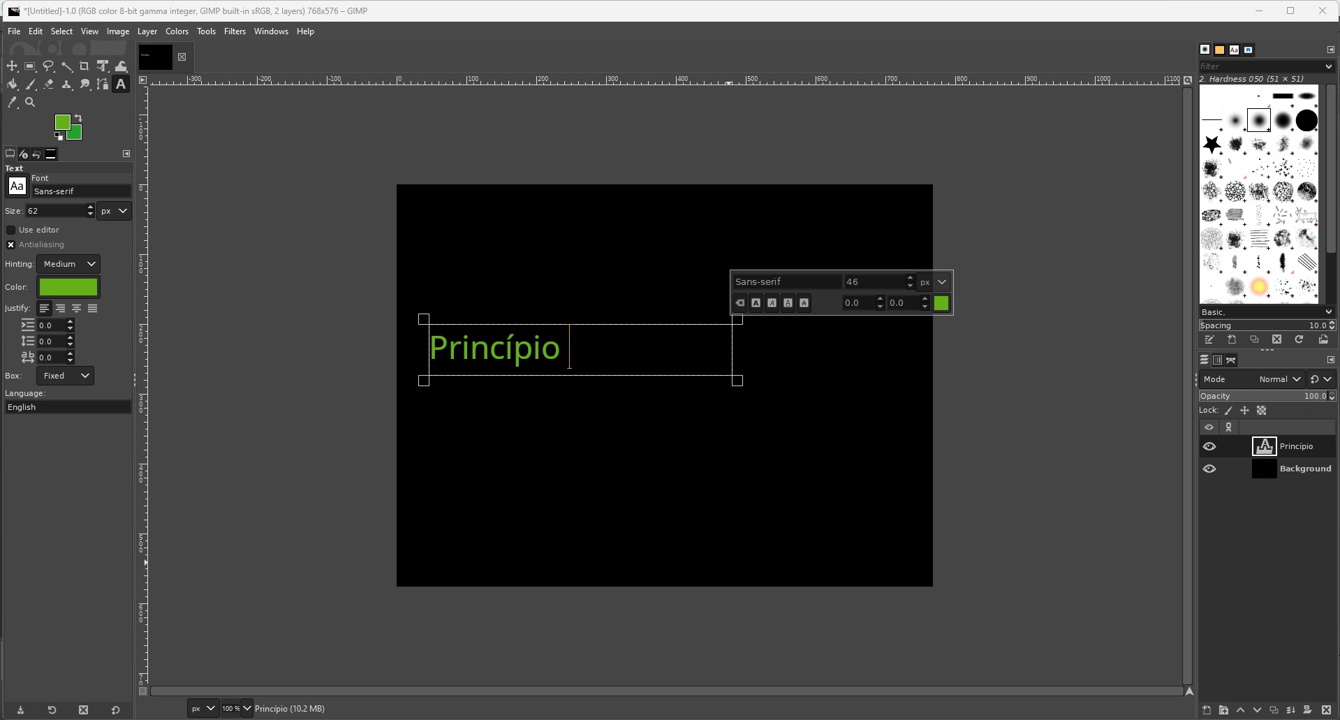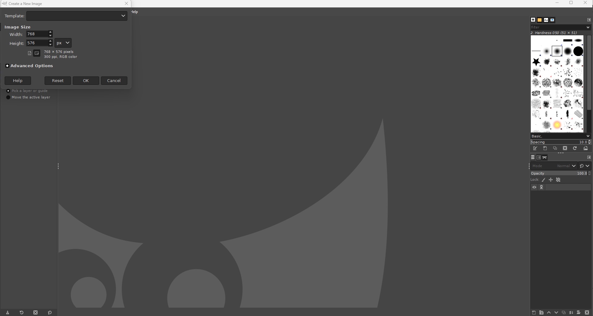 Abertura de um novo ficheiro no Gimp e formatação do mesmo para as medidas da animação (768x576).