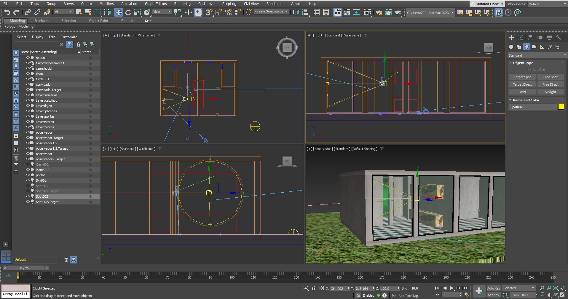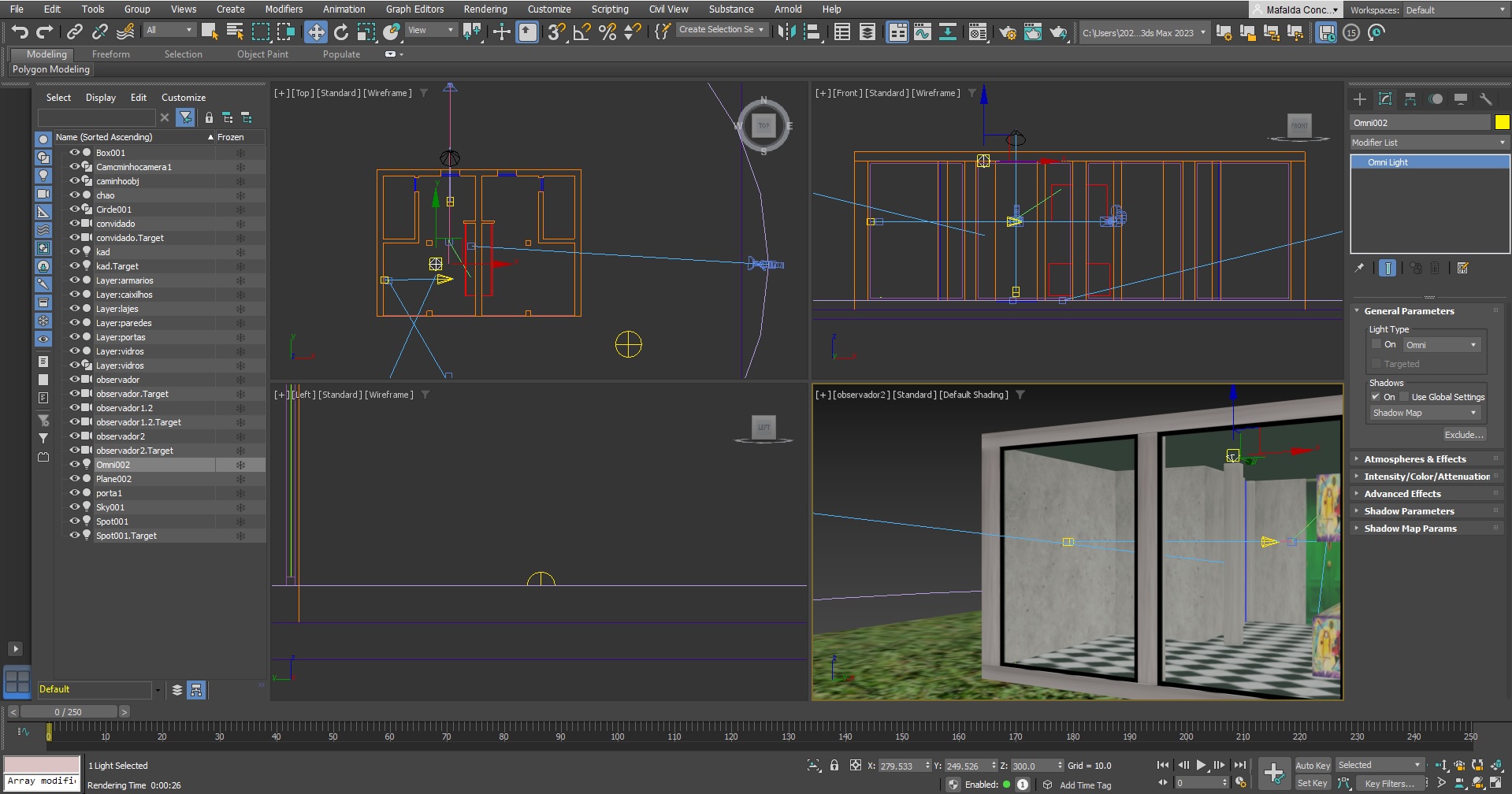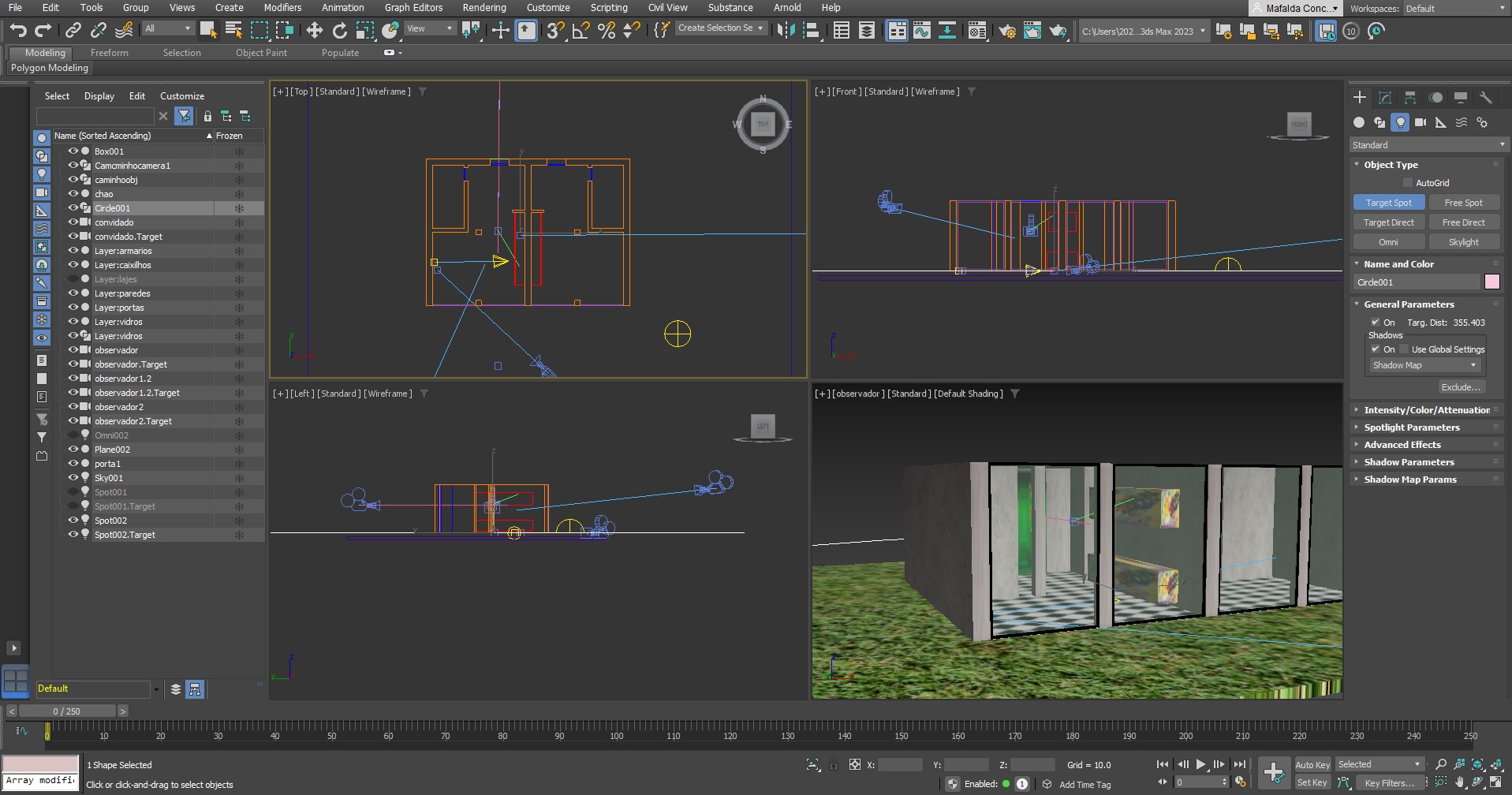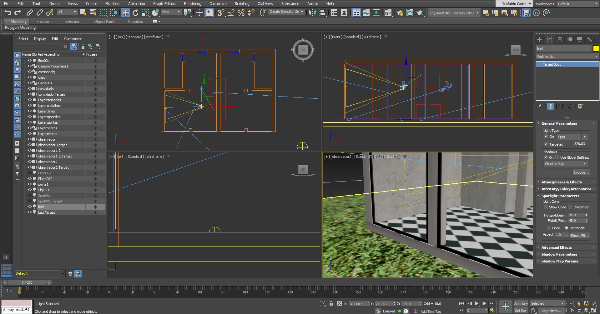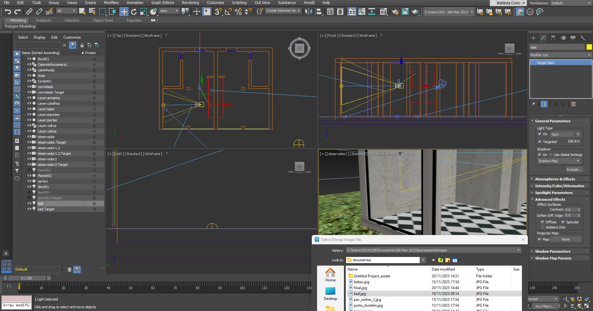 Reabertura do 3ds MAX. Criação e ajuste de uma nova luz Target Spot, para a projeção de uma pintura do Kandinsky na parede.