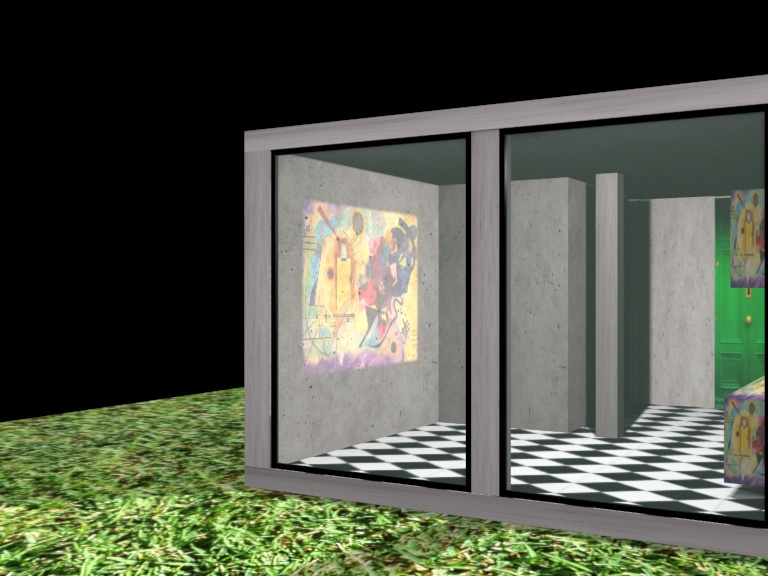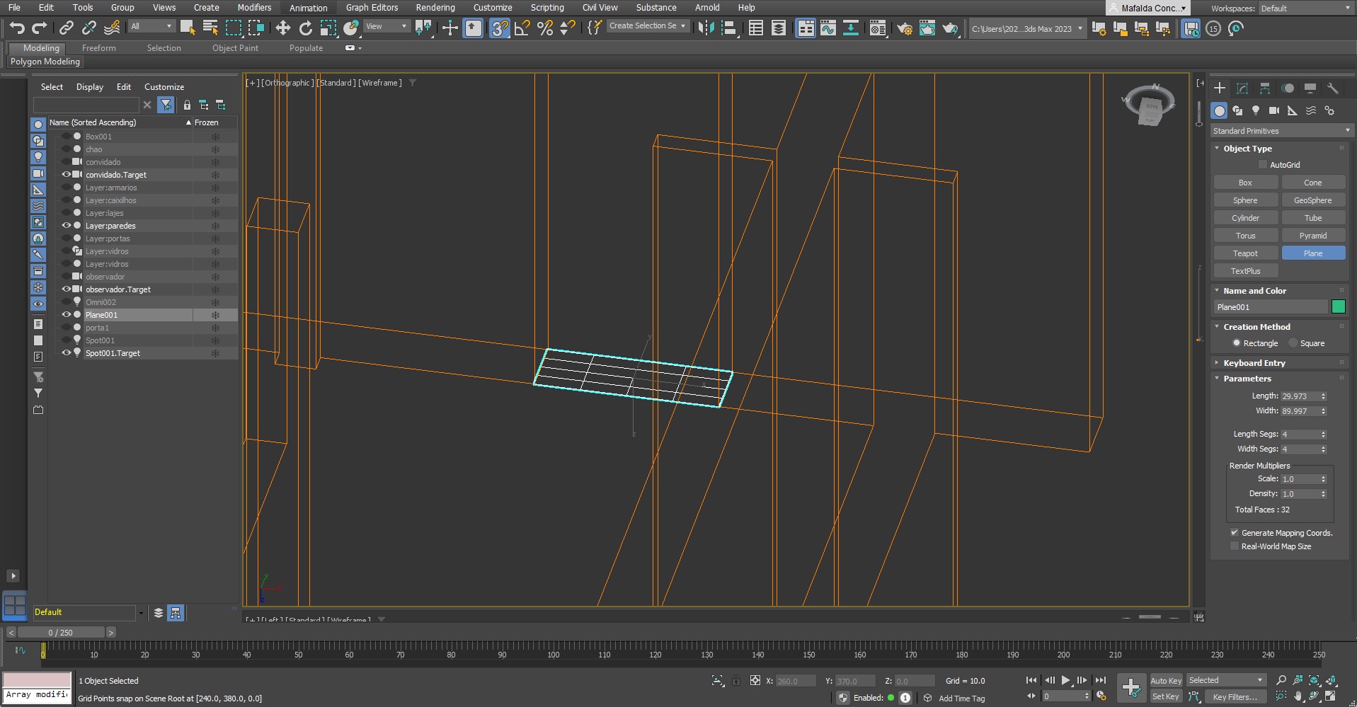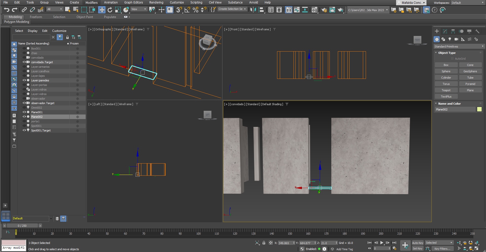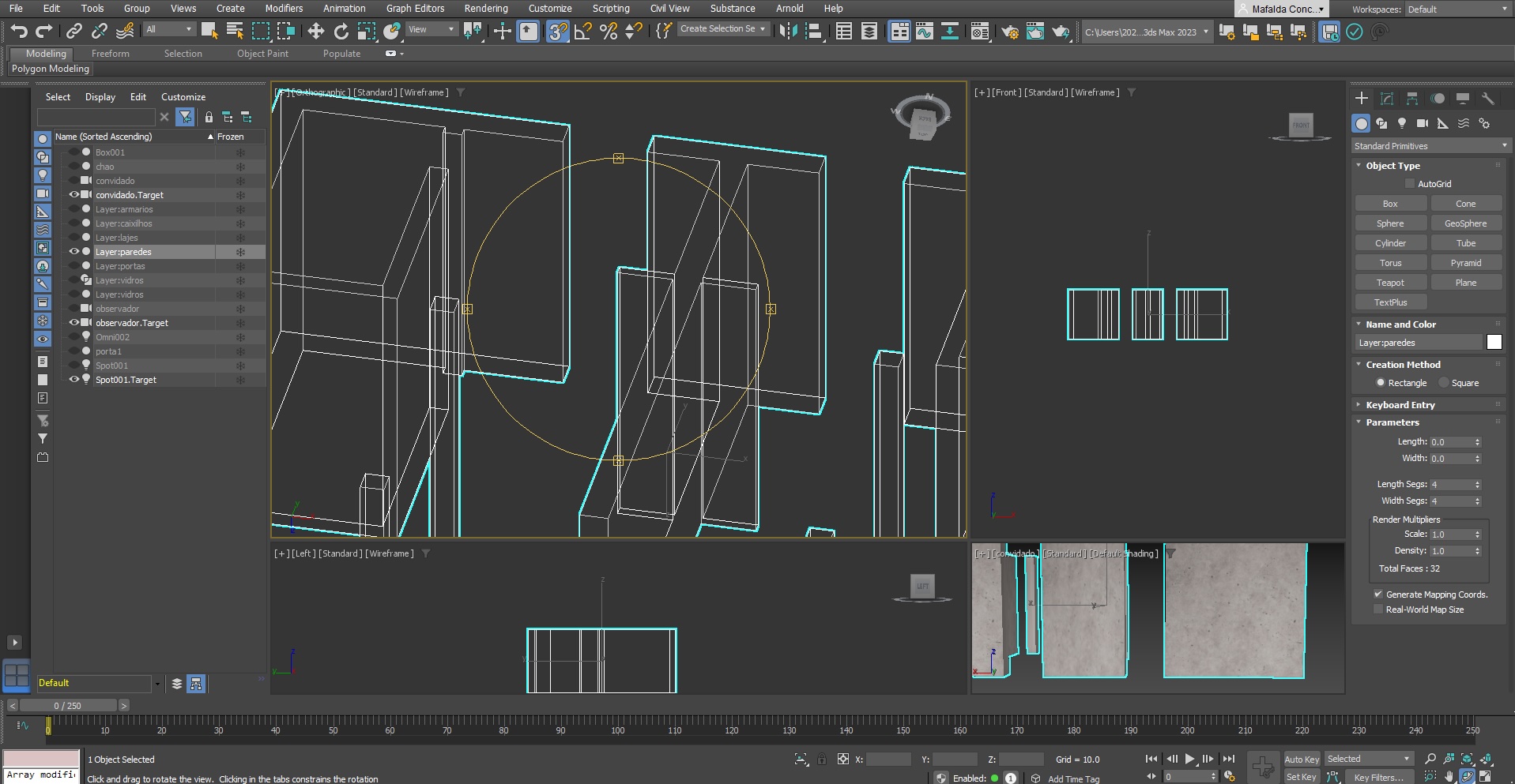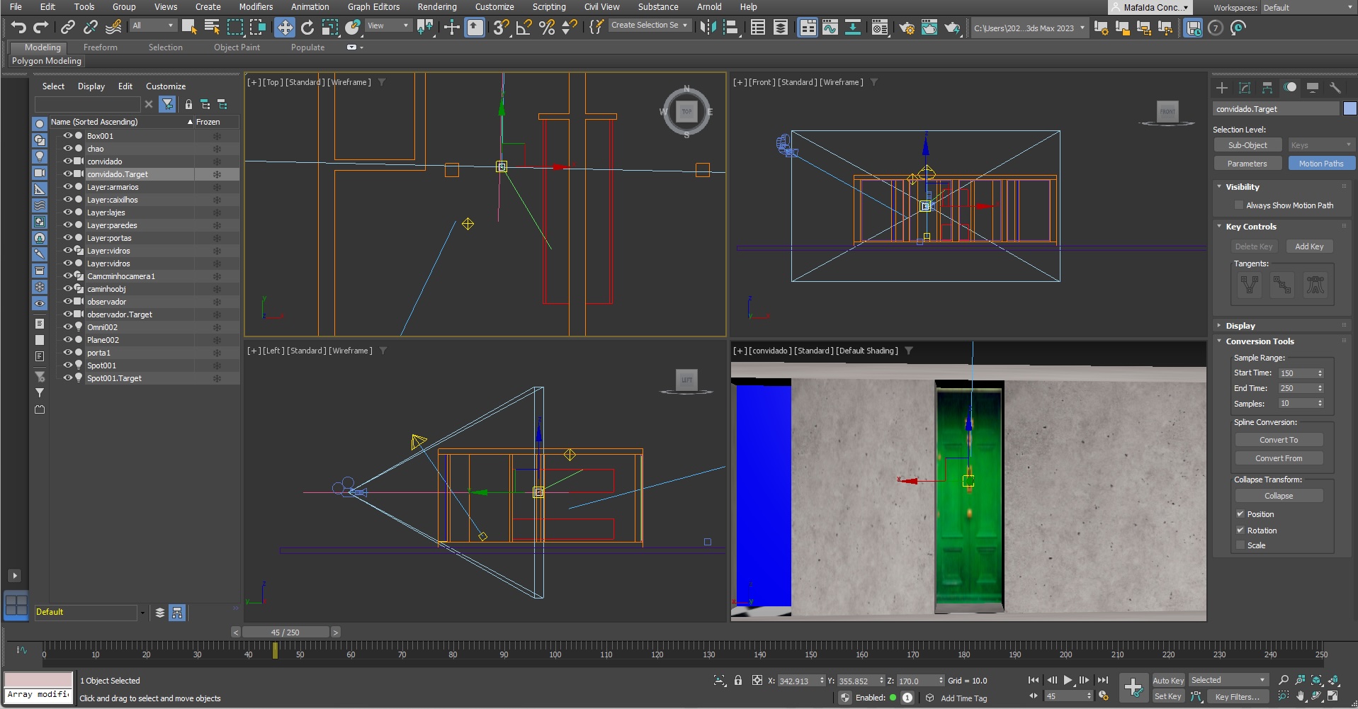 Reabertura do 3ds MAX. Criação e ajuste de uma nova luz Target Spot, para a projeção de uma pintura do Kandinsky na parede.