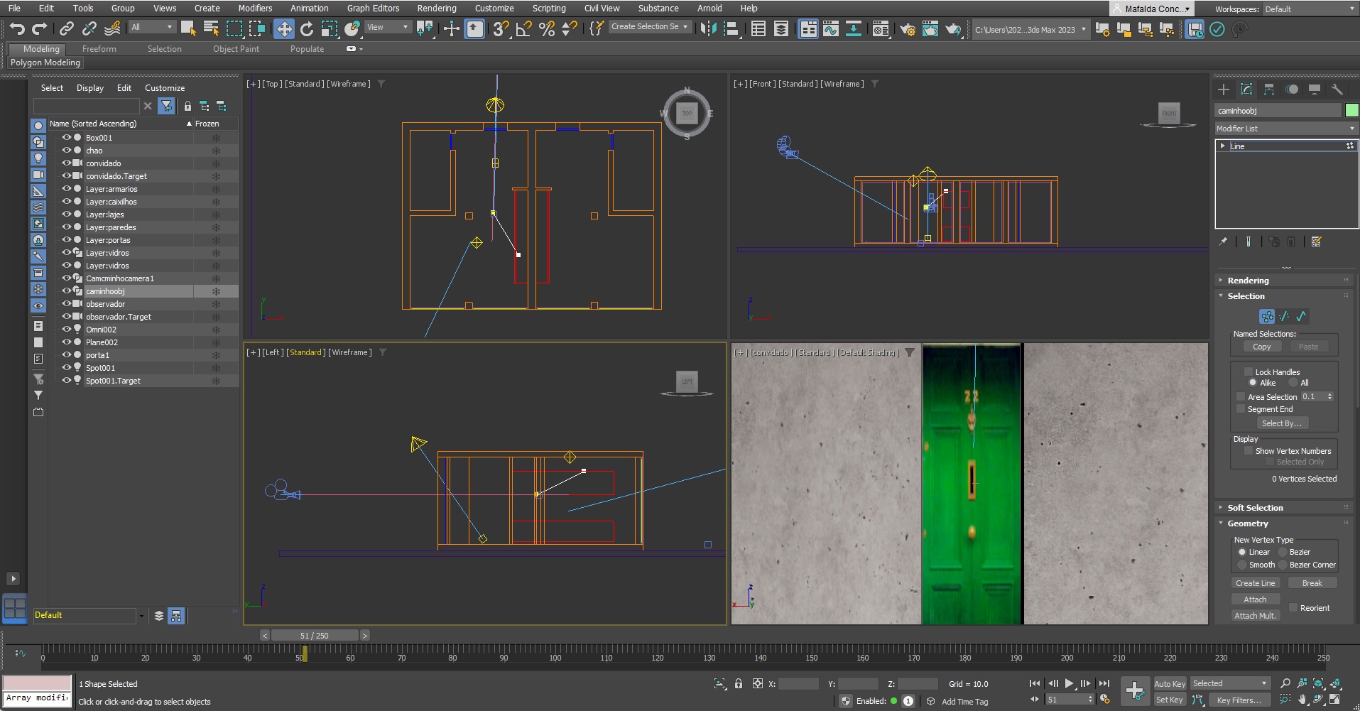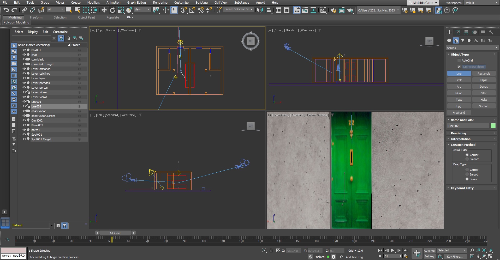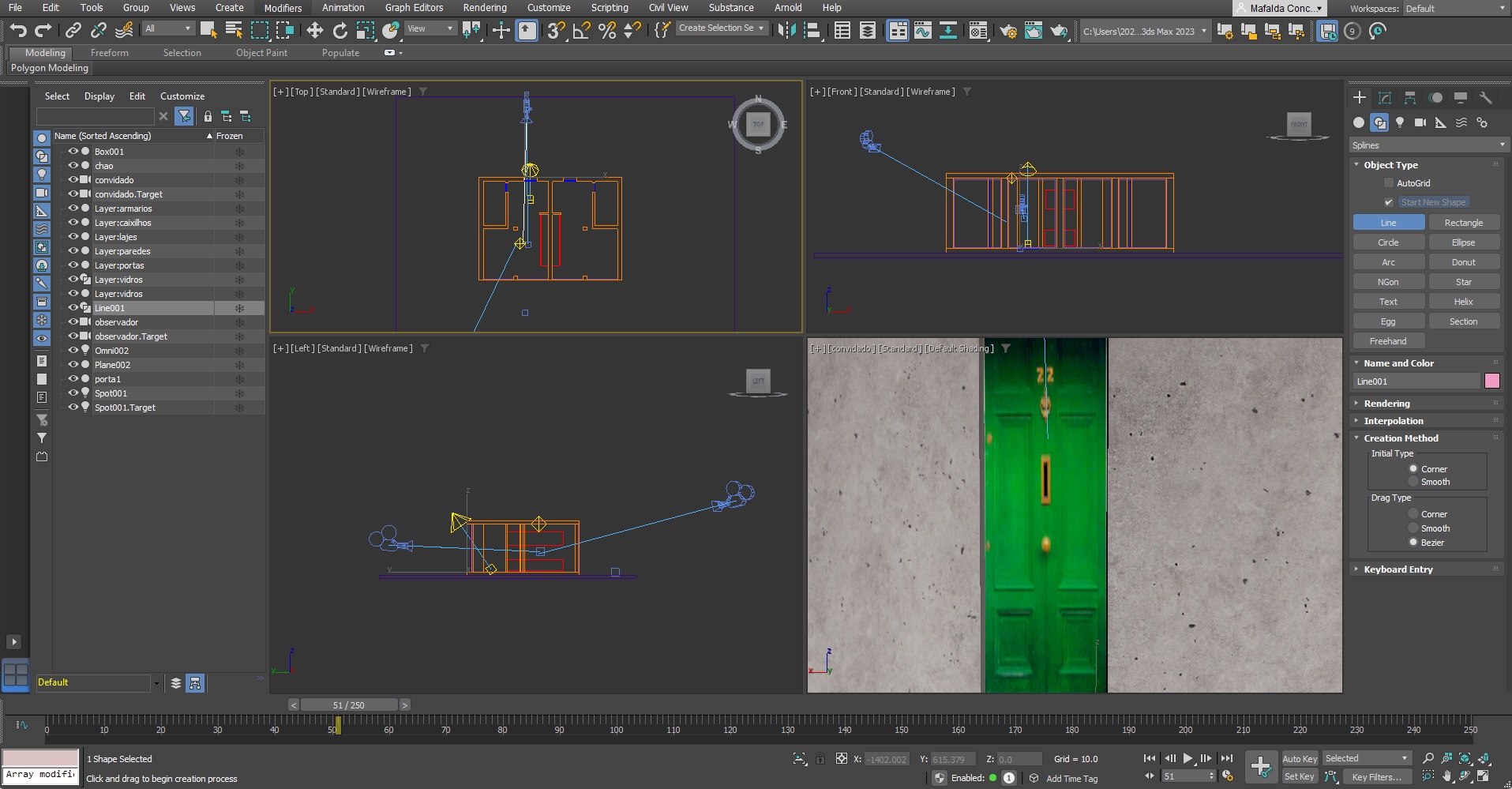 Criação de duas linhas que vão definir o percurso da animação da câmera "convidado". Mudança das suas coordenadas em z, que influenciam o olhar da câmera.