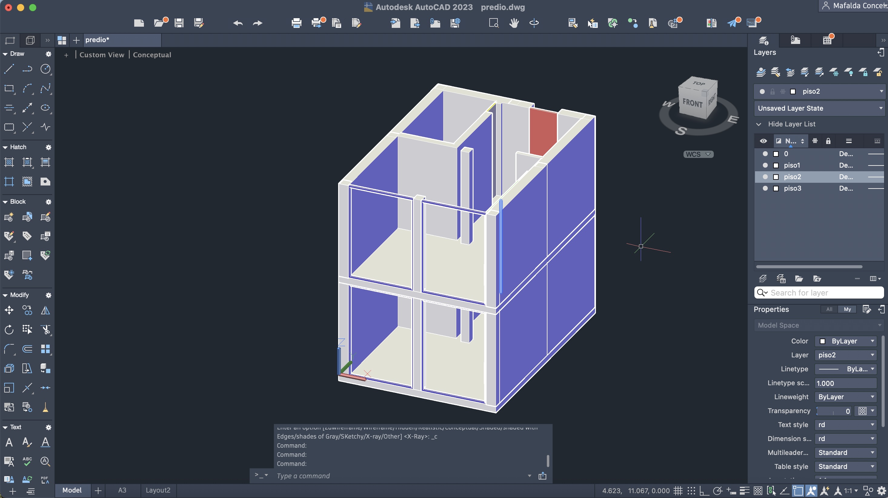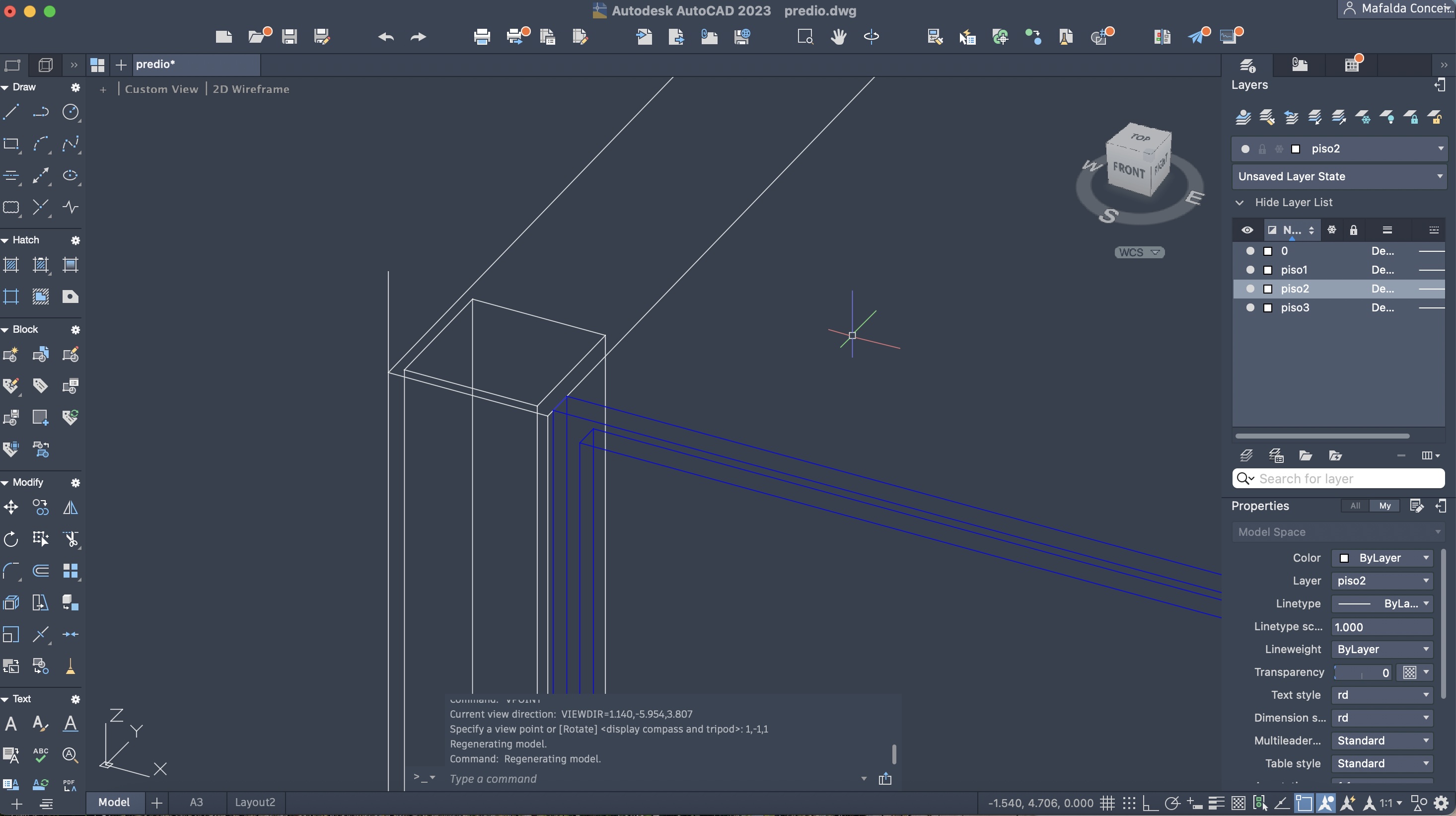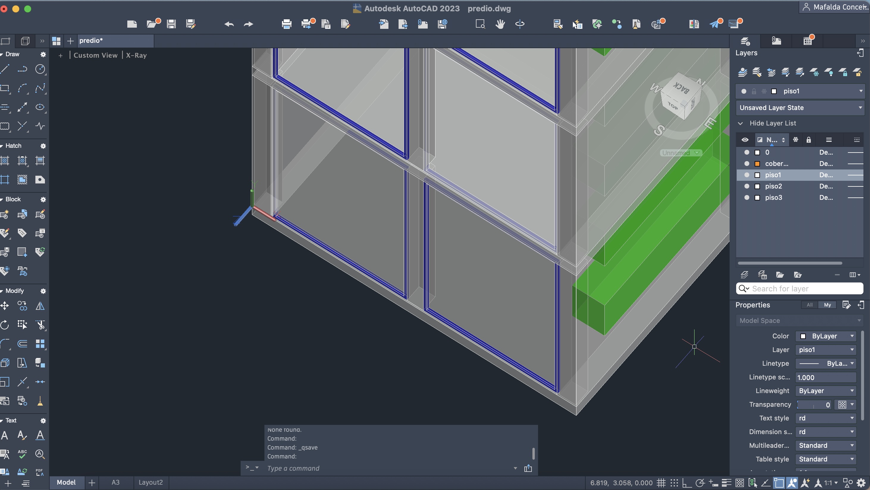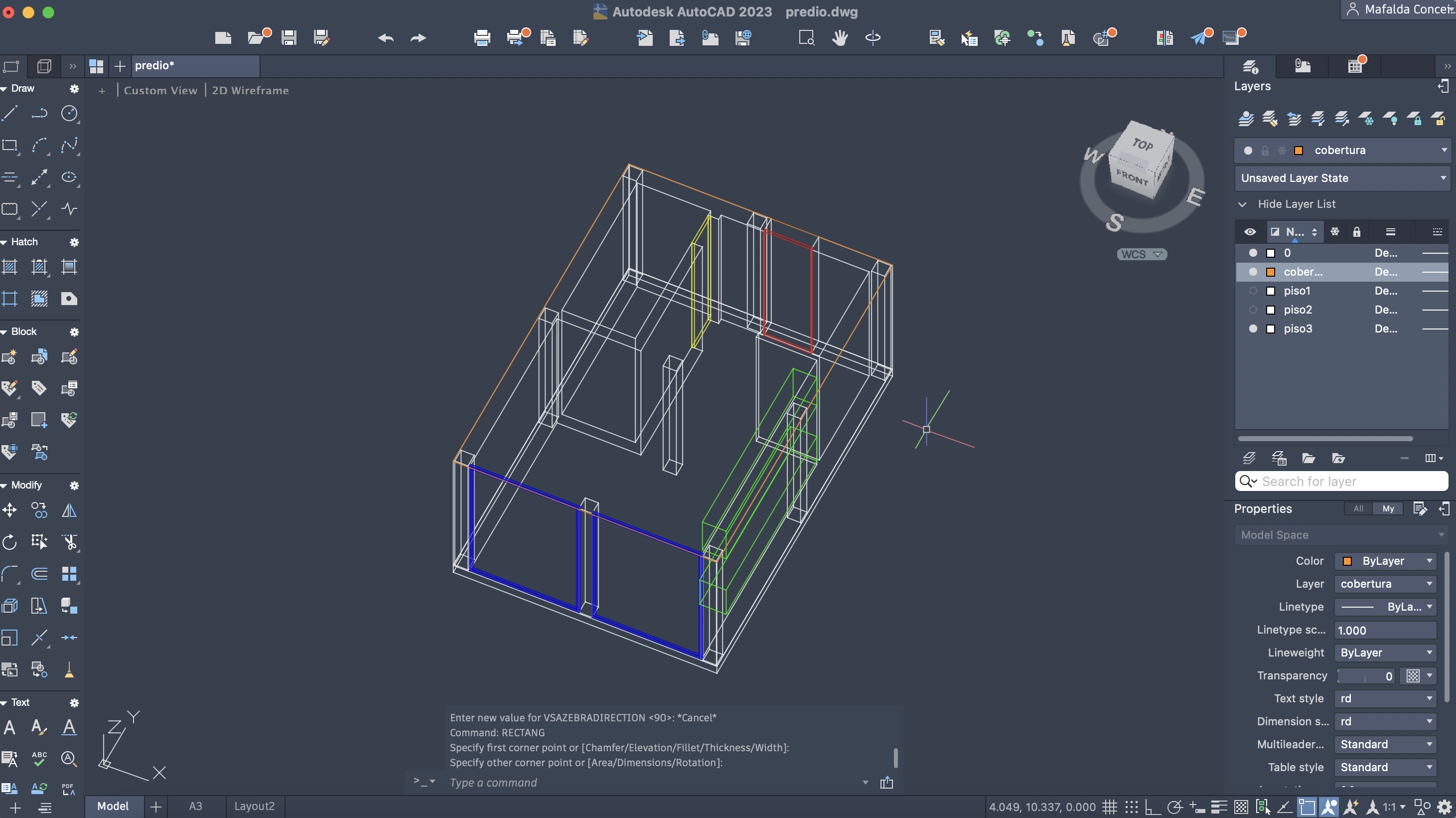 Criação de um novo ficheiro AutoCAD, para a execução de um prédio de três pisos (cada um numa layer diferente), através do comando anteriormente descarregado e utilizado: T0.