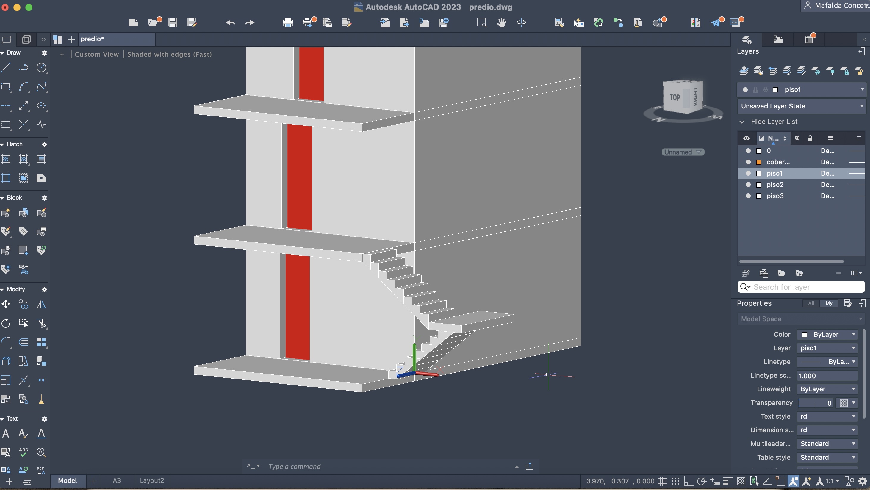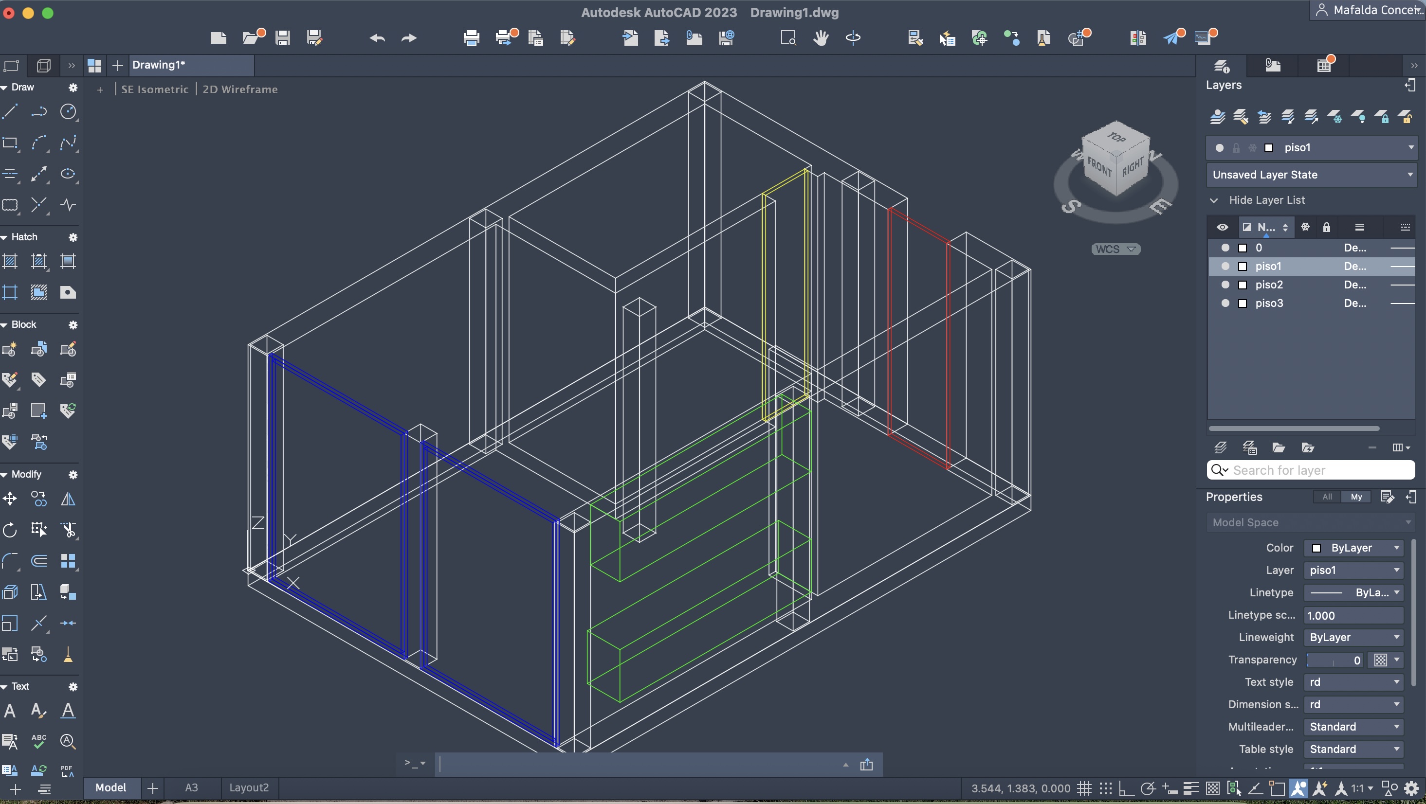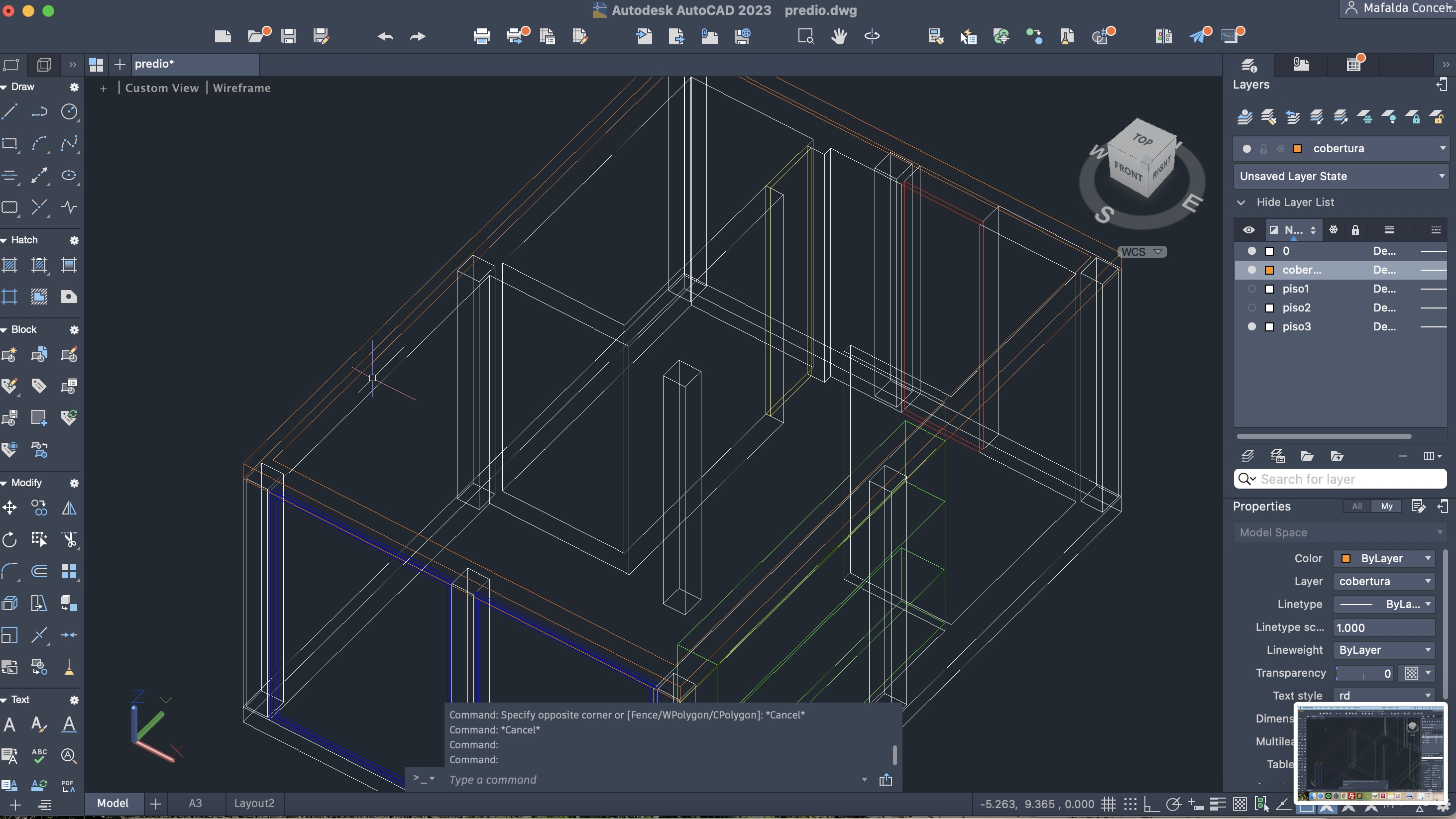 Criação de um novo ficheiro AutoCAD, para a execução de um prédio de três pisos (cada um numa layer diferente), através do comando anteriormente descarregado e utilizado: T0.