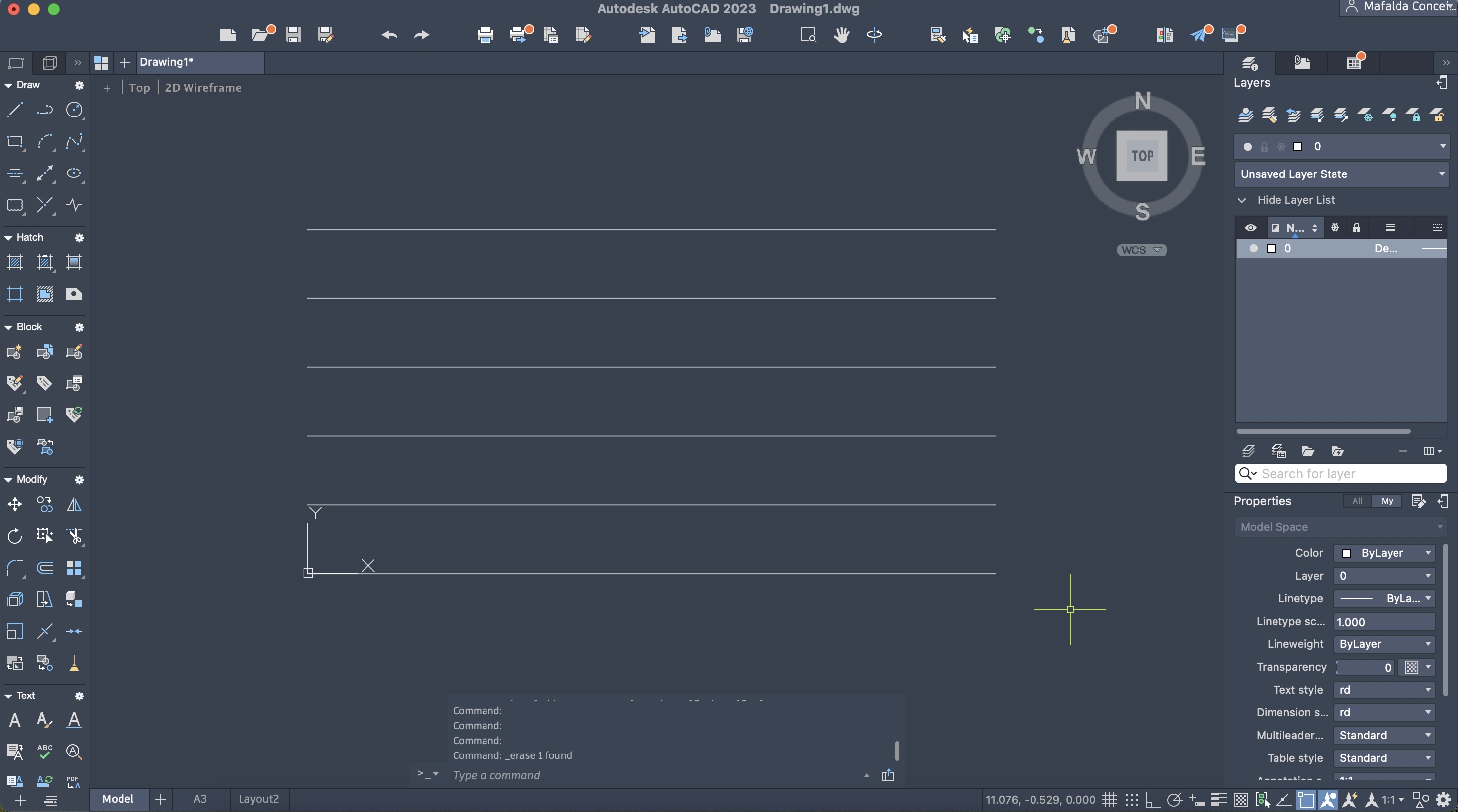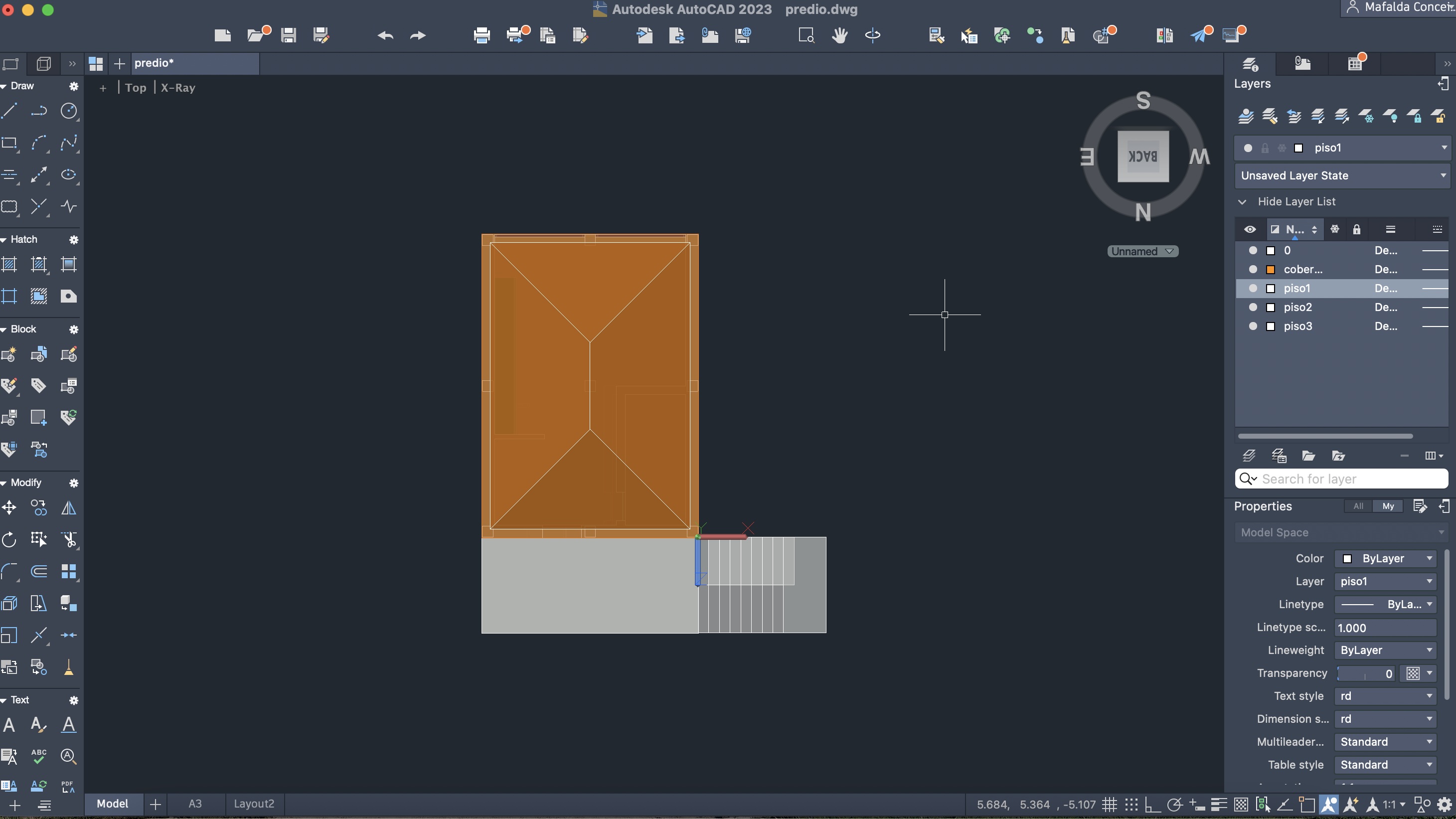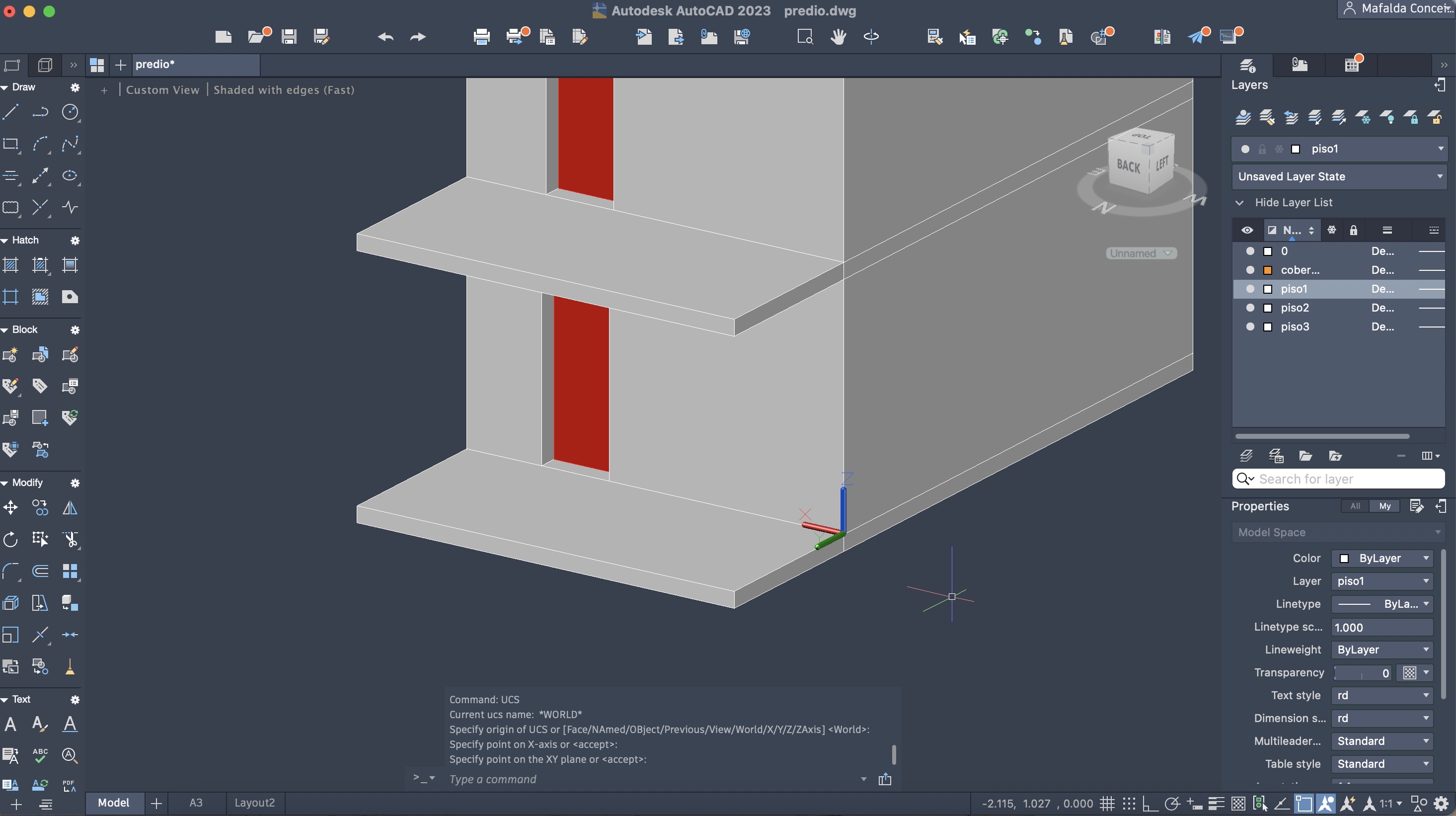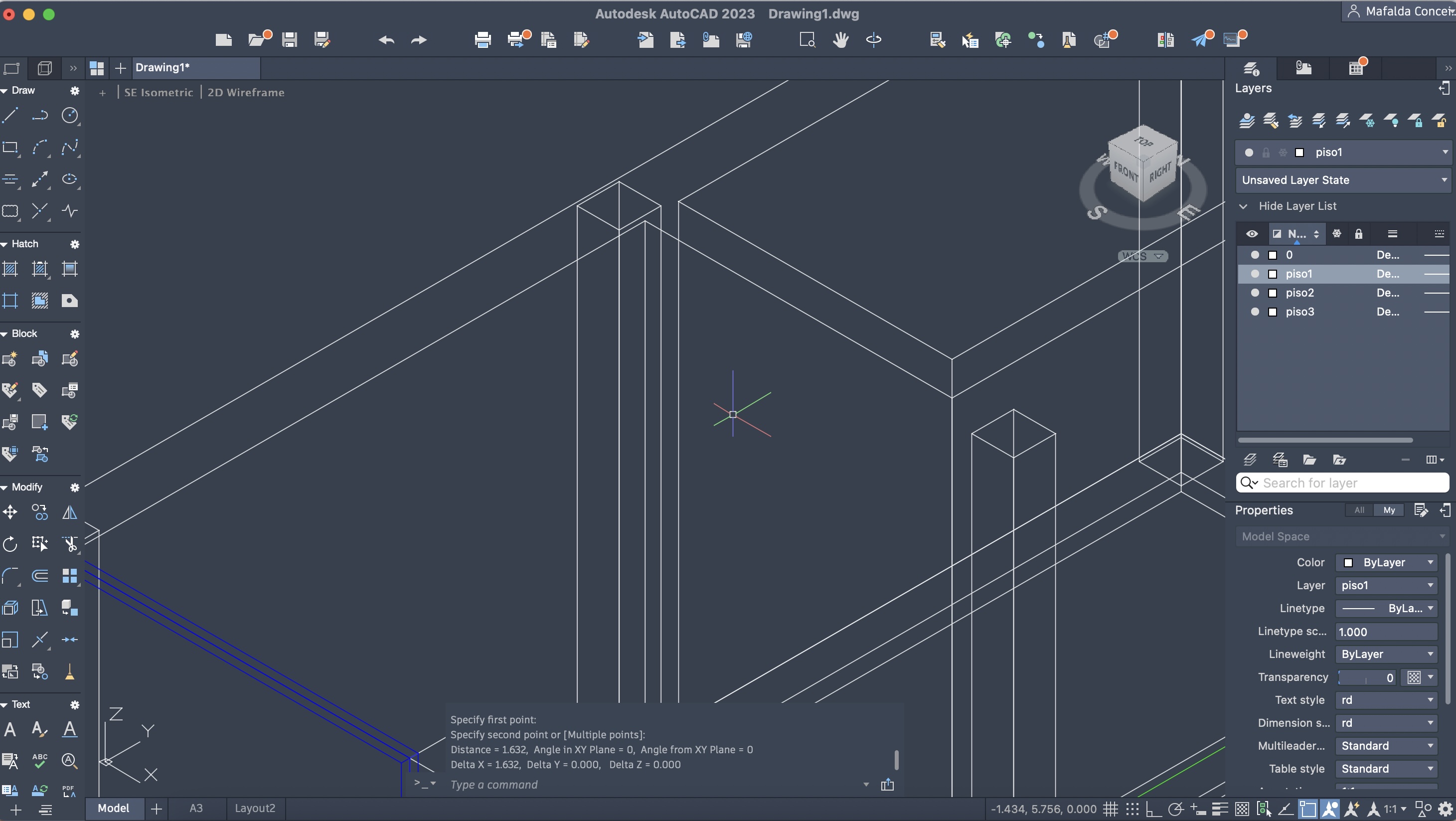 Criação de um novo ficheiro AutoCAD, para a execução de um prédio de três pisos (cada um numa layer diferente), através do comando anteriormente descarregado e utilizado: T0.