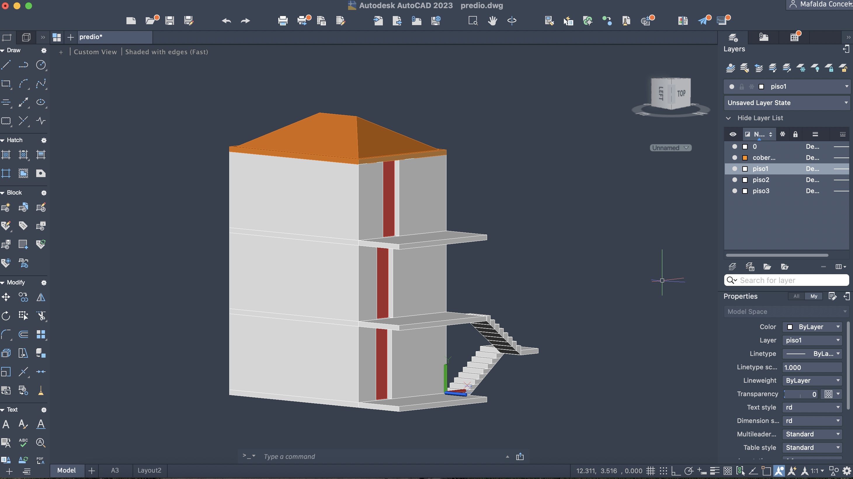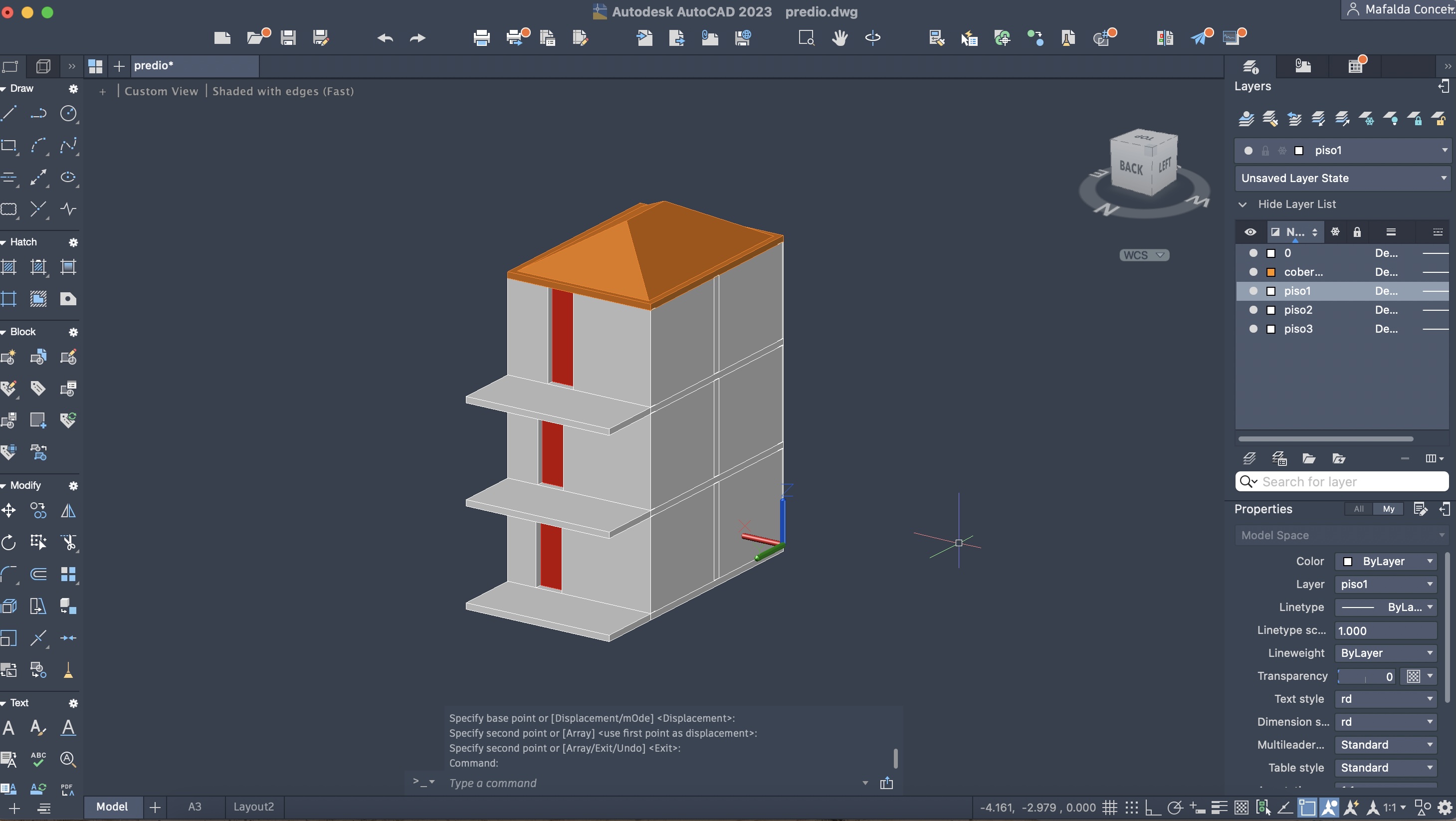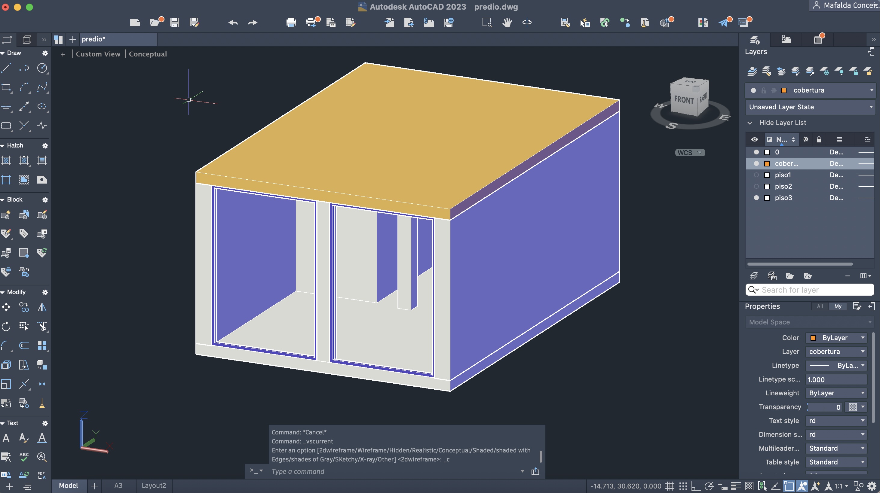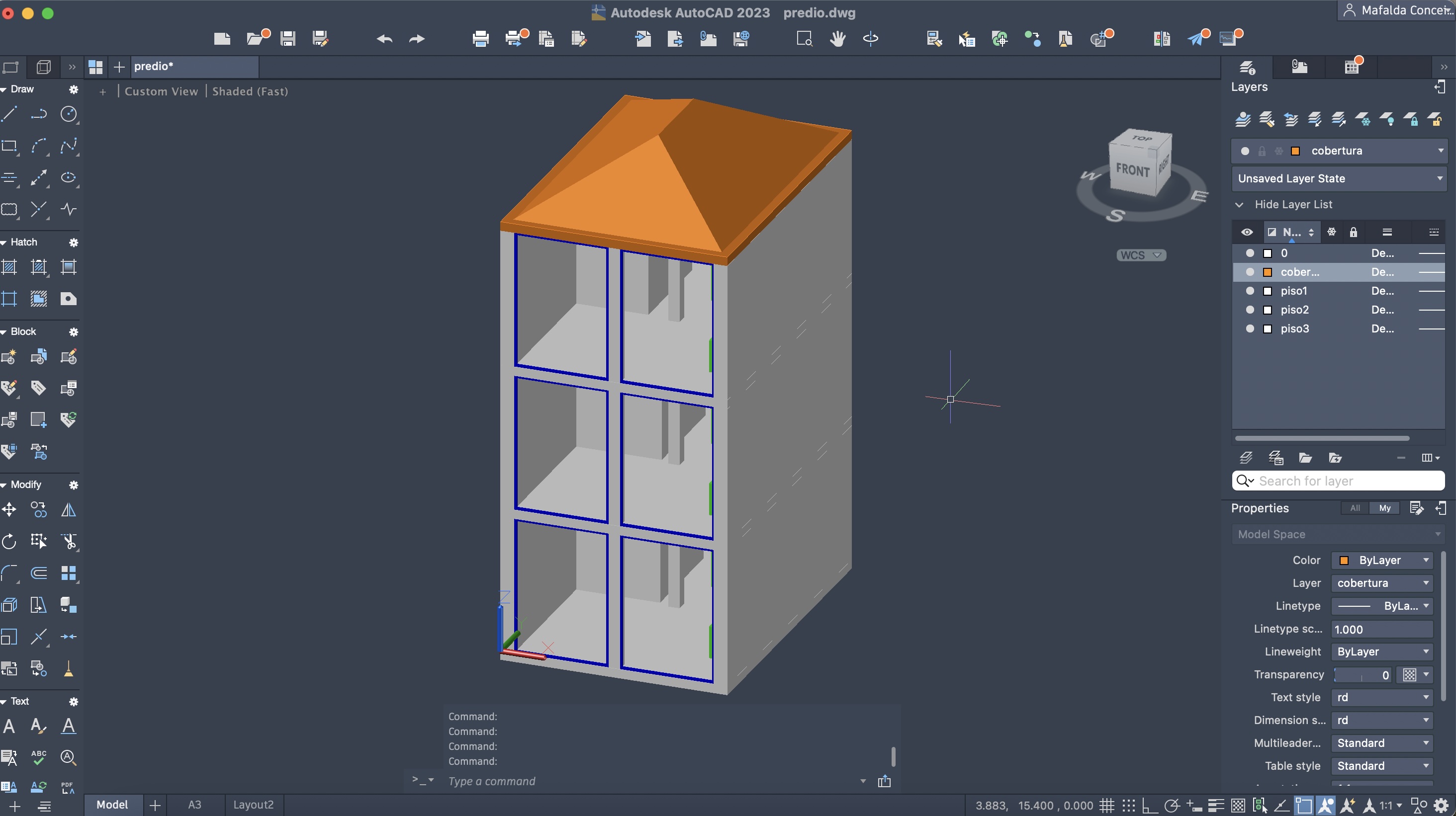 Colocação de uma cobertura inclinada no prédio, com ajuda dos comandos: RECTANGLE, EXTRUDE e OFFSET.