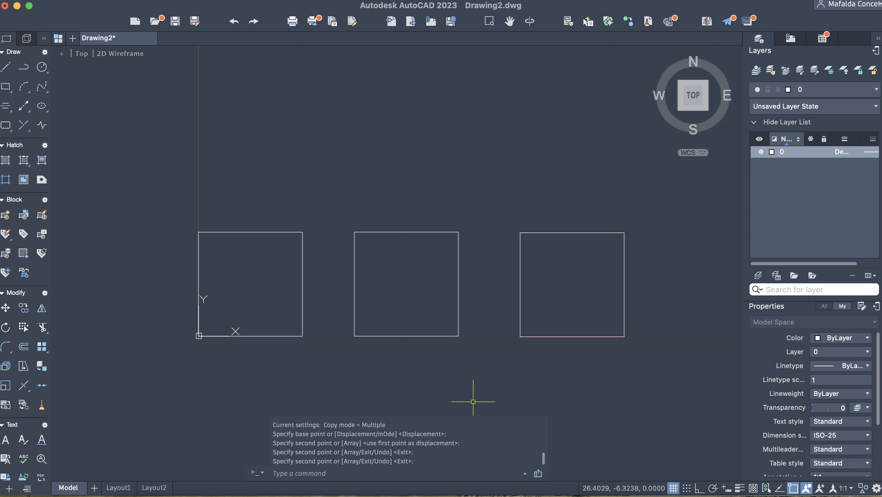 Criação de três quadrados, com auxílio dos comandos: RECTANGLE e COPY.