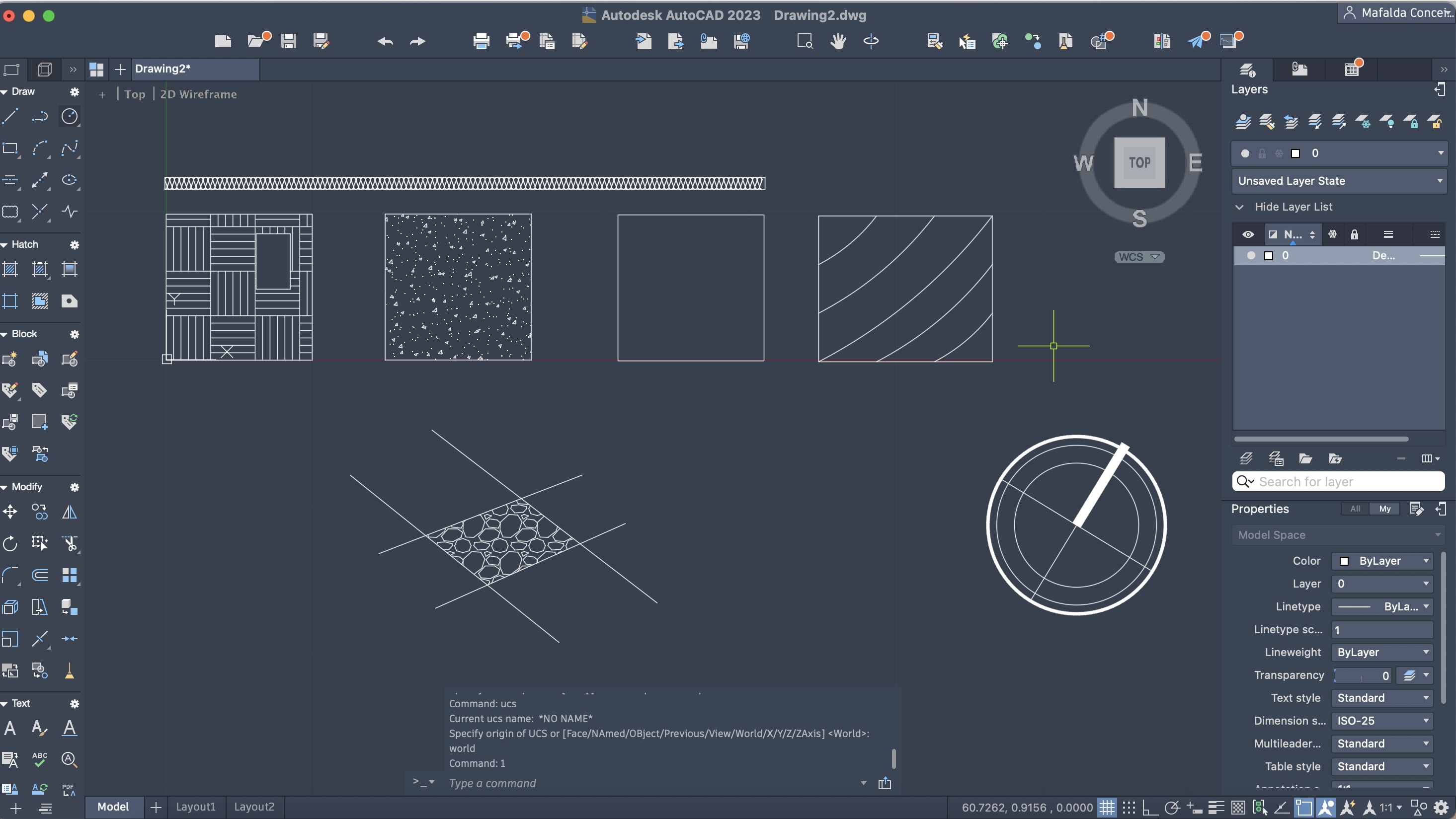 Criação de um retângulo no primeiro, e colocação de um preenchimento no segundo, através dos comandos: RECTANGLE e HATCH.
