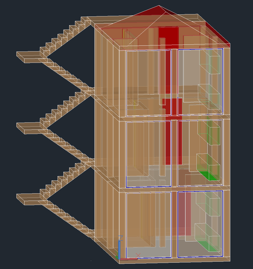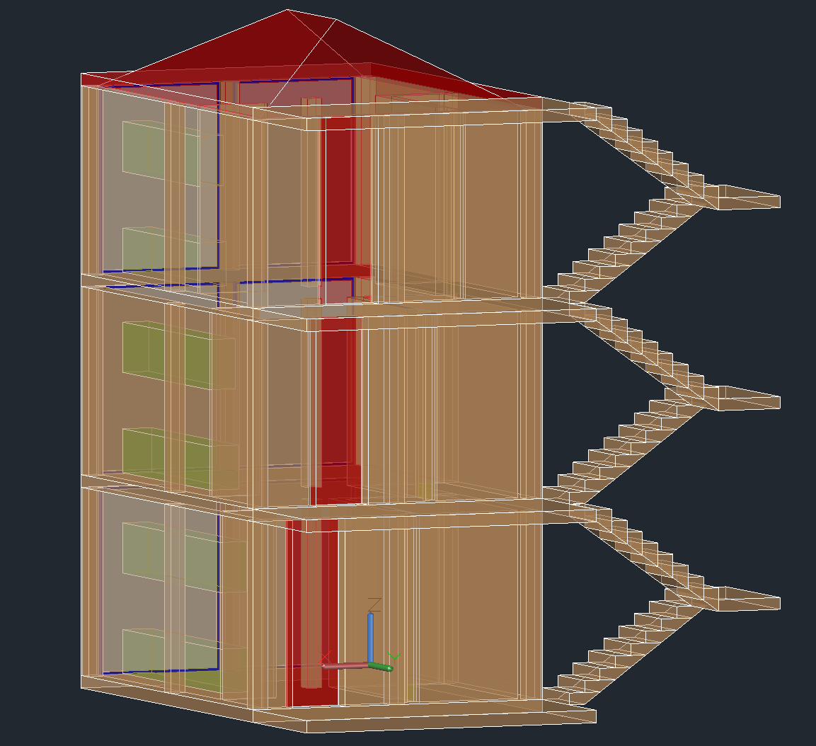 Construção de um modelo tridimensional que reproduz um edifício composto por três frações T0, com recurso ao comando personalizado usado previamente que gera unidades T0, bem como a modelação da sua respetiva cobertura, por meio da adição de uma laje de cobertura e do comando EXTRUDE, de seguida houve a necessidade de atender aos requisitos das acessibilades, com a definição de uma caixa de escadas, através inicialmente da elaboração de uma laje de fundação que atende ao piso térreo e outras duas lajes para os restantes pisos por meio dos comandos RECTANGLE e EXTRUDE, bem como para gerar as respetivas escadas foi usado um comando personalizado, por fim desenvolveu-se as superfícies envidraçadas, através dos comando RECTANGLE, REGION e CONVTOSURFACE, para depois a sua aplicação nas restantes caixilharias das frações do edifício, através do comando COPY, o que completa a aparência da fachada.