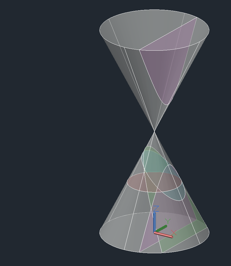 Construção de um sólido cónico com várias superfícies dentro (hipérbole, parábula, círculo e elipse).