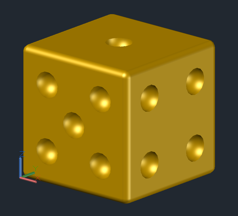 Execução de um dado com o apoio de um cubo e uma série de esferas que subtraídas ao volume cúbico, através do comando SUBTRACT, atribuem ao cubo a aparência de um dado, depois segue-se a suavização das arestas do volume resultante com o uso do comando FILLET.