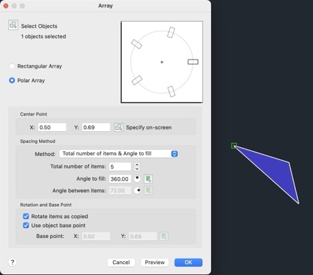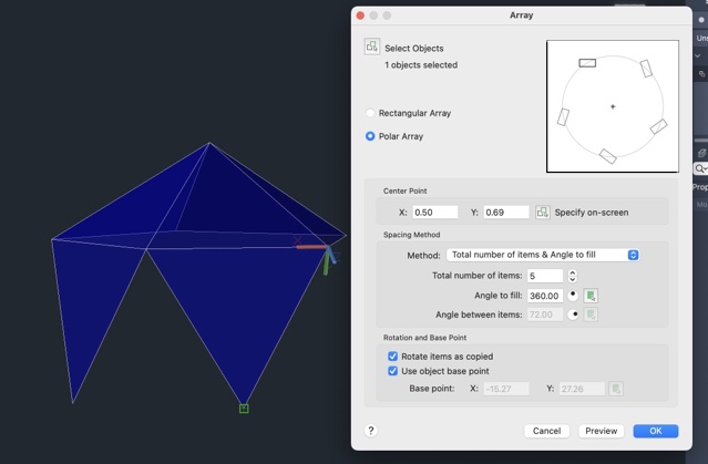 Metendo o UCS no centro do pentágono, seguindo o mesmo processo de elementos auxiliares, e do Arrayclassic