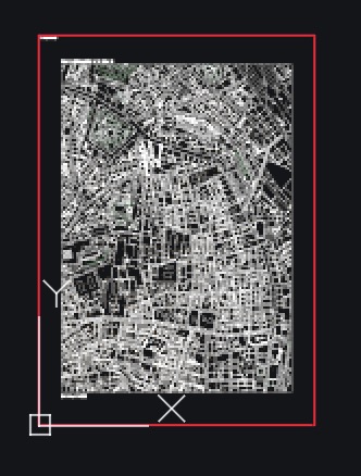 Assim que a imagem é importada para o AutoCAD, redimensiona-se para uma folha A0, recorrendo ao command: RECT. Depois, utiliza-se o command: SCALE> all> r> l, identificando o ponto de base e a referência, para redimensionar a imagem dentro da folha A0 desenhada.