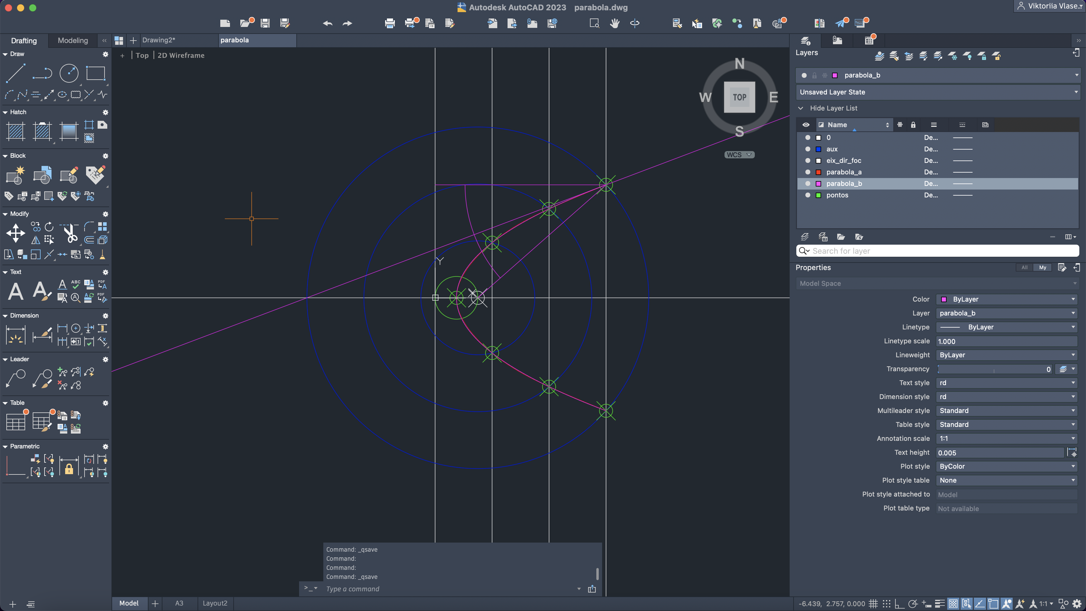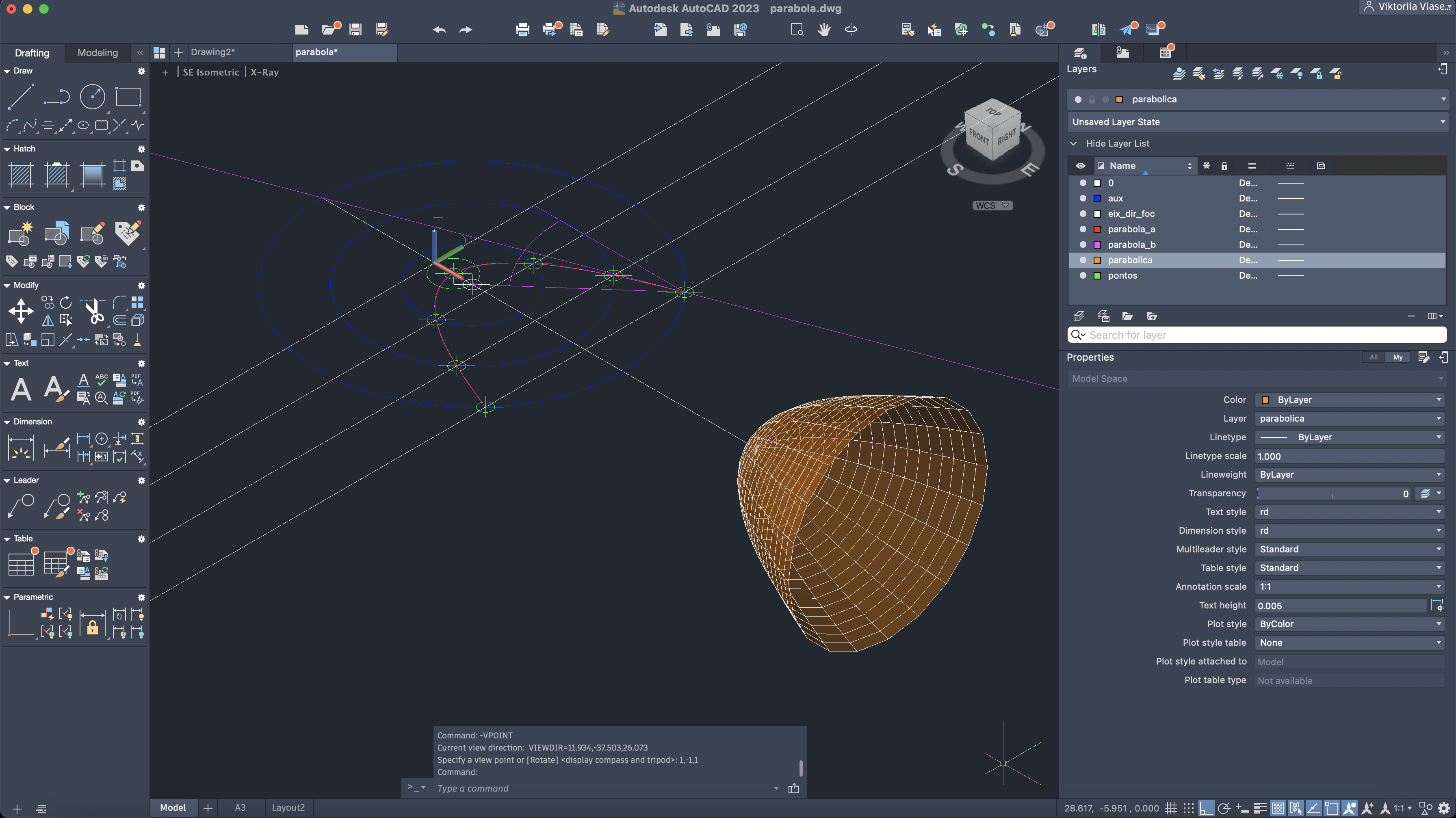 Criação da segunda parábola, mais rigorosa, através dos comandos: LINE, CIRCLE, TRIM, XLINE, SPLINE e COPY.