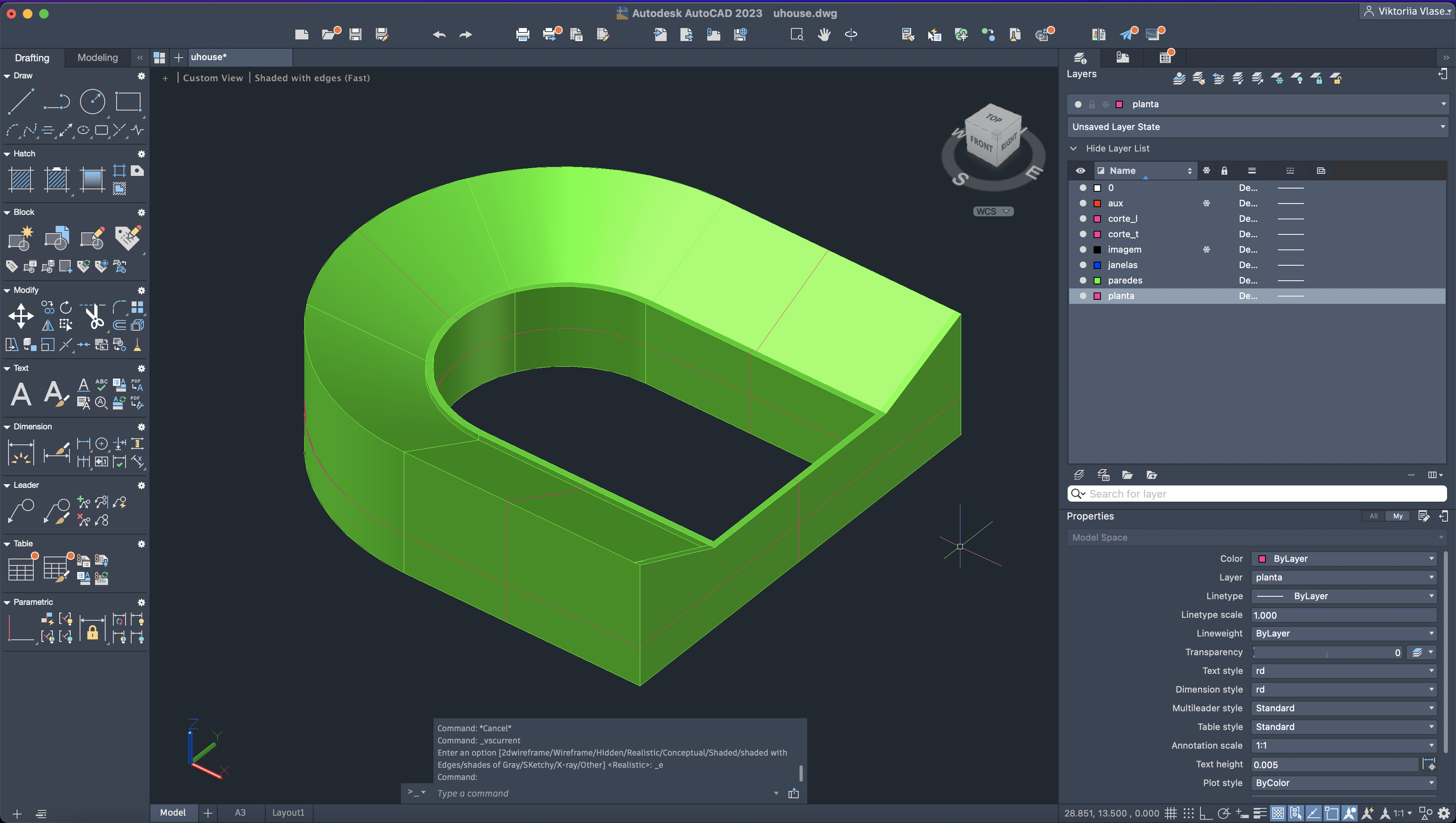 Através da forma da base e de um perfil, criação do formato da casa e fechamento, com a utilização dos comandos: -VPOINT, MOVE, ROTATE, UCS e EXTRUDE.