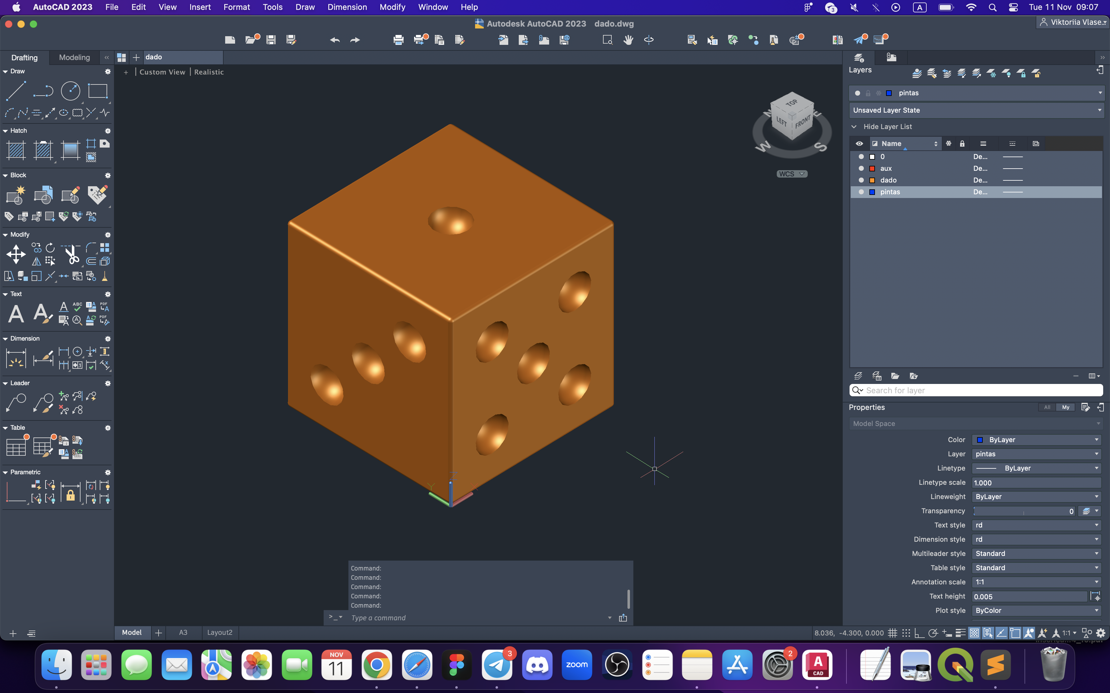 Criação da layer "pintas". Colocação de esferas na grelha da base, de forma a fazer o lado de um dado com seis pintas. Depois, cópia e colocação das mesmas nas outras faces do cubo, segundo a planificação de um dado, através dos comandos: SPHERE, COPY e ALIGN.