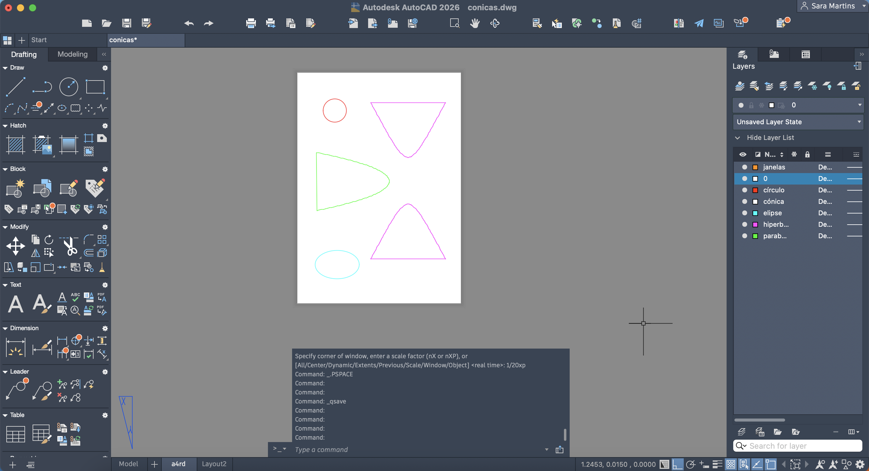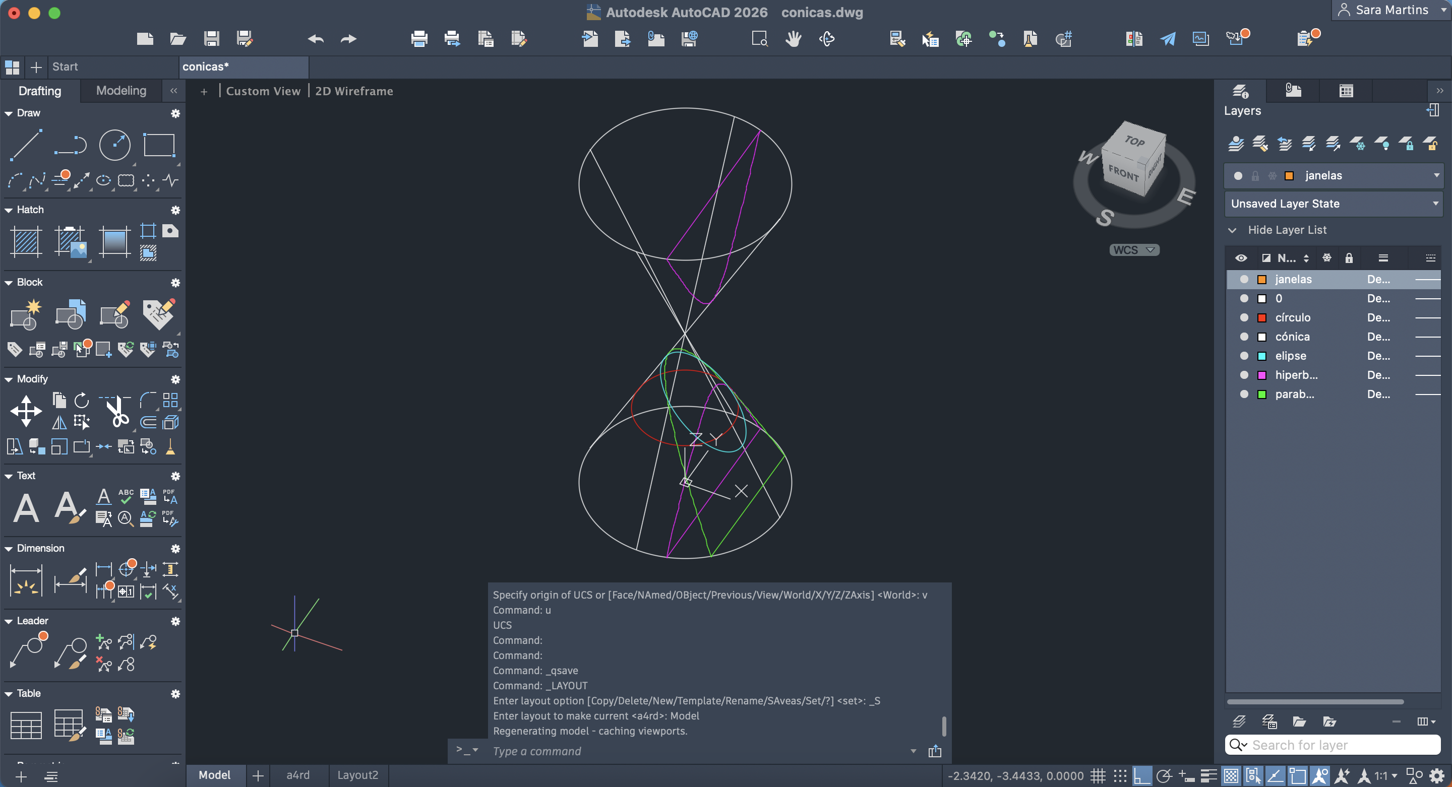 Avançámos com com os vários cortes da figura conica. Para além do circulo, fizemos a elipse a hiperbole e a parabola.